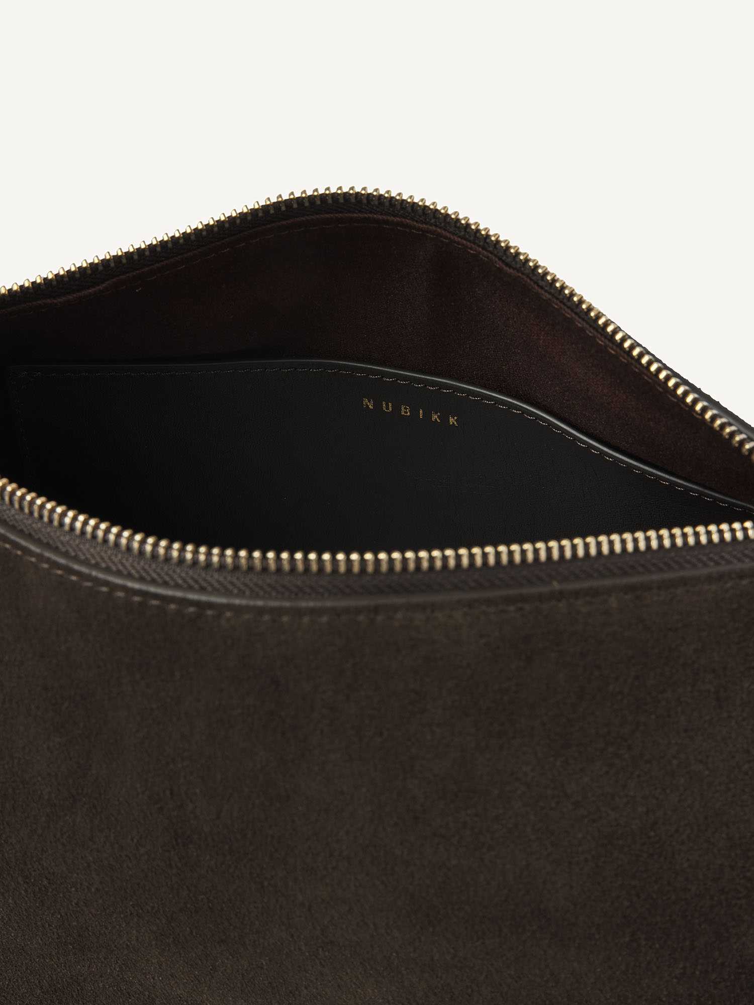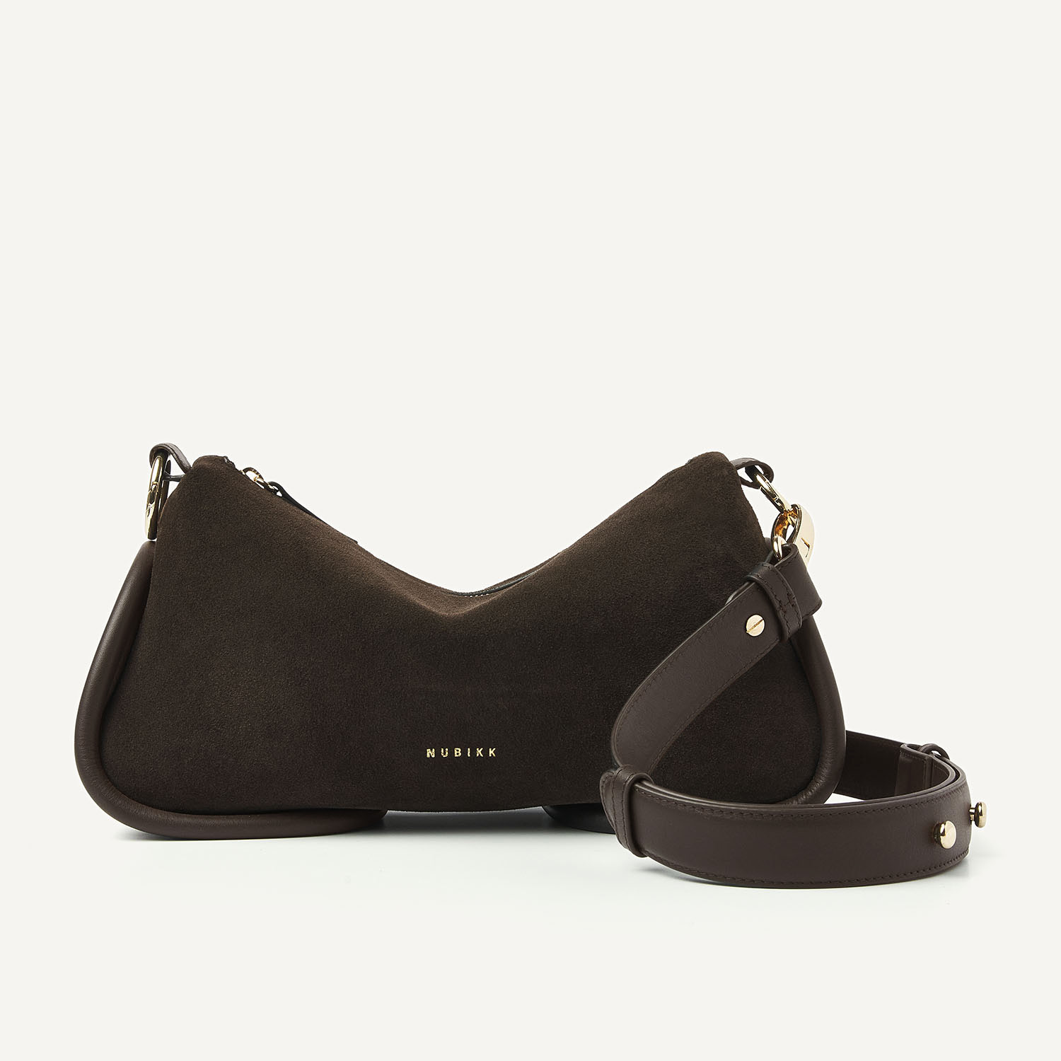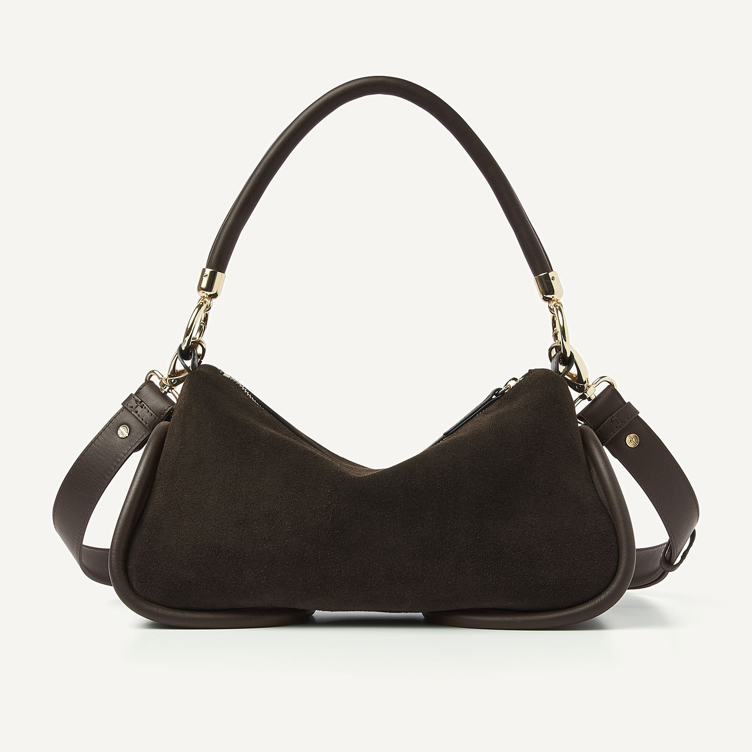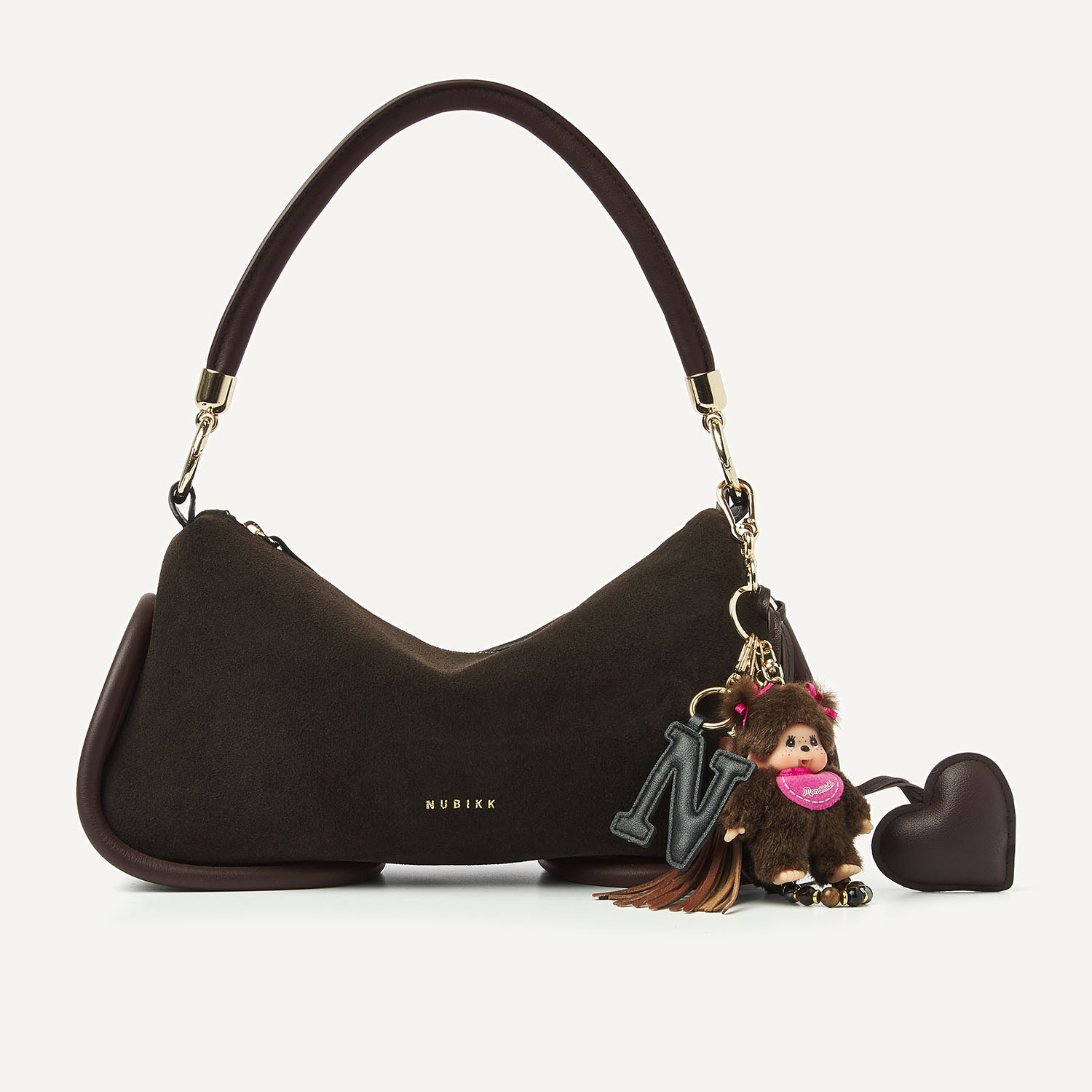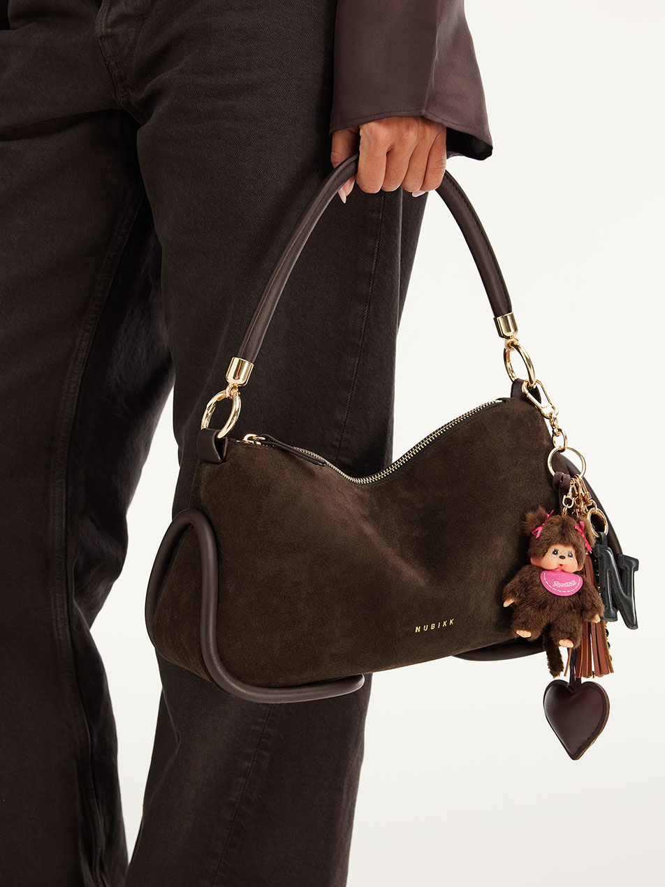 The Bibi Bag in dark brown is a combination of supple suede and leather “tubes.” The suede feels luxurious and moves fluidly, while the platinum hardware and leather tubes add refinement to the bag. With two detachable handles and an interior pocket, this bag effortlessly combines elegance and functionality. The Monchhichi bag charm is not included, but available separately!