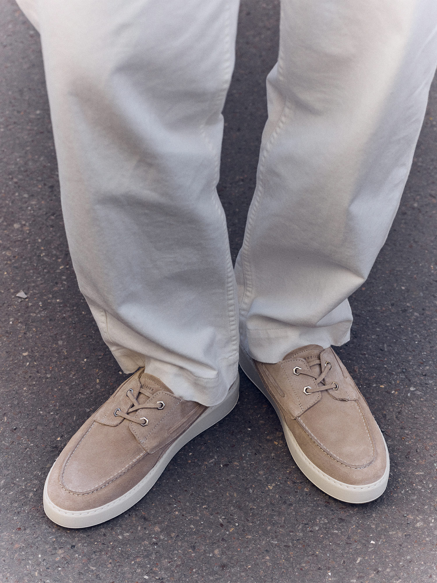 Fresh and versatile suede in a soft beige shade. The lace running through the upper refers to the classic boat shoe. The Jiro sole gives the design a sporty look and comfortable feel. The burned olive detail in the outsole adds a subtle accent. Comes with an extra square cotton lace.