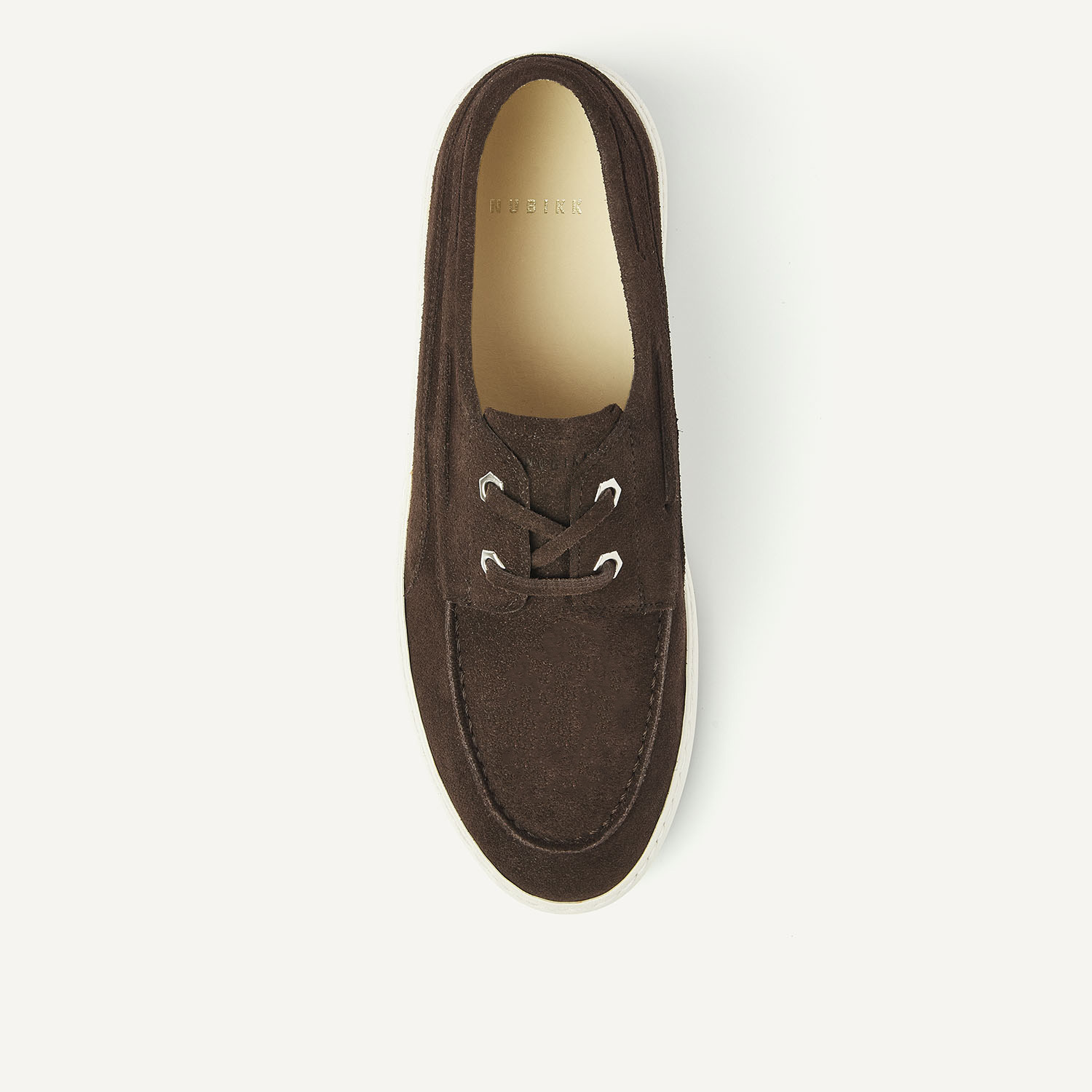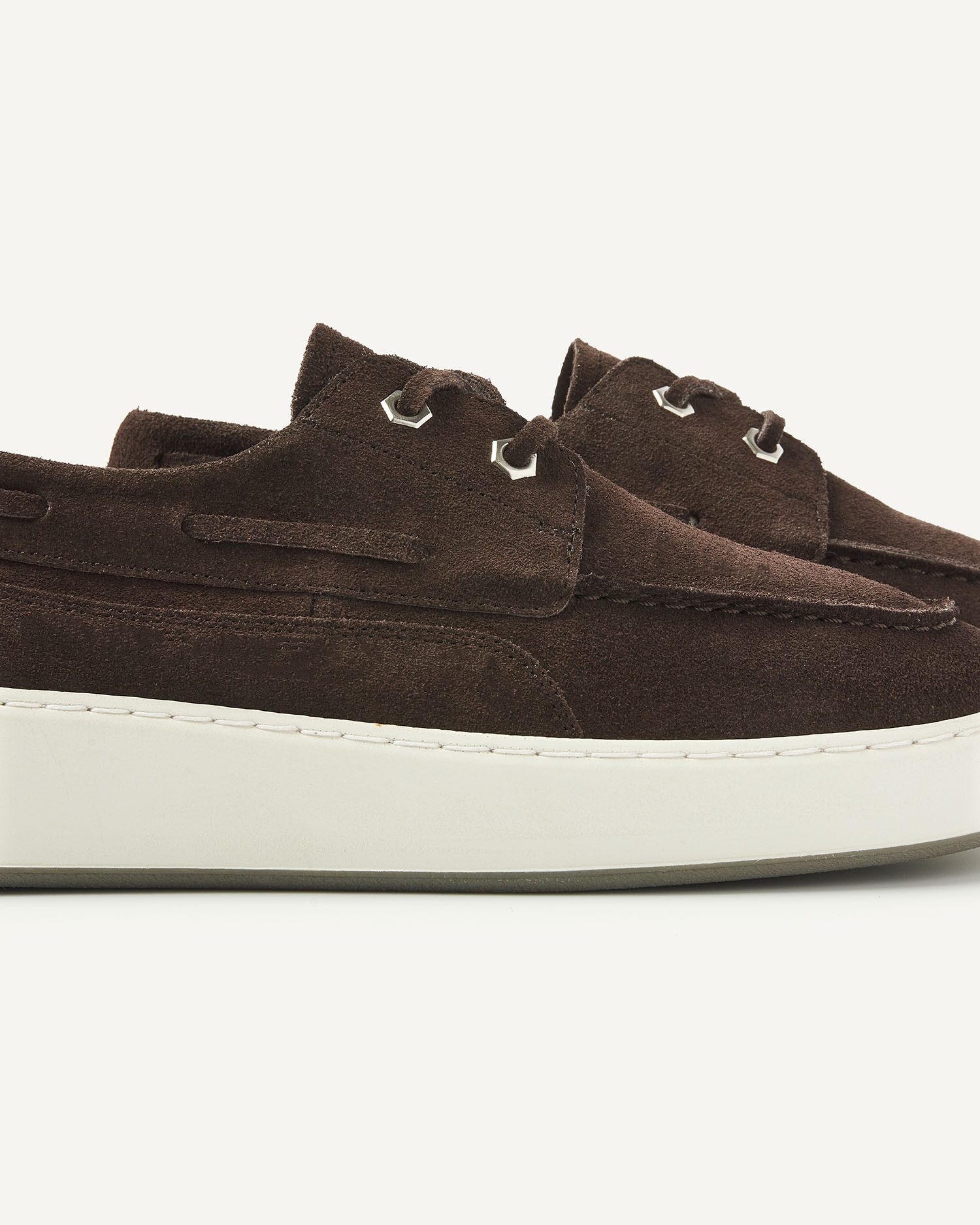 The Jiro Yacht in dark brown suede combines a rugged look with everyday comfort. The boat-inspired design with wraparound lacing meets the relaxed style of a loafer. The Jiro sole provides a sporty appearance and a lightweight feel. The burned olive outsole adds a modern finishing touch. Includes an extra square cotton lace.