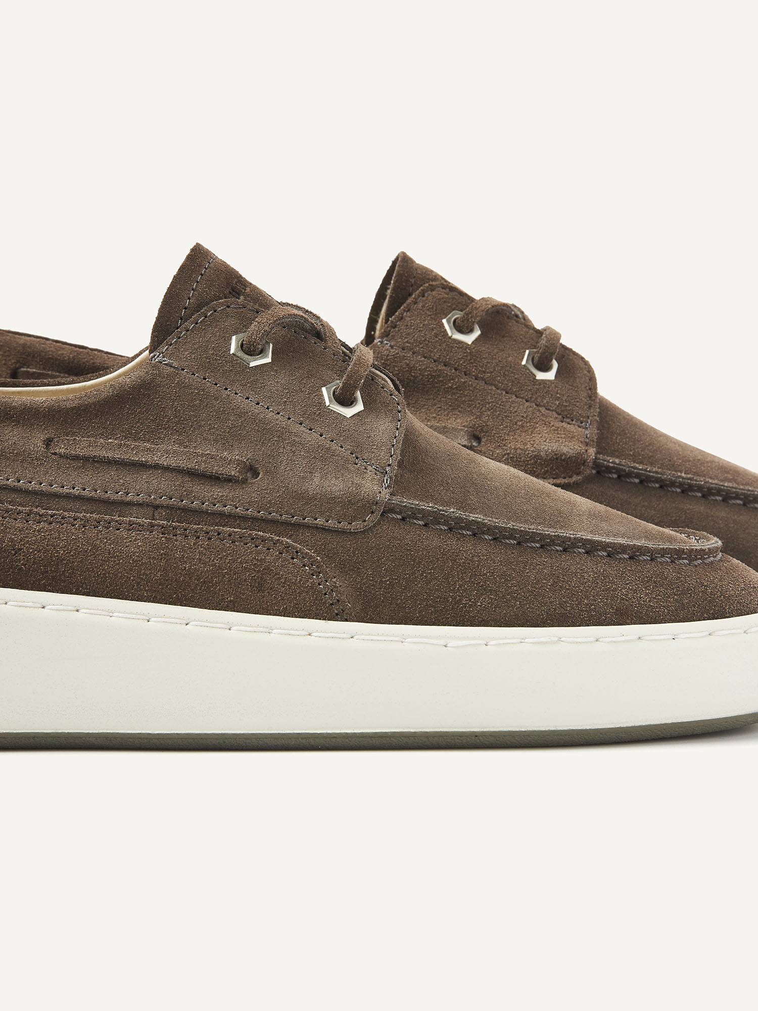 The Jiro Yacht in grey suede combines a rugged look with everyday comfort. Its boat-inspired design with the wrap-around lacing meets the relaxed style of a loafer. The Jiro sole offers a sporty appearance and a lightweight feel. The burned olive outsole detail adds a modern finishing touch. Includes an extra square cotton lace.