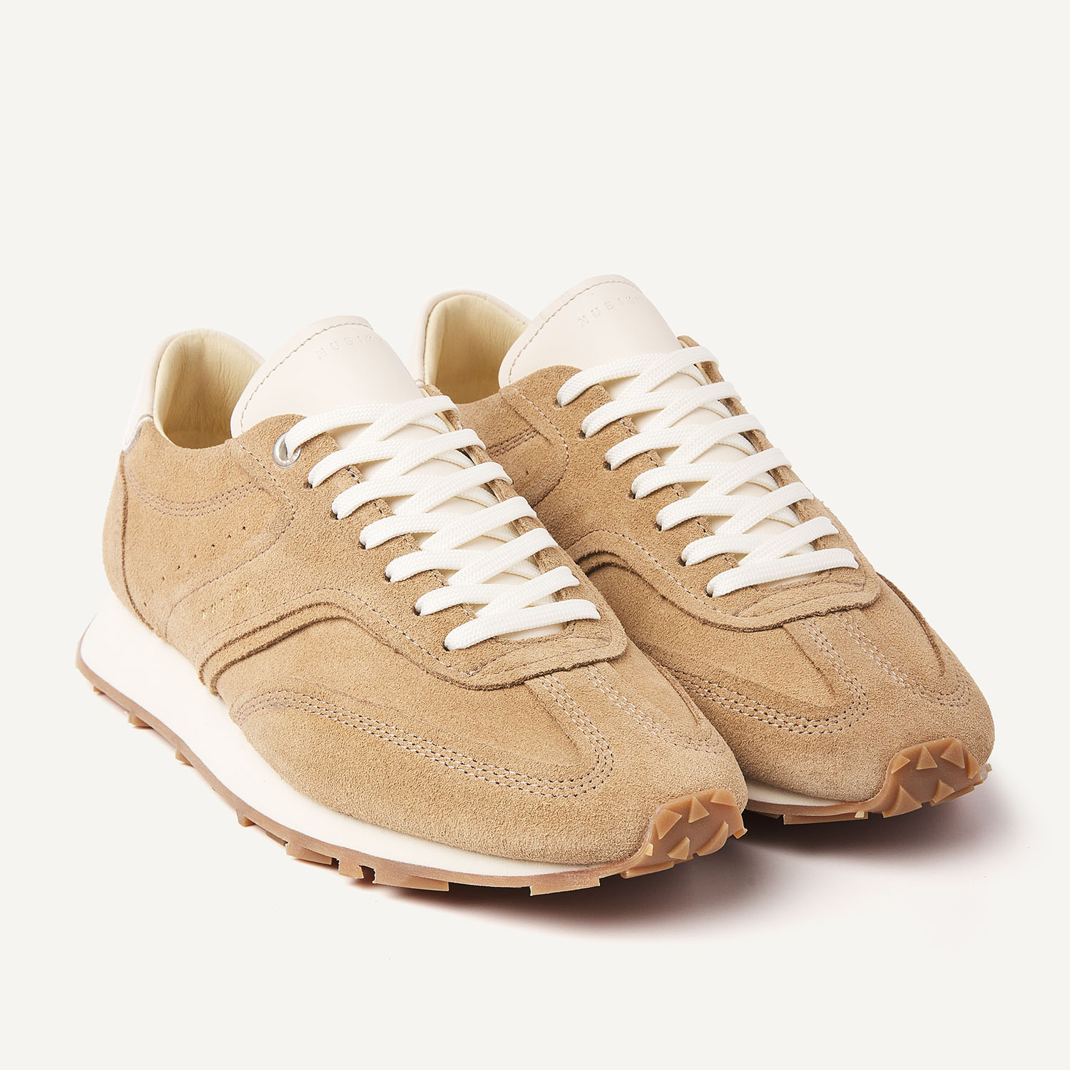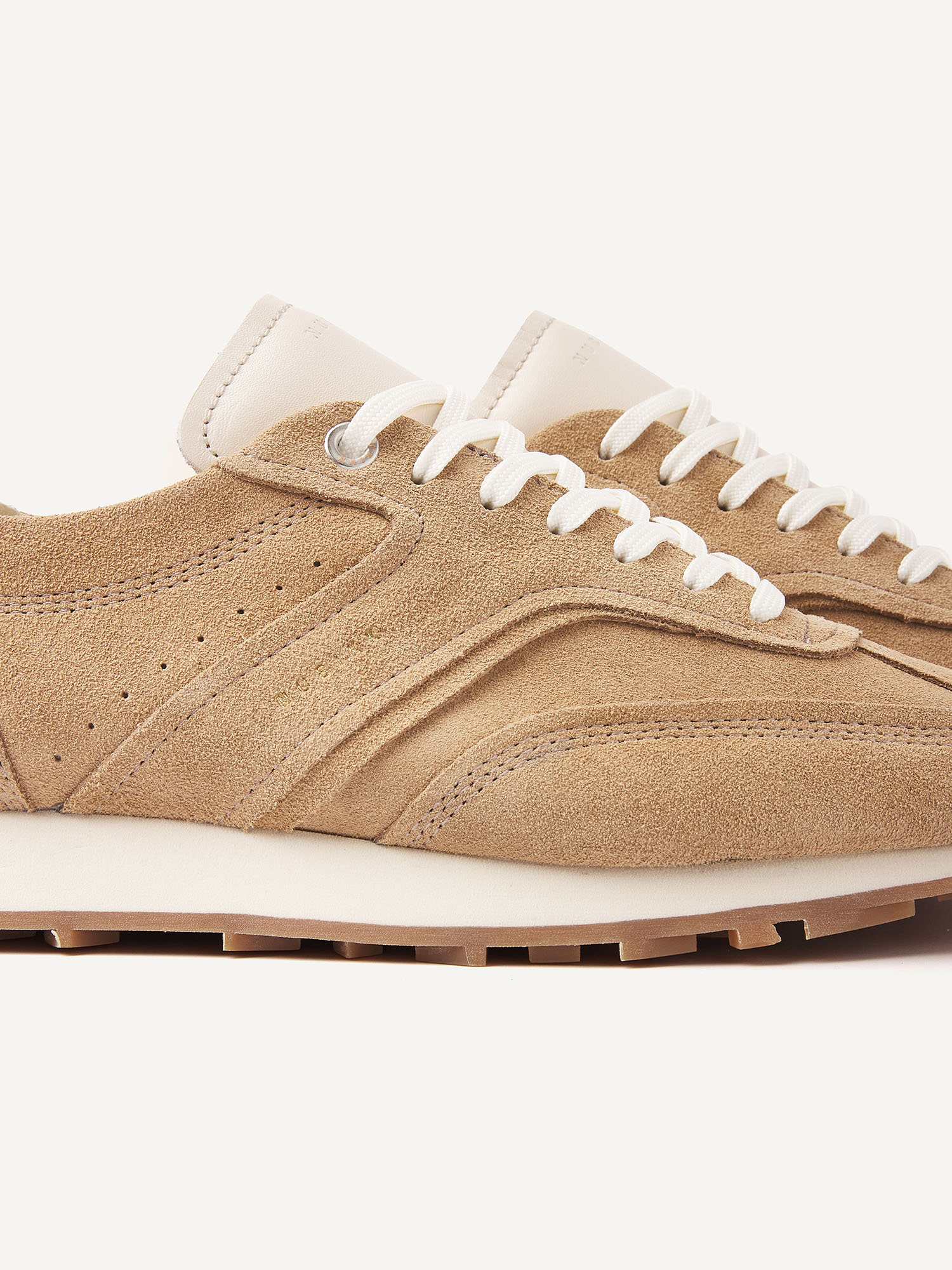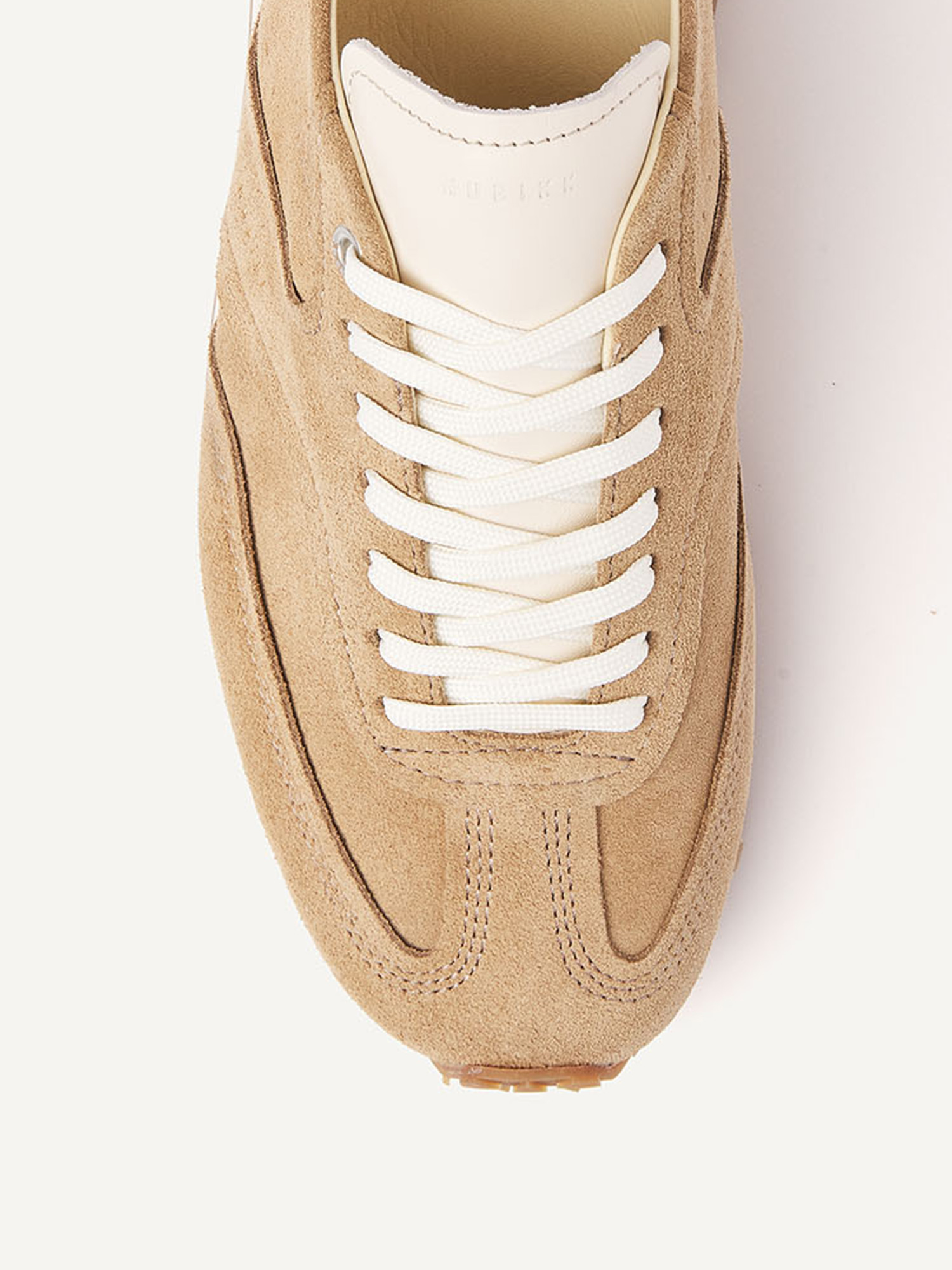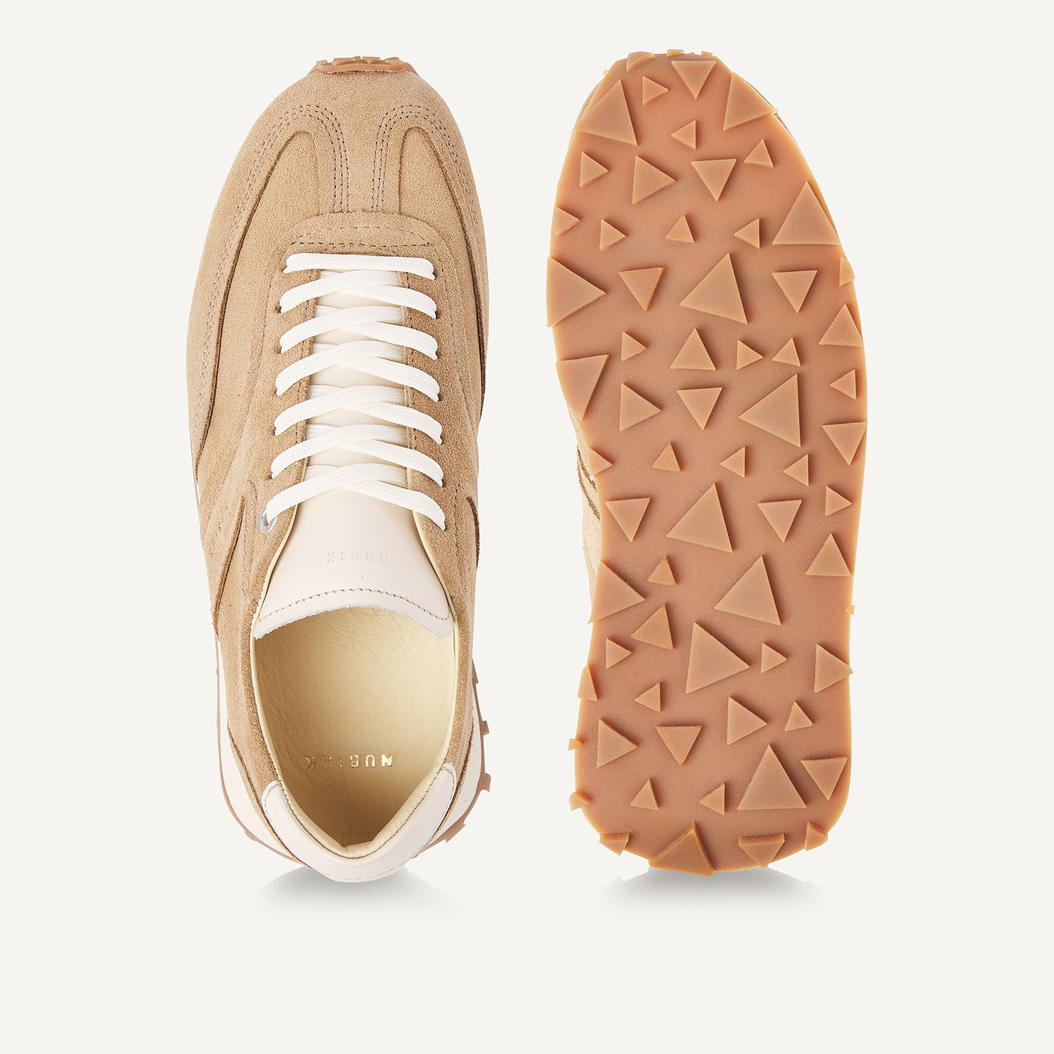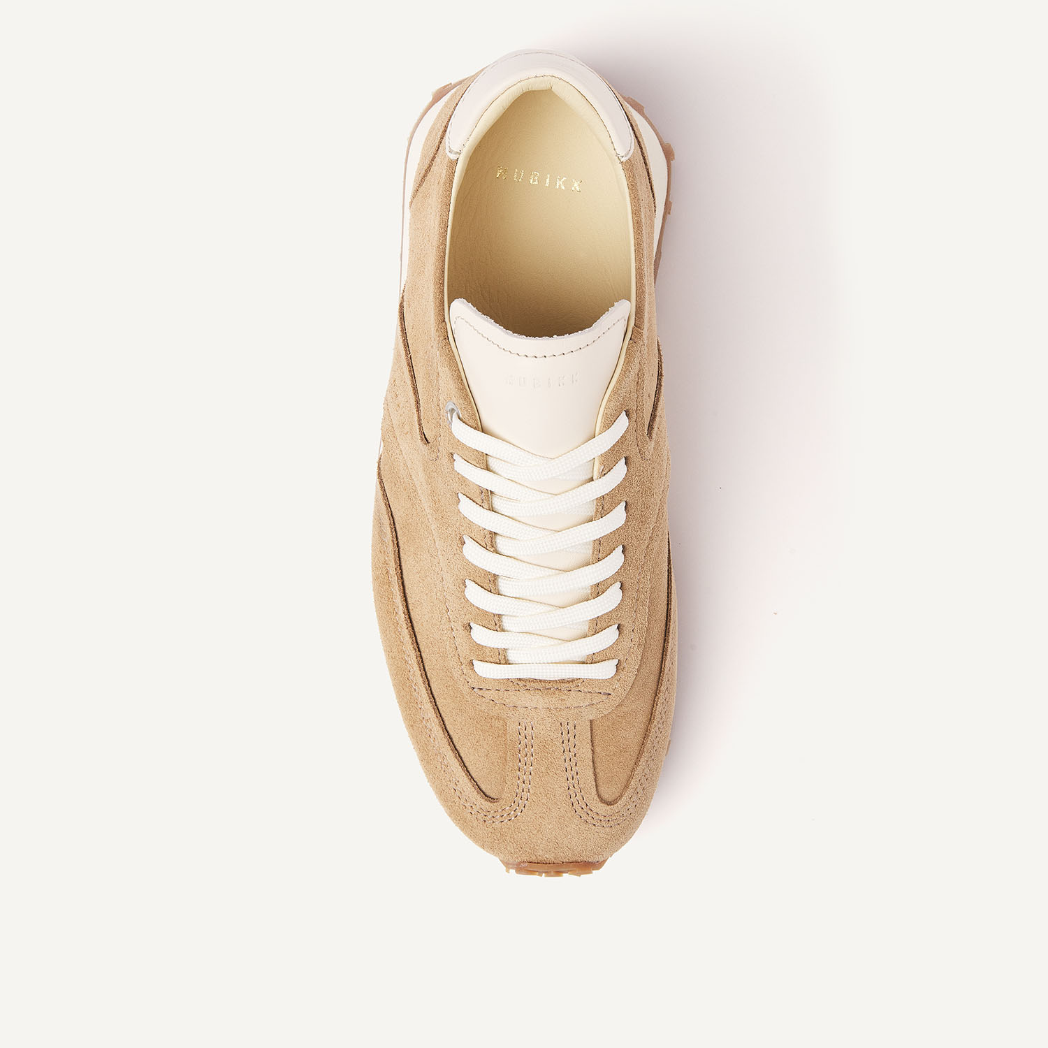 NUBIKK’s Zora sneaker for women in oak. The name ‘Zora’ represents sunrise, reflected in the sunray detail on the back of the shoe. This sneaker is made from soft leather and fully lined with leather for extra comfort. The design combines satin, leather, and suede in a versatile white color palette, finished with silky details and NUBIKK eyelets. The side may fray slightly over time, adding to the shoe’s unique character. The EVA sole with rubber insert ensures a stylish and comfortable wearing experience.