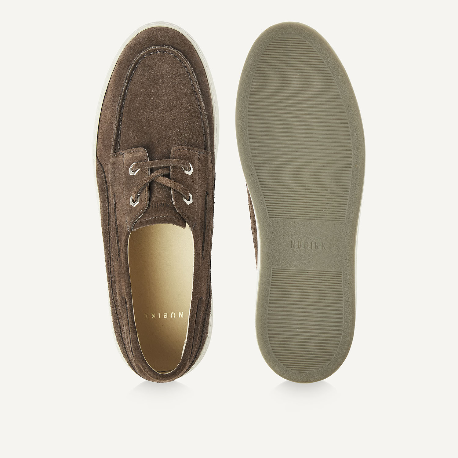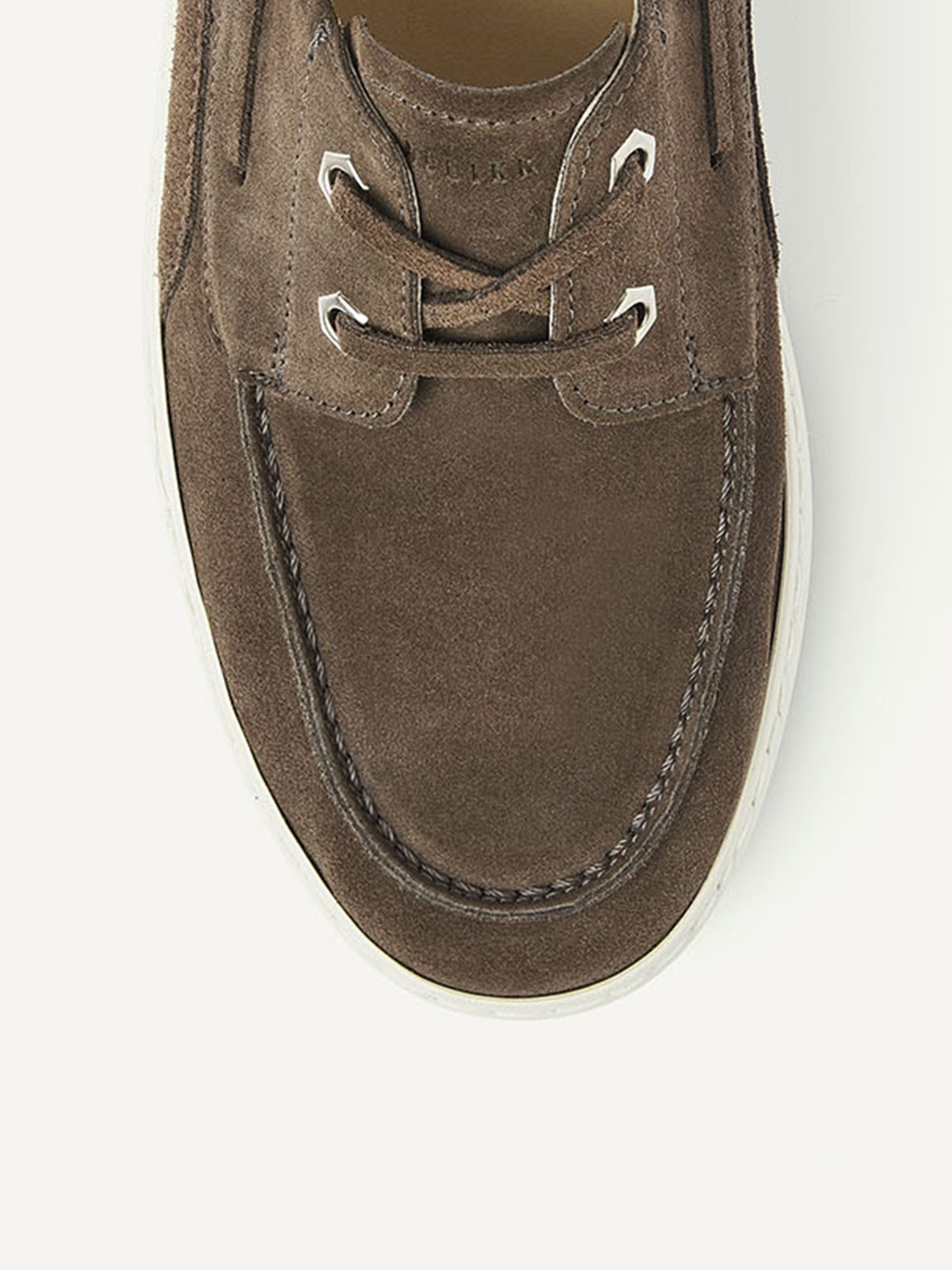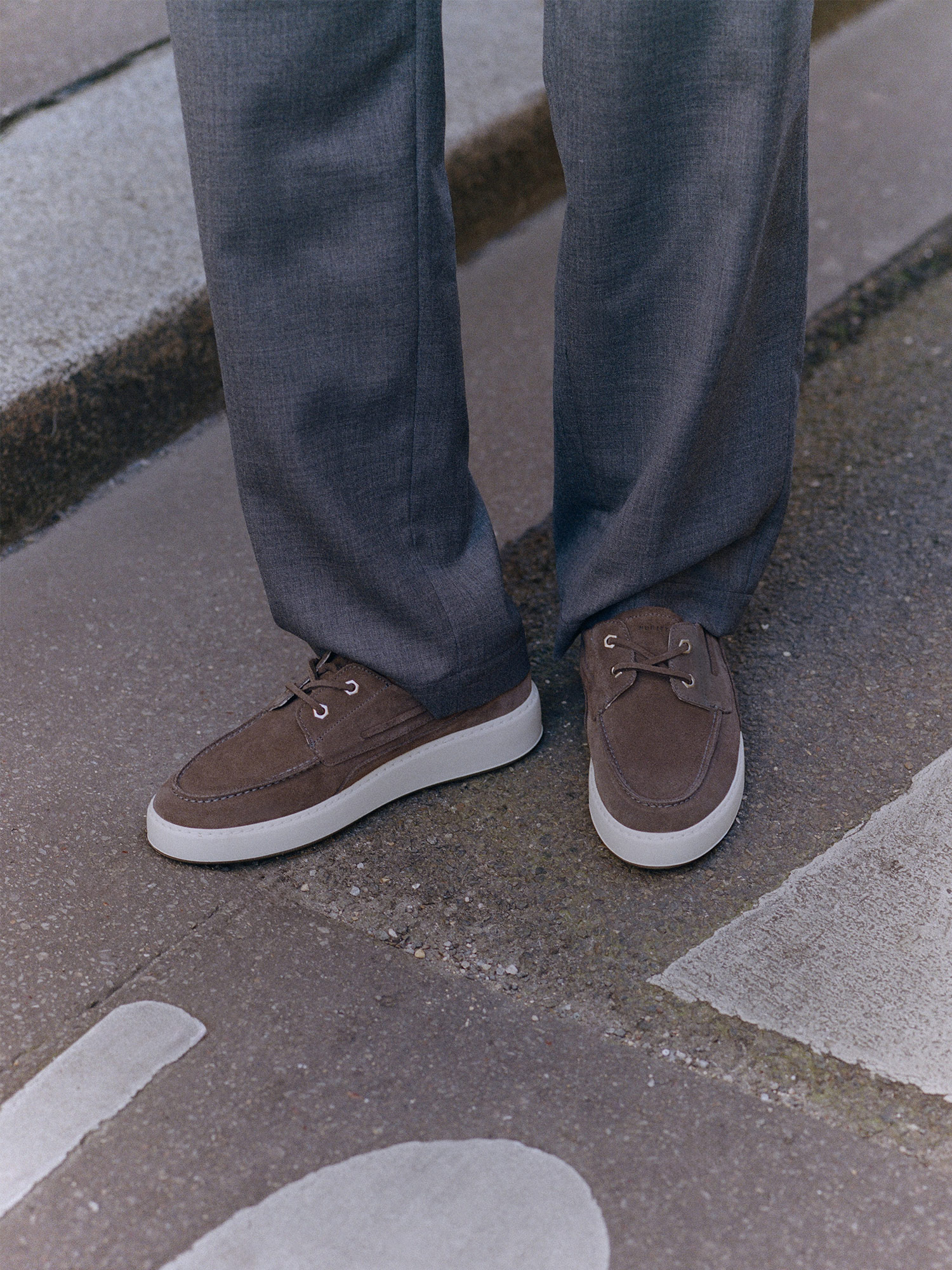 The Jiro Yacht in grey suede combines a rugged look with everyday comfort. Its boat-inspired design with the wrap-around lacing meets the relaxed style of a loafer. The Jiro sole offers a sporty appearance and a lightweight feel. The burned olive outsole detail adds a modern finishing touch. Includes an extra square cotton lace.