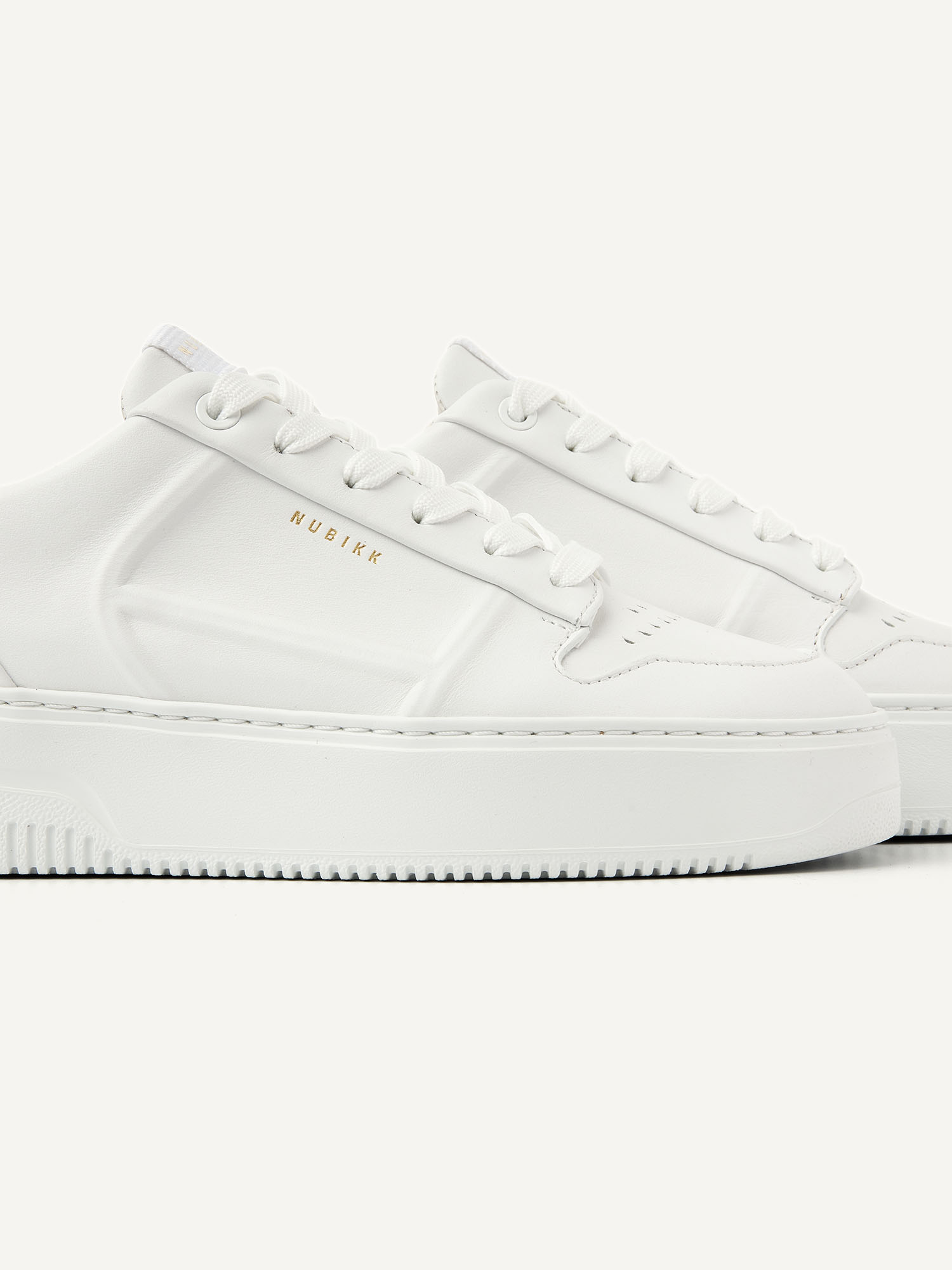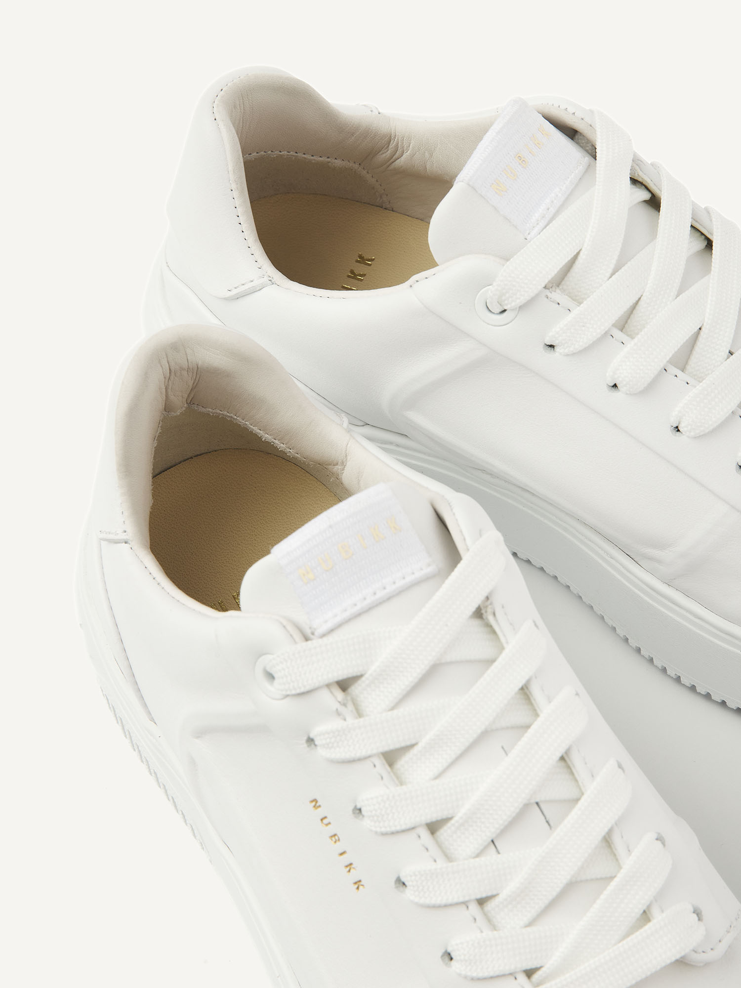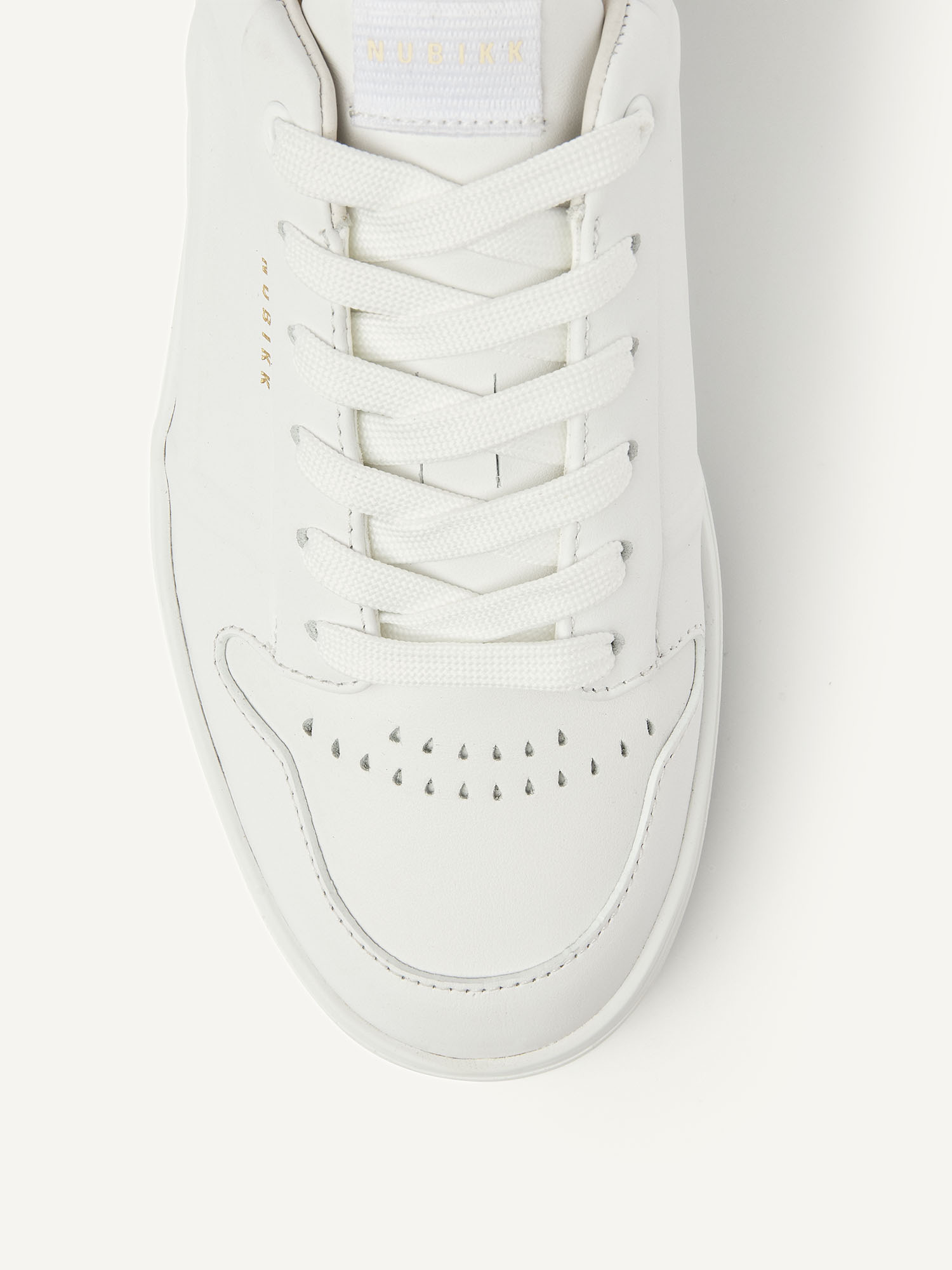 Der Basket Cole von NUBIKK aus weißem Leder. Dieser Unisex-Turnschuh strahlt mit seinem klaren Design und seiner skulpturalen Silhouette Schlichtheit und Klasse aus. Das glatte weiße Leder fühlt sich luxuriös an, und das Lederfutter sorgt für eine bequeme Passform. Die leichte Sohle ist herausnehmbar und bietet Dämpfung bei jedem Schritt.