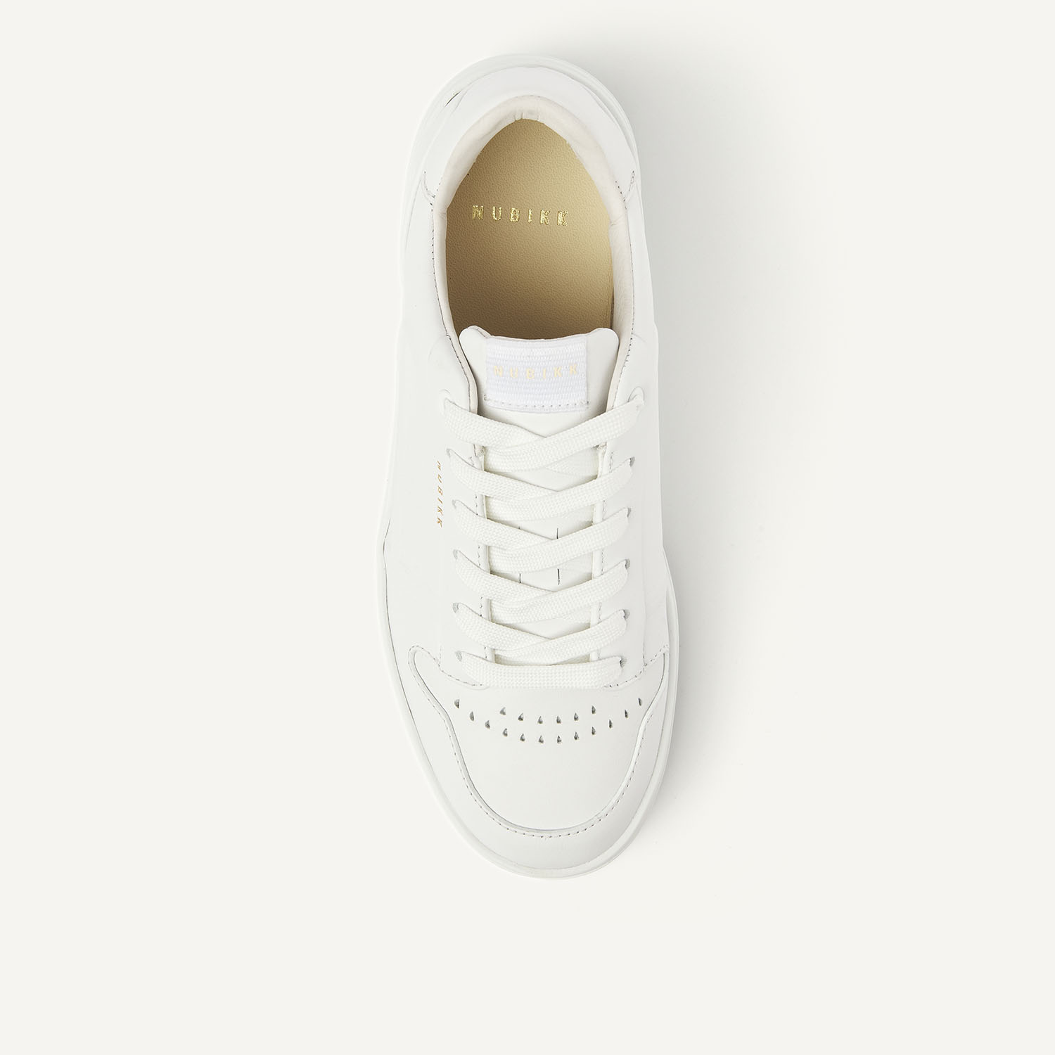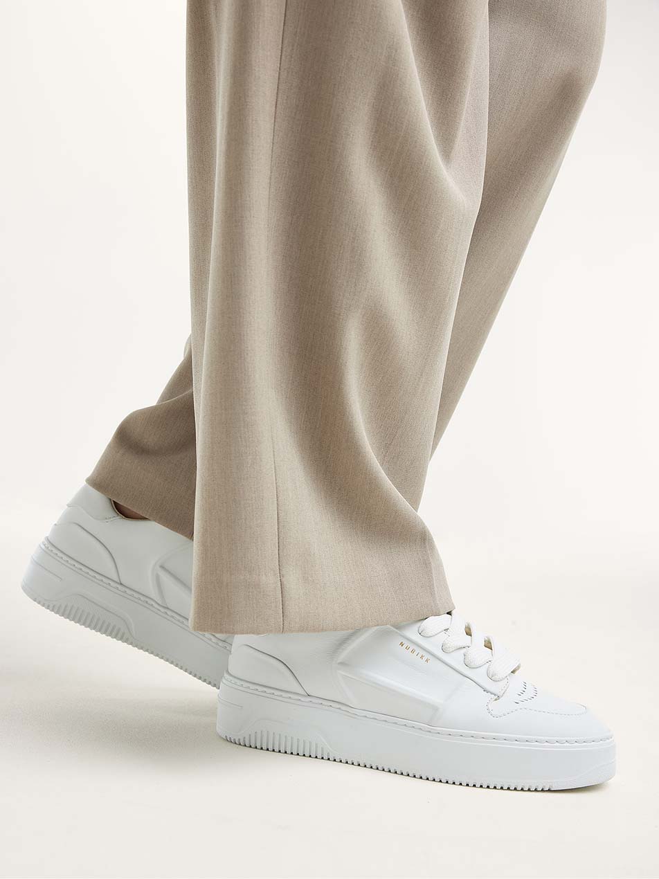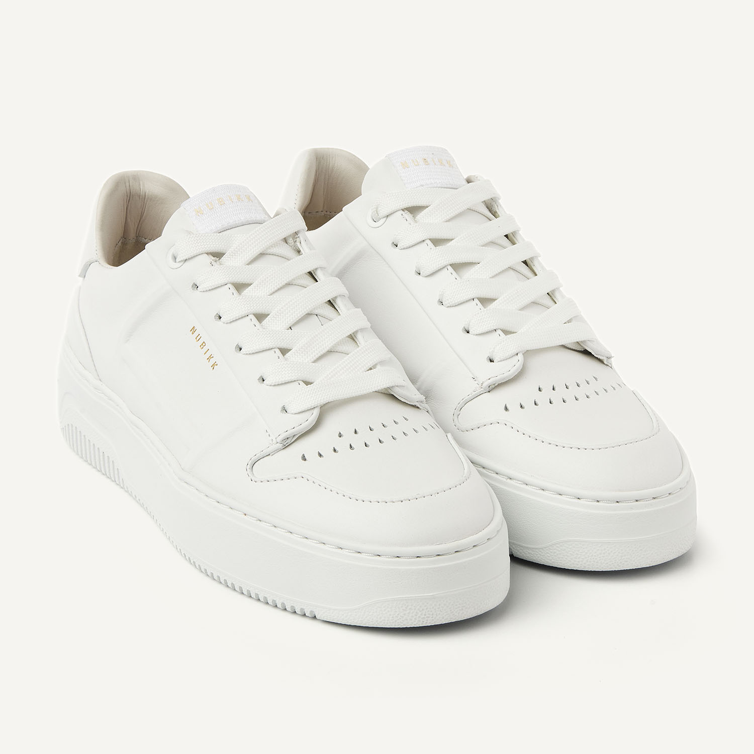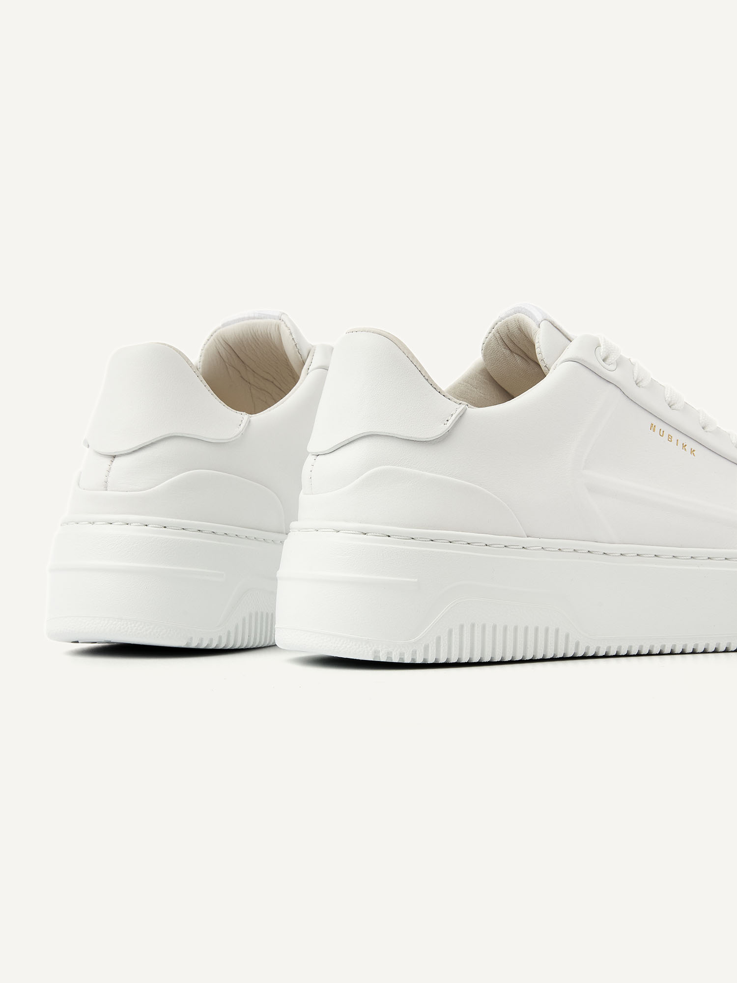Der Basket Cole von NUBIKK aus weißem Leder. Dieser Unisex-Turnschuh strahlt mit seinem klaren Design und seiner skulpturalen Silhouette Schlichtheit und Klasse aus. Das glatte weiße Leder fühlt sich luxuriös an, und das Lederfutter sorgt für eine bequeme Passform. Die leichte Sohle ist herausnehmbar und bietet Dämpfung bei jedem Schritt.