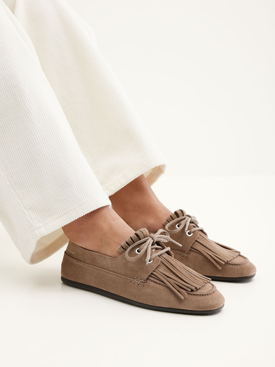 Der Joan Macaw aus taupefarbenem Wildleder verbindet minimalistisches Design mit einer sommerlichen Ausstrahlung. Das geschmeidige, einlagige Wildleder passt sich mühelos dem Fuß an und sorgt für ein leichtes, komfortables Tragegefühl. Fransen-Details und die quadratischen Baumwollschnürsenkel setzen ein dezentes Statement. Mit flexibler Gummisohle und herausnehmbarer Innensohle ist dieser Slipper ideal für den Alltag.