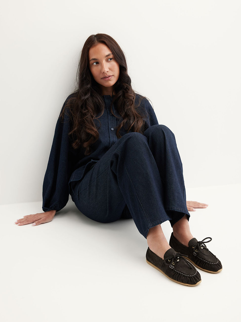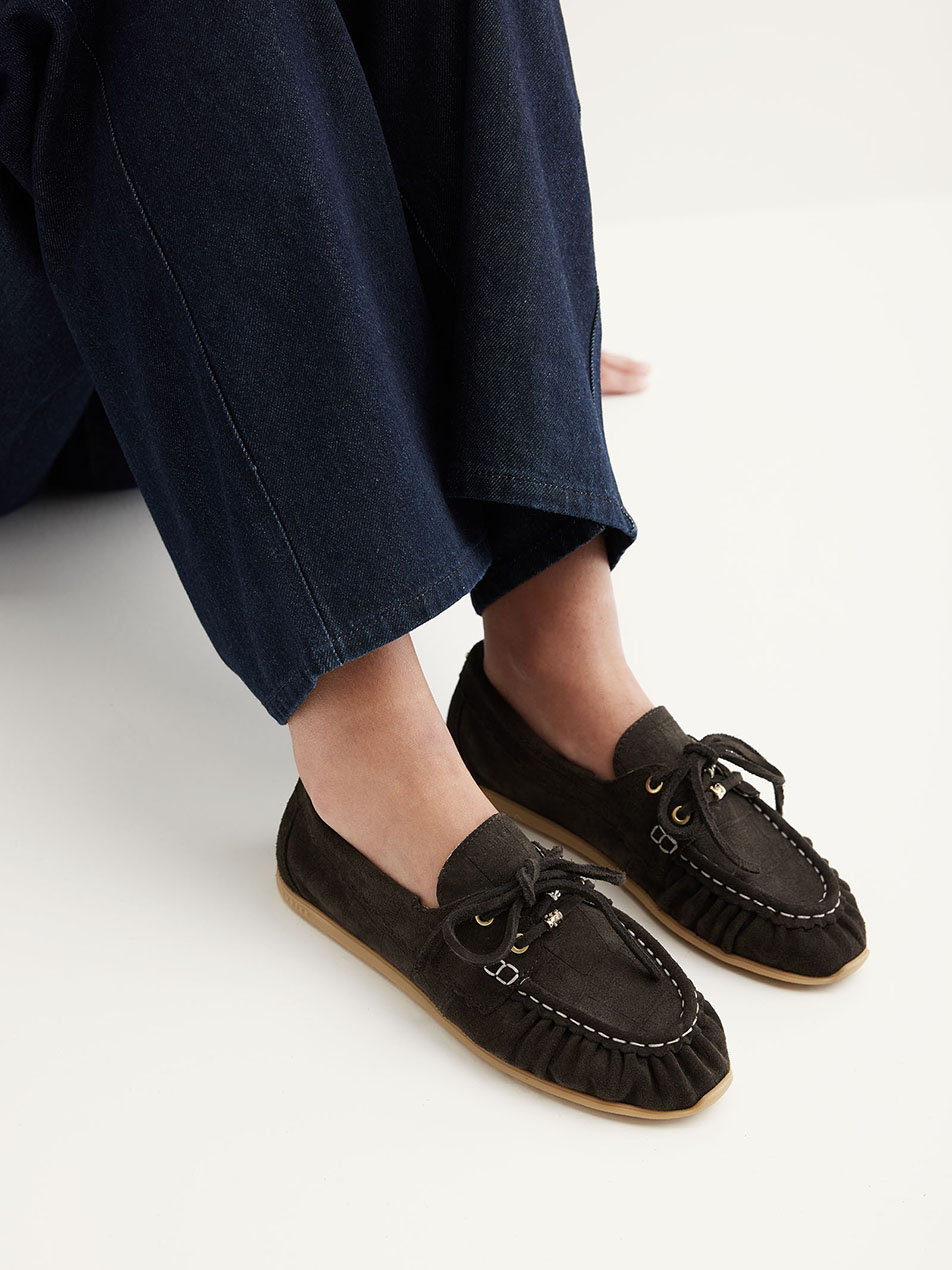 Der Riley Jade aus braunem Croco-Wildleder vereint Textur und Raffinesse. Die geprägte Croco-Struktur verleiht dem Bootsschuh eine luxuriöse Ausstrahlung, die perfekt mit den weichen Falten auf dem Spann harmoniert. Die Schnürsenkel mit abnehmbaren Charms bieten vielseitige Stylingmöglichkeiten, während die Half-Moon Verarbeitung und kontrastierende Mocknähte das handwerkliche Können unterstreichen. Goldene NUBIKK-Details verleihen dem Design zusätzlichen Charakter.