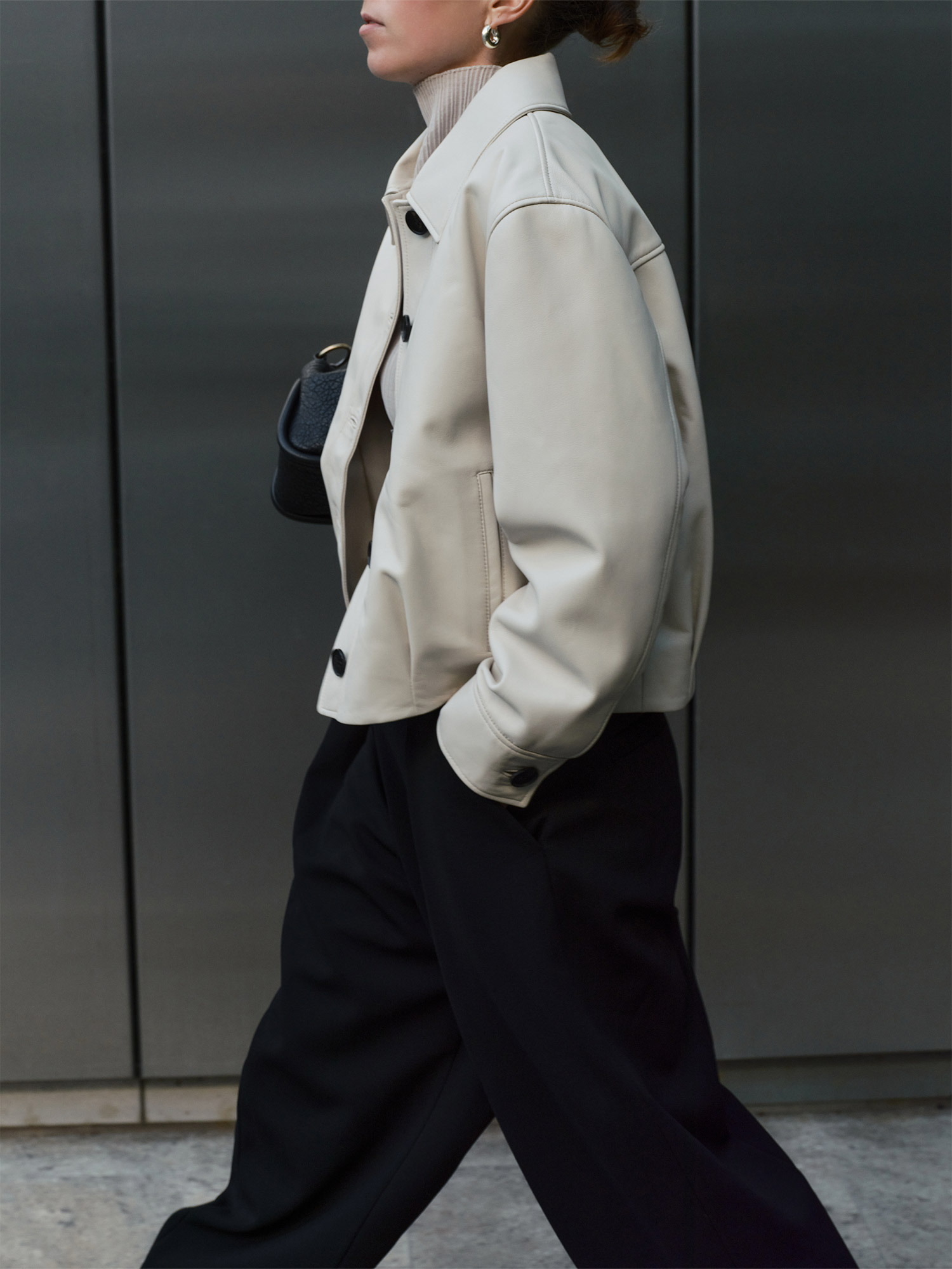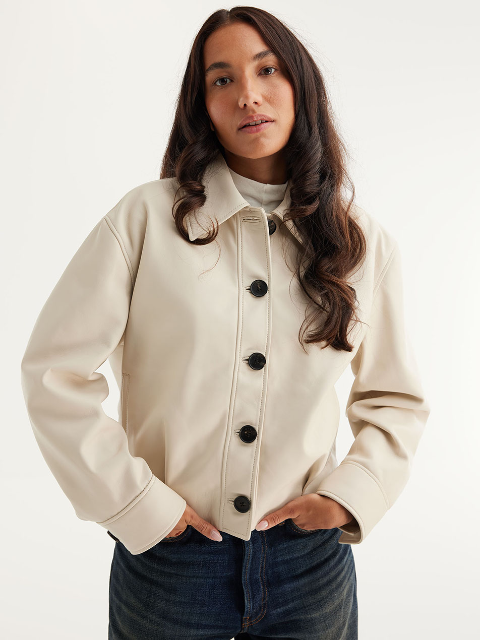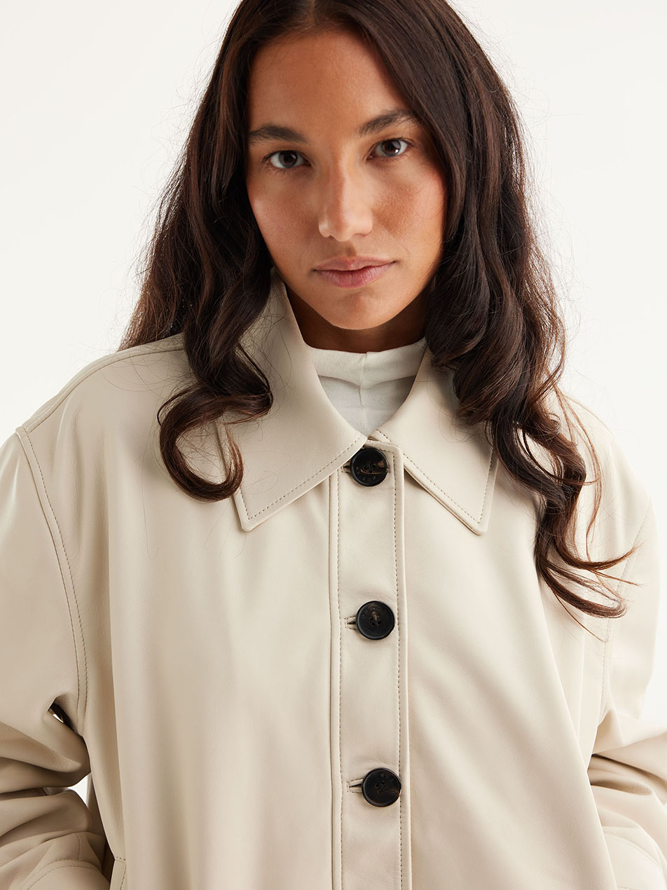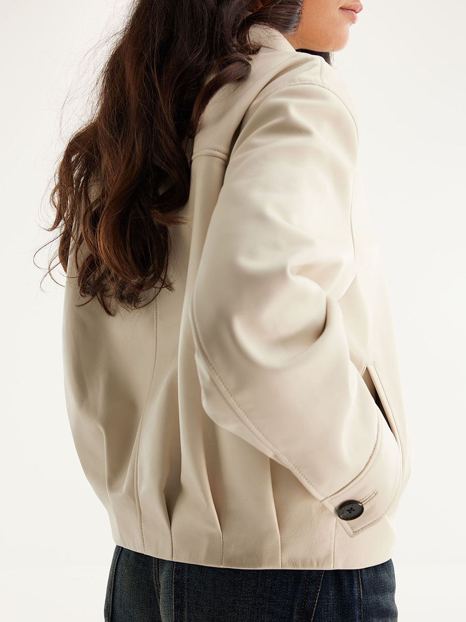 Die Kate Jacke aus Off-White-Leder ist eine boxy, lederinspirierte Jacke. Sie wird aus weichem Kalbsleder handgefertigt und hat ein luxuriöses Nylonfutter, das für angenehmen Tragekomfort sorgt. Der boxy Schnitt und die gefaltete Rückseite verleihen ihr einen markanten Look, während die Knöpfe mit NUBIKK-Branding dem Design eine edle Note geben. Durch ihr geringes Gewicht und die weiche Struktur ist diese Jacke sowohl für drinnen als auch draußen geeignet. Für einen oversized Look eine Größe größer wählen.
