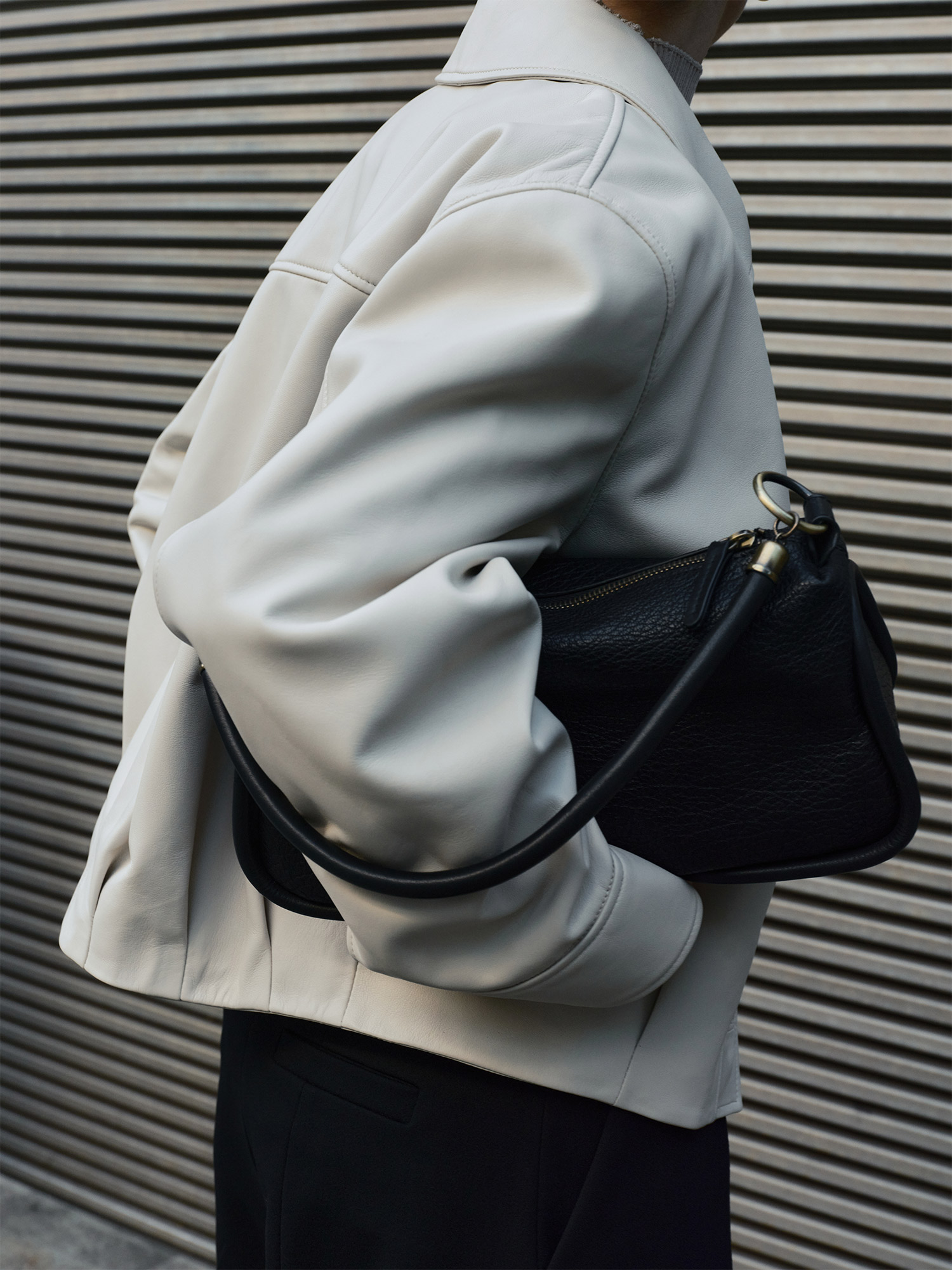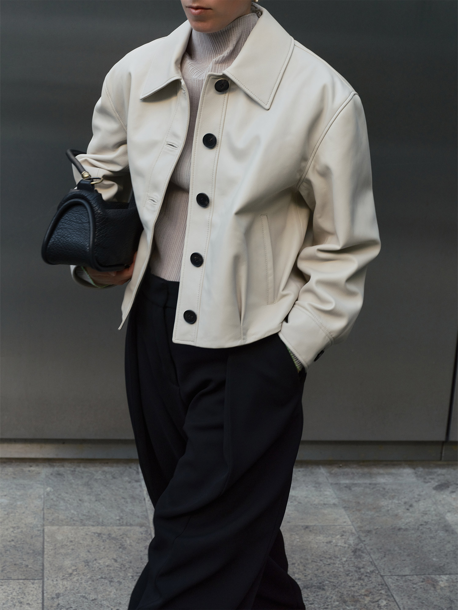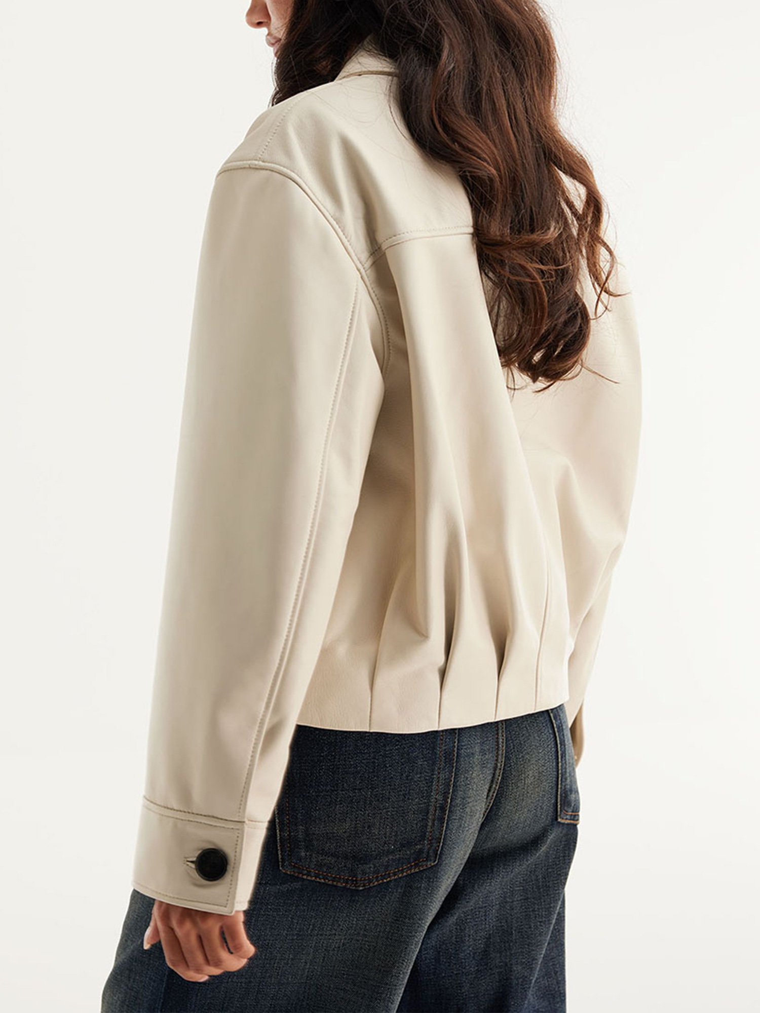 Die Kate Jacke aus Off-White-Leder ist eine boxy, lederinspirierte Jacke. Sie wird aus weichem Kalbsleder handgefertigt und hat ein luxuriöses Nylonfutter, das für angenehmen Tragekomfort sorgt. Der boxy Schnitt und die gefaltete Rückseite verleihen ihr einen markanten Look, während die Knöpfe mit NUBIKK-Branding dem Design eine edle Note geben. Durch ihr geringes Gewicht und die weiche Struktur ist diese Jacke sowohl für drinnen als auch draußen geeignet. Für einen oversized Look eine Größe größer wählen.