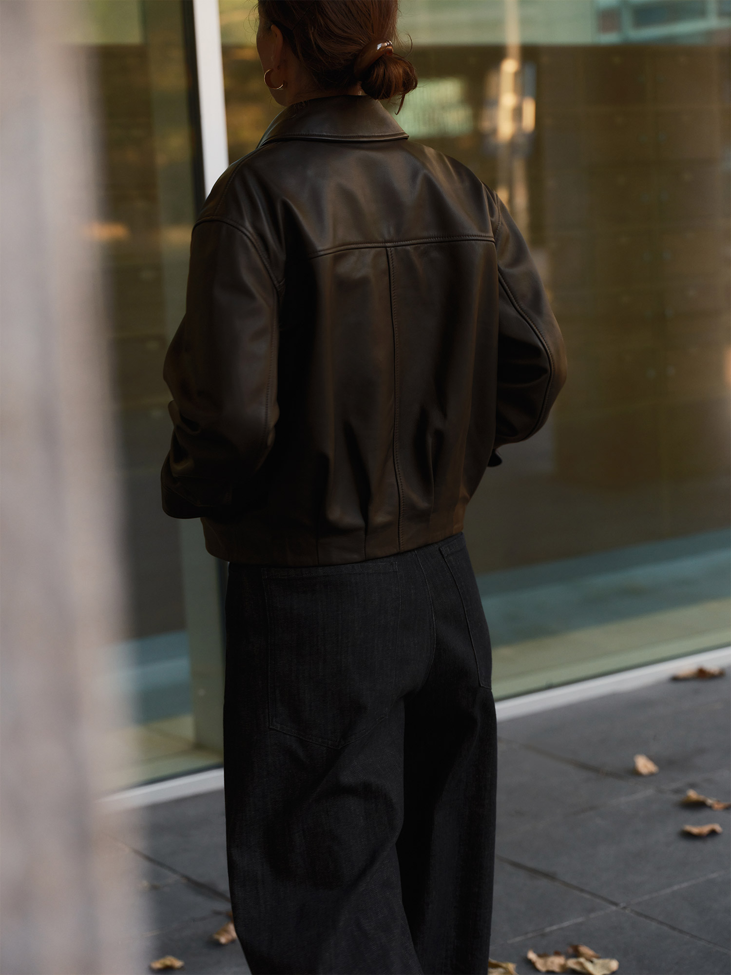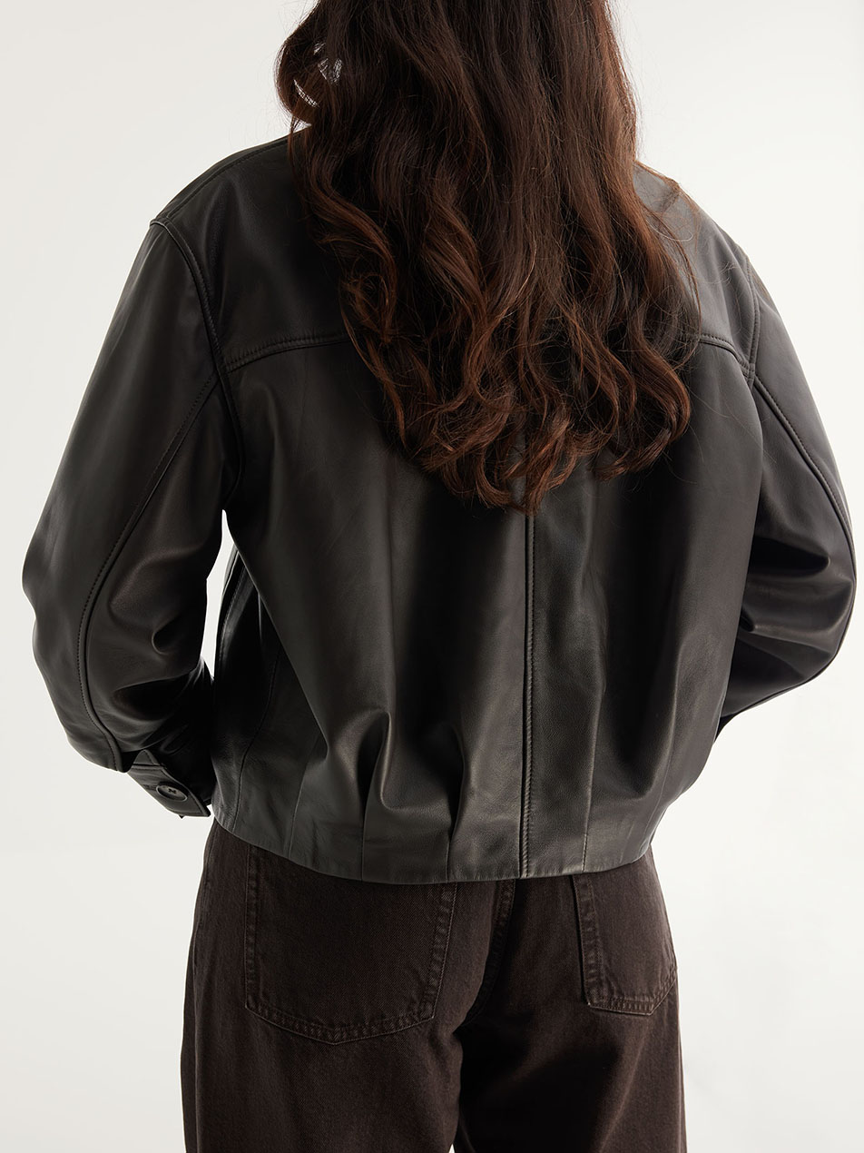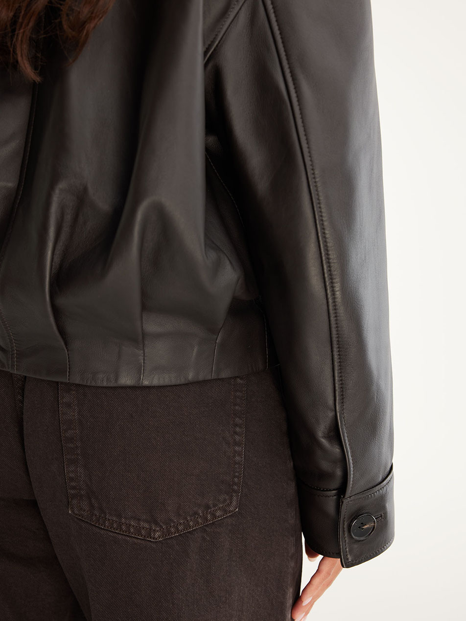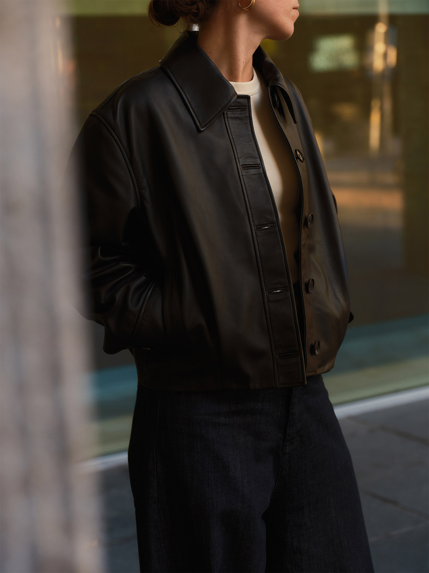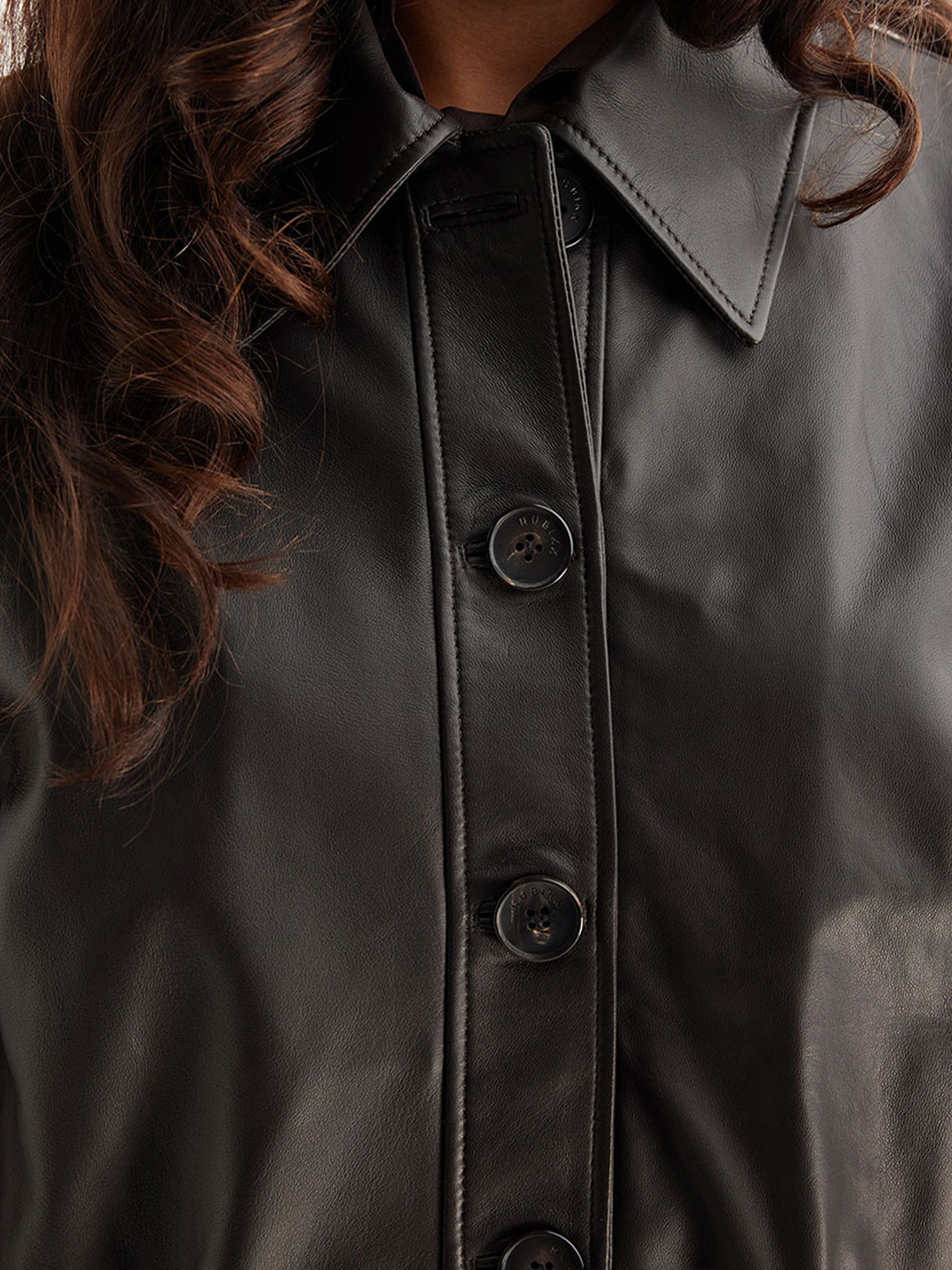 Die Kate Jacke aus braunem Leder ist eine moderne Version der klassischen Lederjacke. Der boxy Schnitt aus weichem Kalbsleder mit leichter Faltung am Rücken sorgt für eine angenehme Passform. Durch ihr geringes Gewicht und die weiche Struktur ist diese Jacke sowohl für drinnen als auch draußen geeignet. Zudem sind die Knöpfe dezent mit dem NUBIKK-Branding versehen. Für einen oversized Look eine Größe größer wählen.
