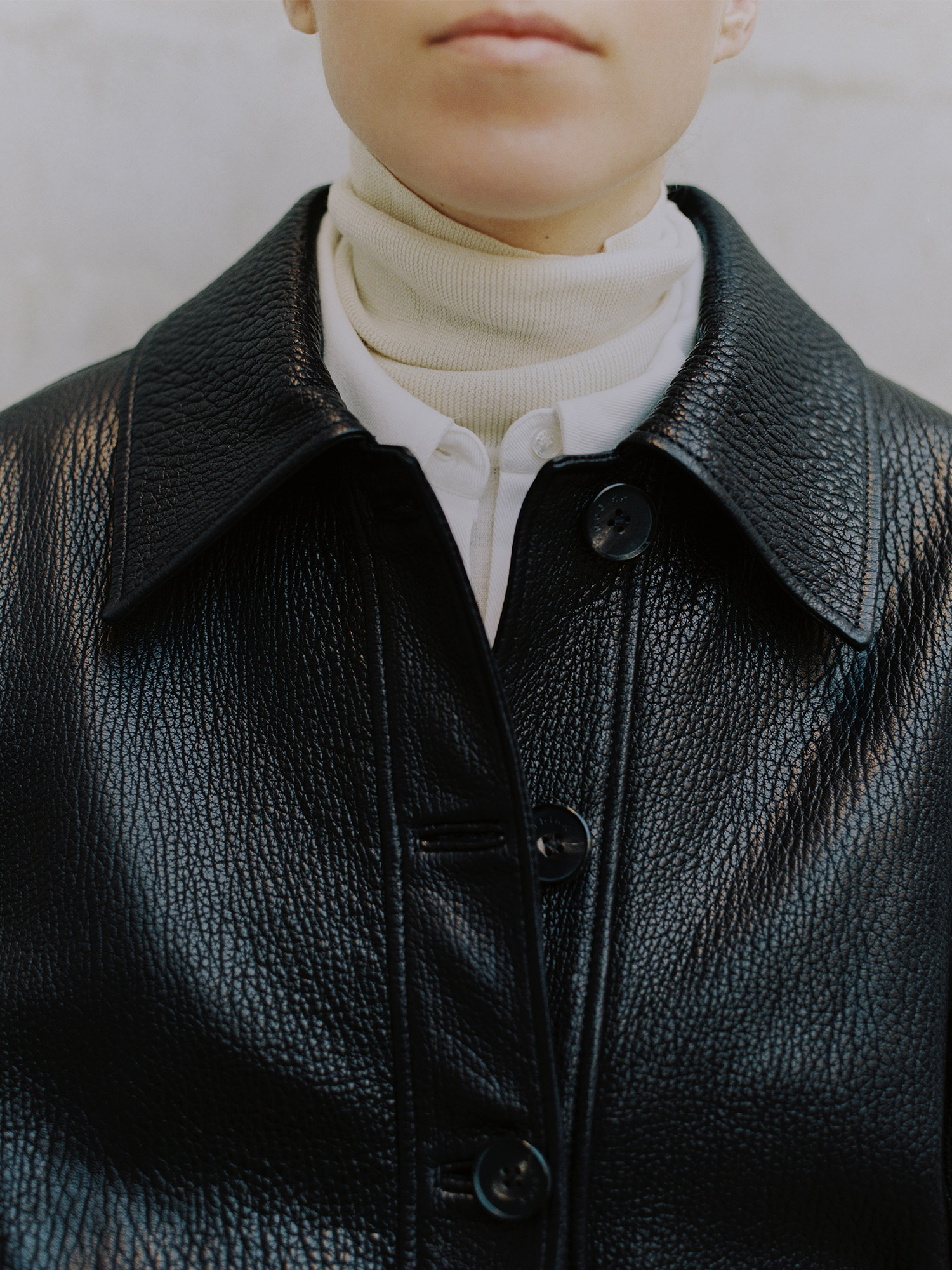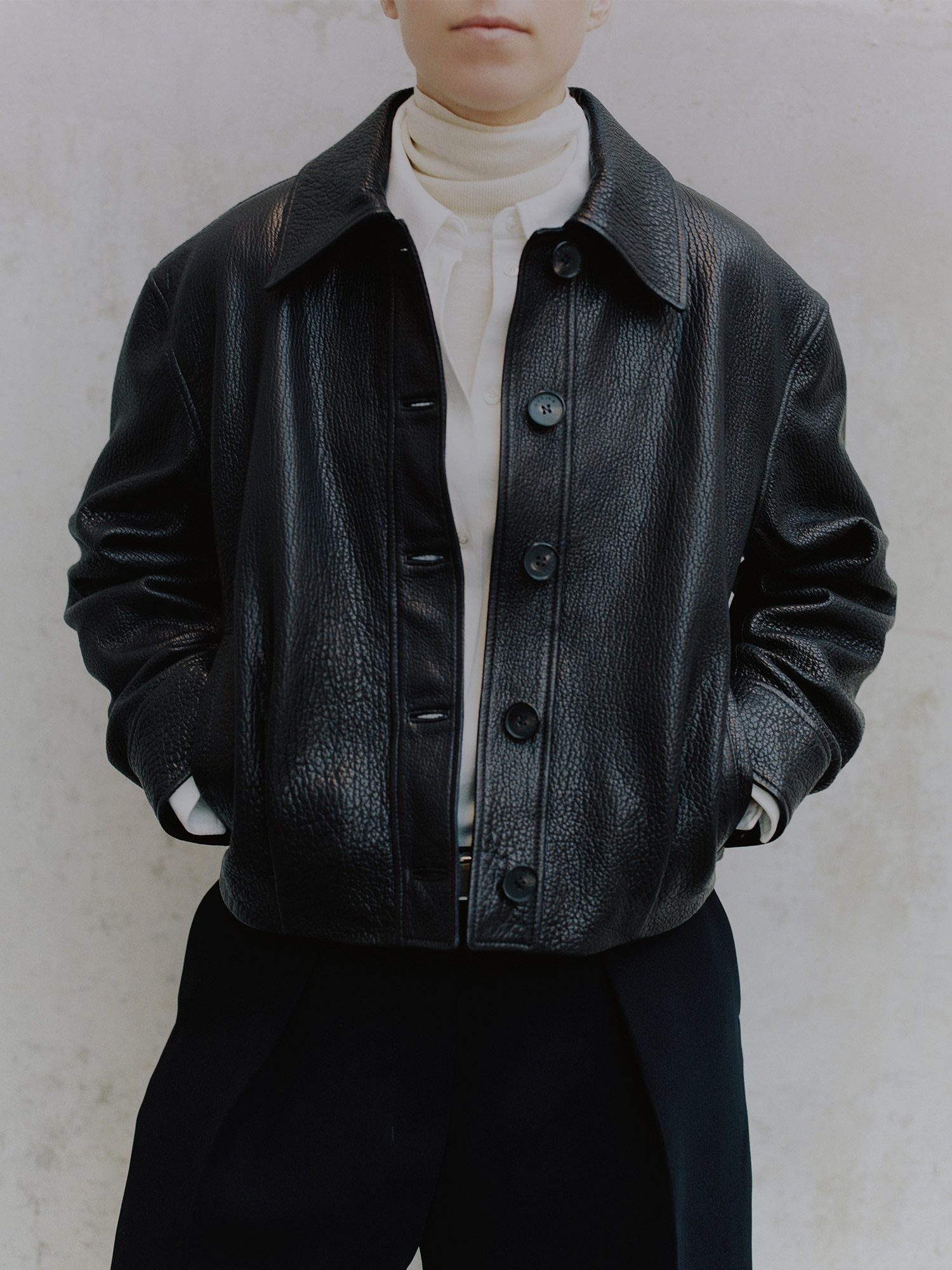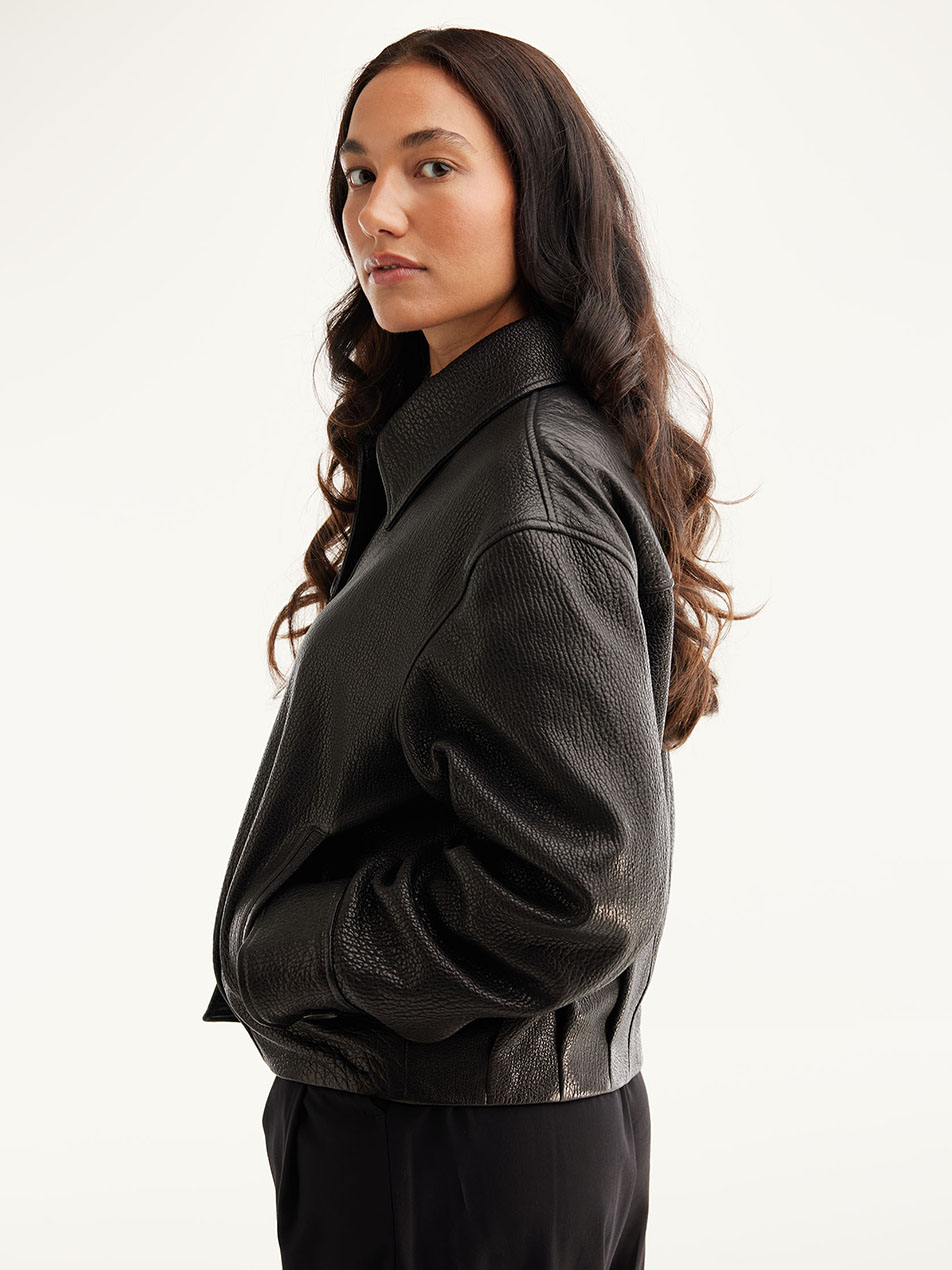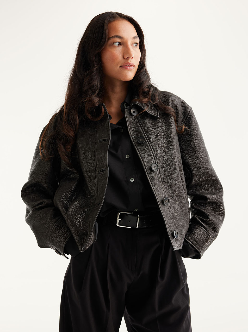 Die Kate Jacke aus schwarzem Grain-Material ist eine boxy, lederinspirierte Jacke. Sie wird aus strukturiertem Kalbsleder handgefertigt und hat ein luxuriöses Nylonfutter, das für angenehmen Tragekomfort sorgt. Der boxy Schnitt und die gefaltete Rückseite verleihen ihr ein markantes Design, während die Knöpfe mit NUBIKK-Branding dem Look eine edle Note geben. Durch ihr geringes Gewicht und die weiche Struktur ist diese Jacke sowohl für drinnen als auch draußen geeignet. Für einen oversized Look eine Größe größer wählen.