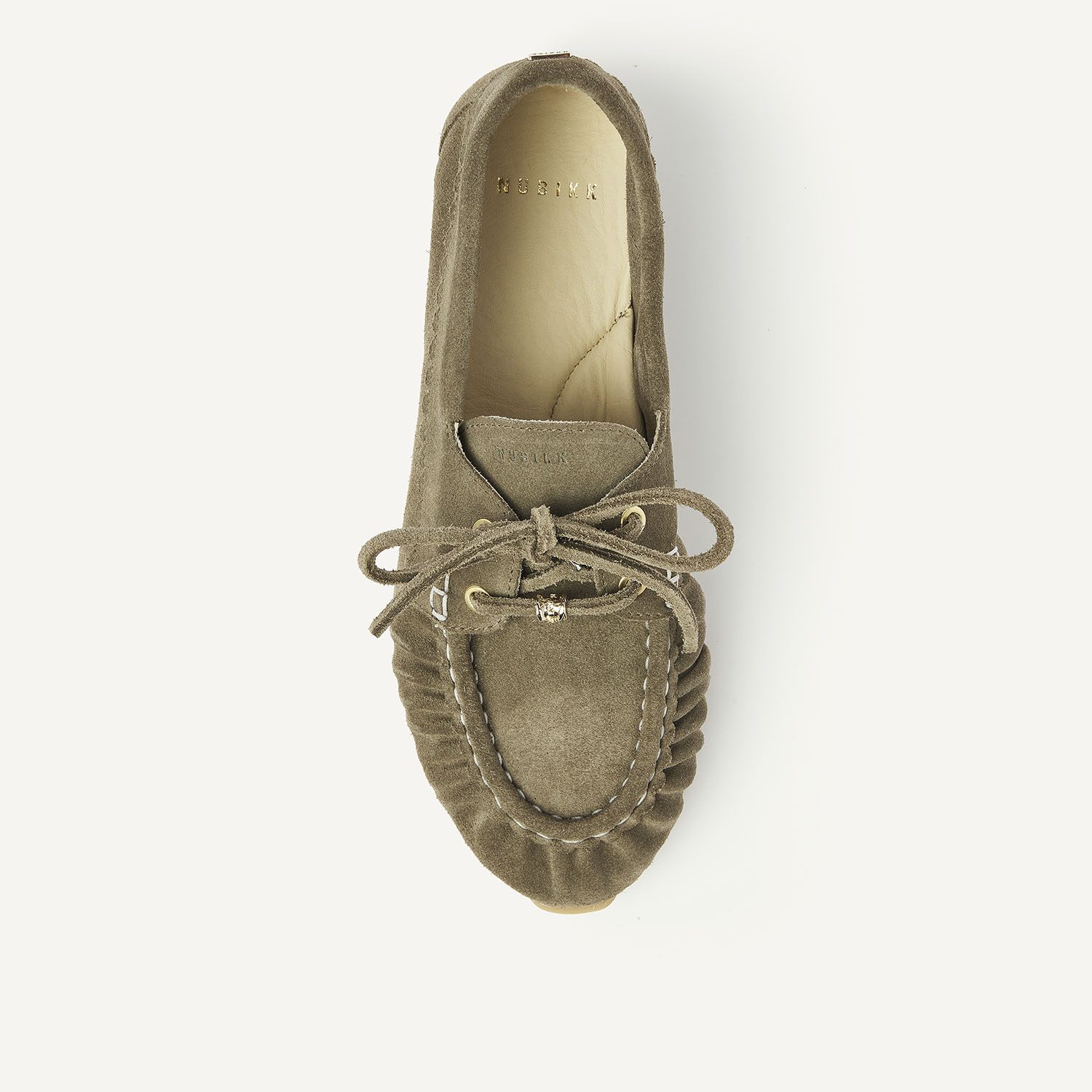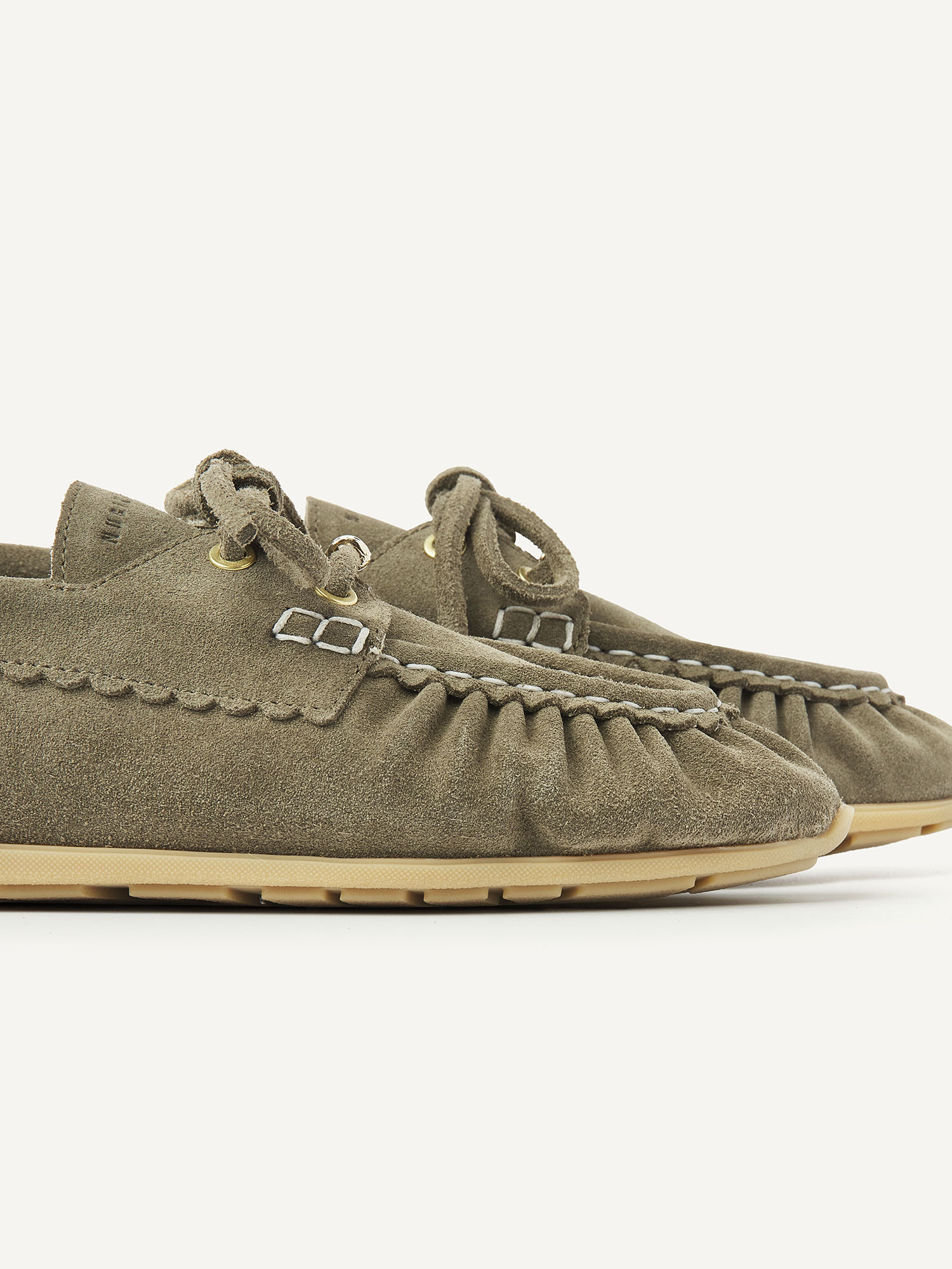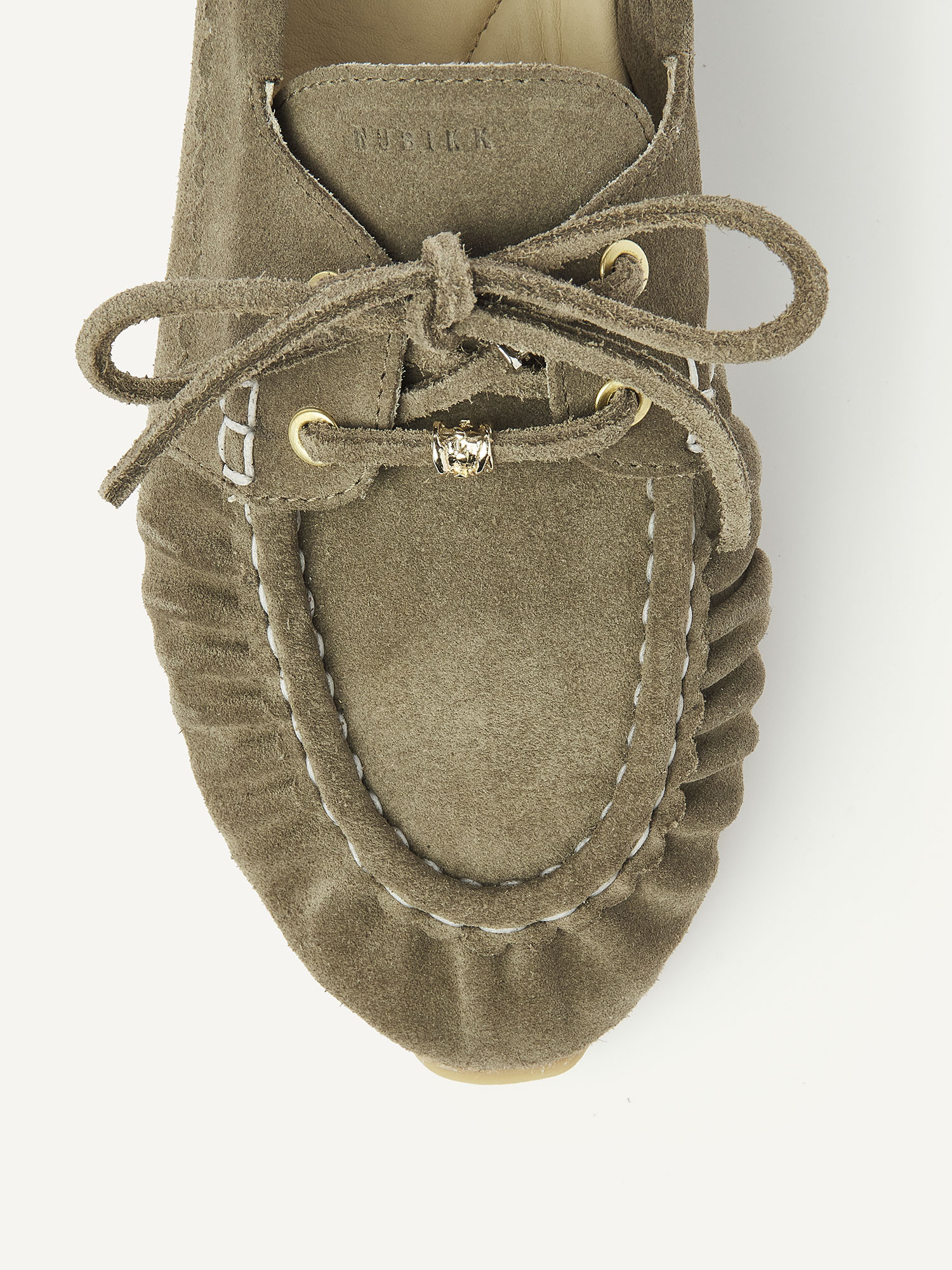 Der Riley Jade aus hellgrünem Wildleder ist eine moderne Interpretation des klassischen Bootsschuhs, veredelt mit raffinierten Details. Der sanfte Farbton harmoniert perfekt mit den plissierten Details an der Vorderseite und den kontrastierenden Mocknähten entlang der Half-Moon Verarbeitung. Die Schnürsenkel mit abnehmbaren Charms sorgen für ein verspieltes, luxuriöses Element, das sich individuell anpassen lässt. Goldene Brandingdetails und goldfarbene Ösen verleihen dem Sneaker eine moderne, feminine Note.