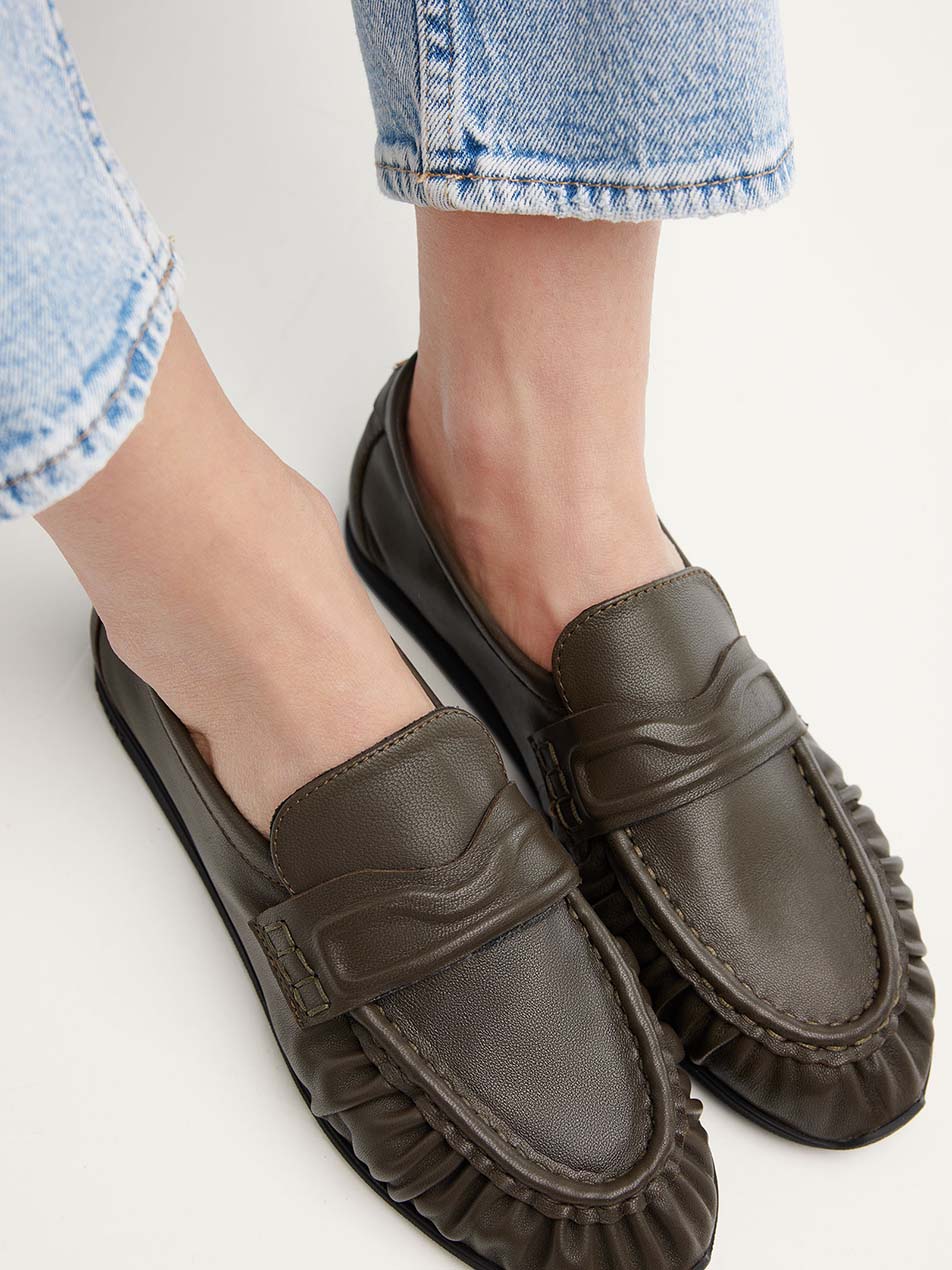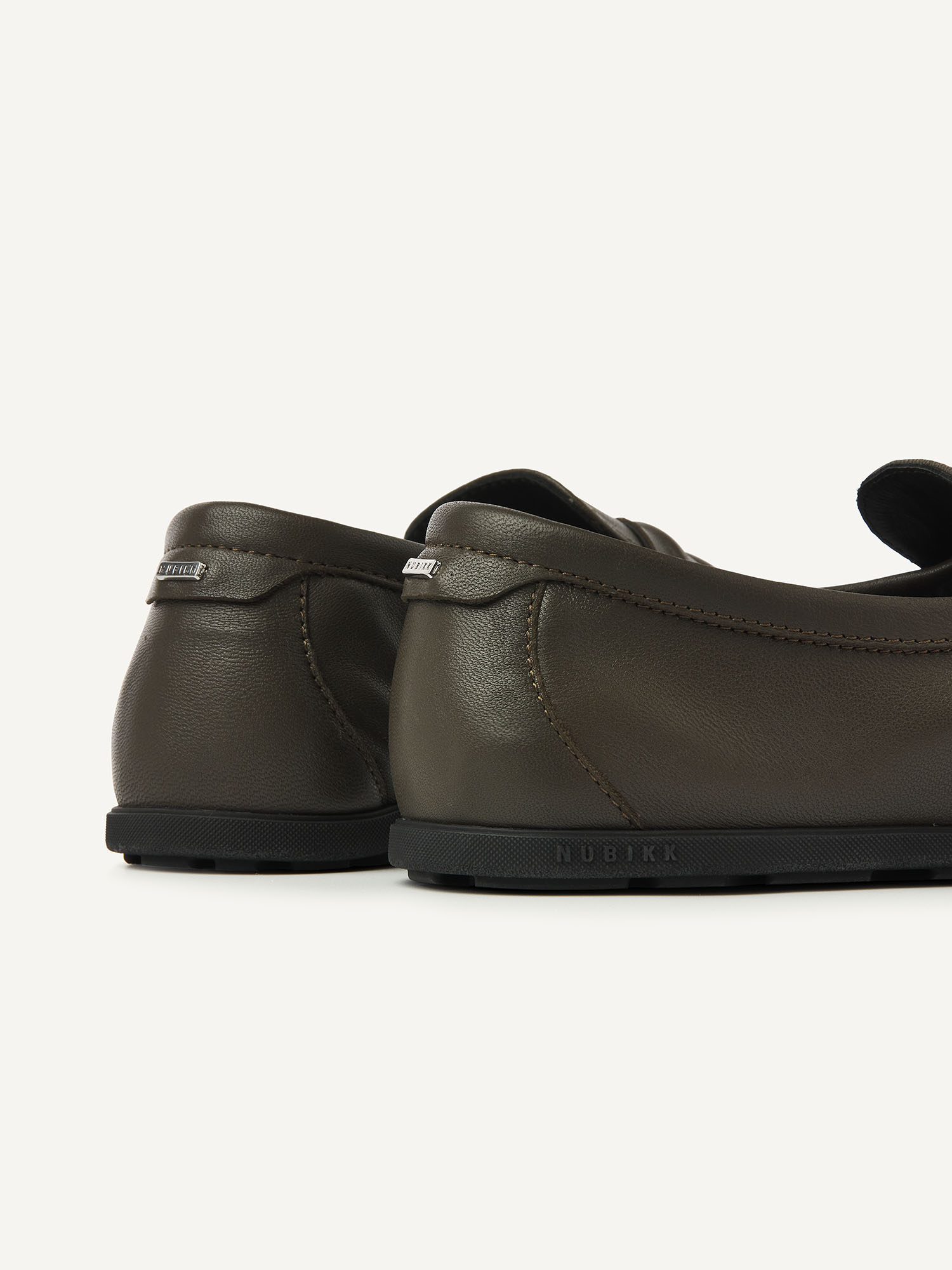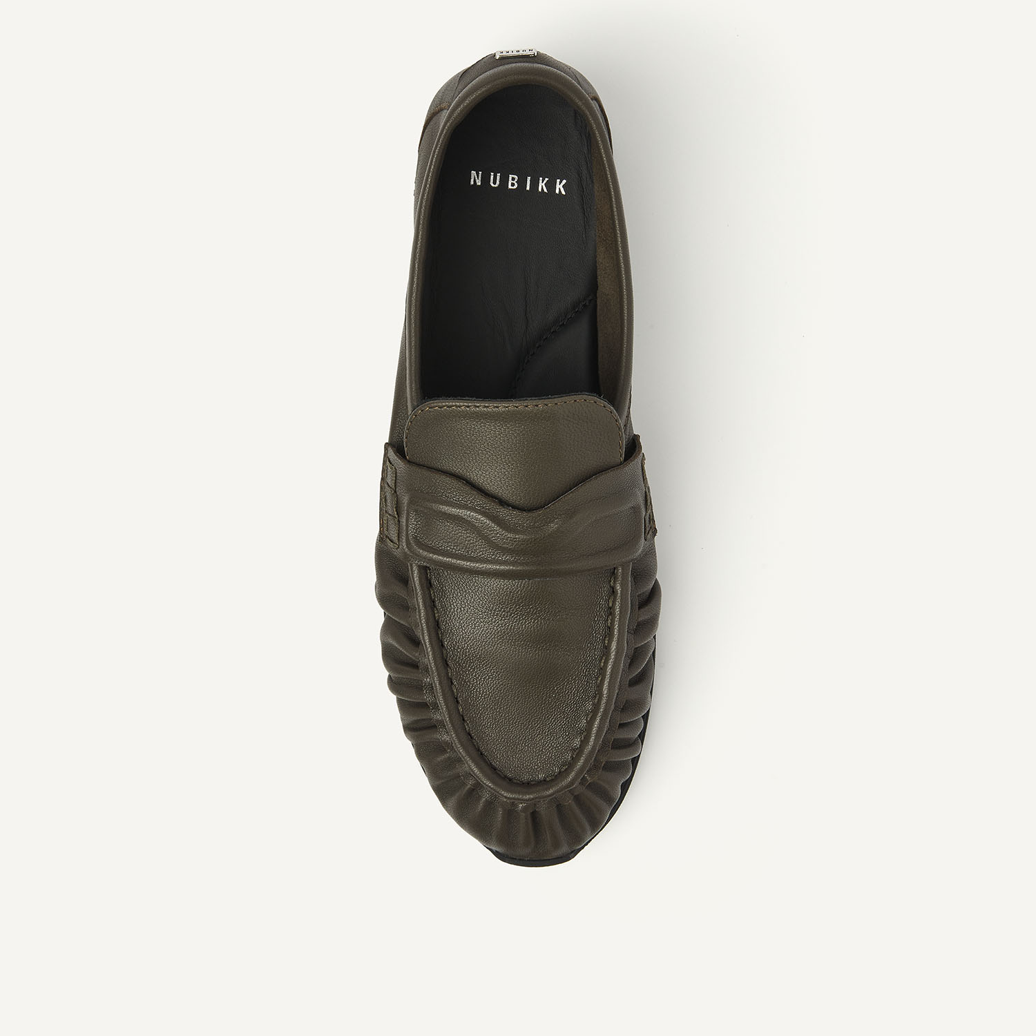 Der Riley Mio in dunkelgrünem Leder setzt ein stilvolles und dezentes Farbstatement. Das weiche Leder sorgt für eine komfortable Passform, und die Falten an der Vorderseite verleihen ein luxuriöses Erscheinungsbild. Die flexible Sohle macht den Loafer leicht und praktisch. Der Hochfrequenzriemen auf dem Spann verleiht dem Modell einen einzigartigen modernen Akzent.