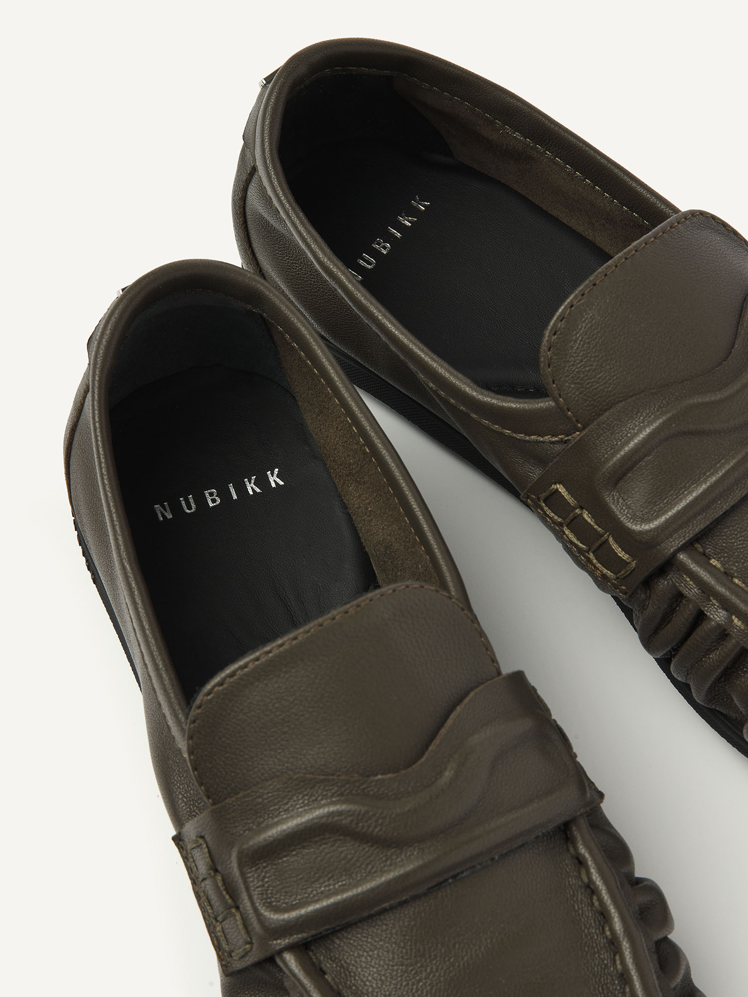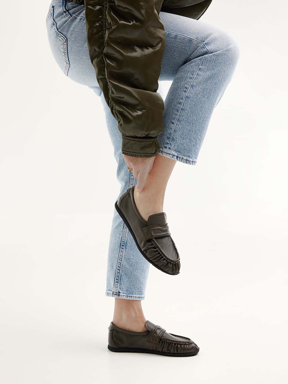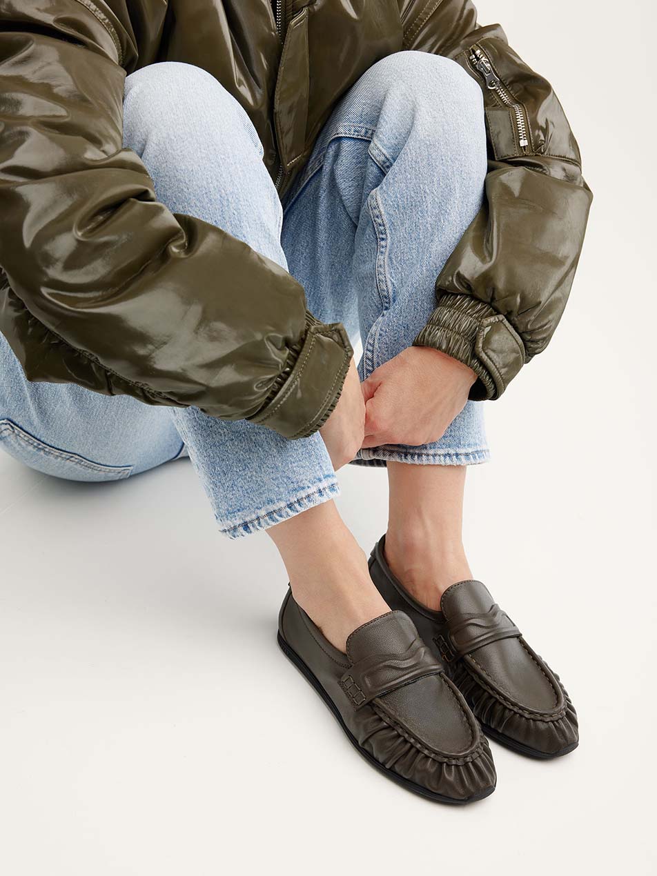 Der Riley Mio in dunkelgrünem Leder setzt ein stilvolles und dezentes Farbstatement. Das weiche Leder sorgt für eine komfortable Passform, und die Falten an der Vorderseite verleihen ein luxuriöses Erscheinungsbild. Die flexible Sohle macht den Loafer leicht und praktisch. Der Hochfrequenzriemen auf dem Spann verleiht dem Modell einen einzigartigen modernen Akzent.