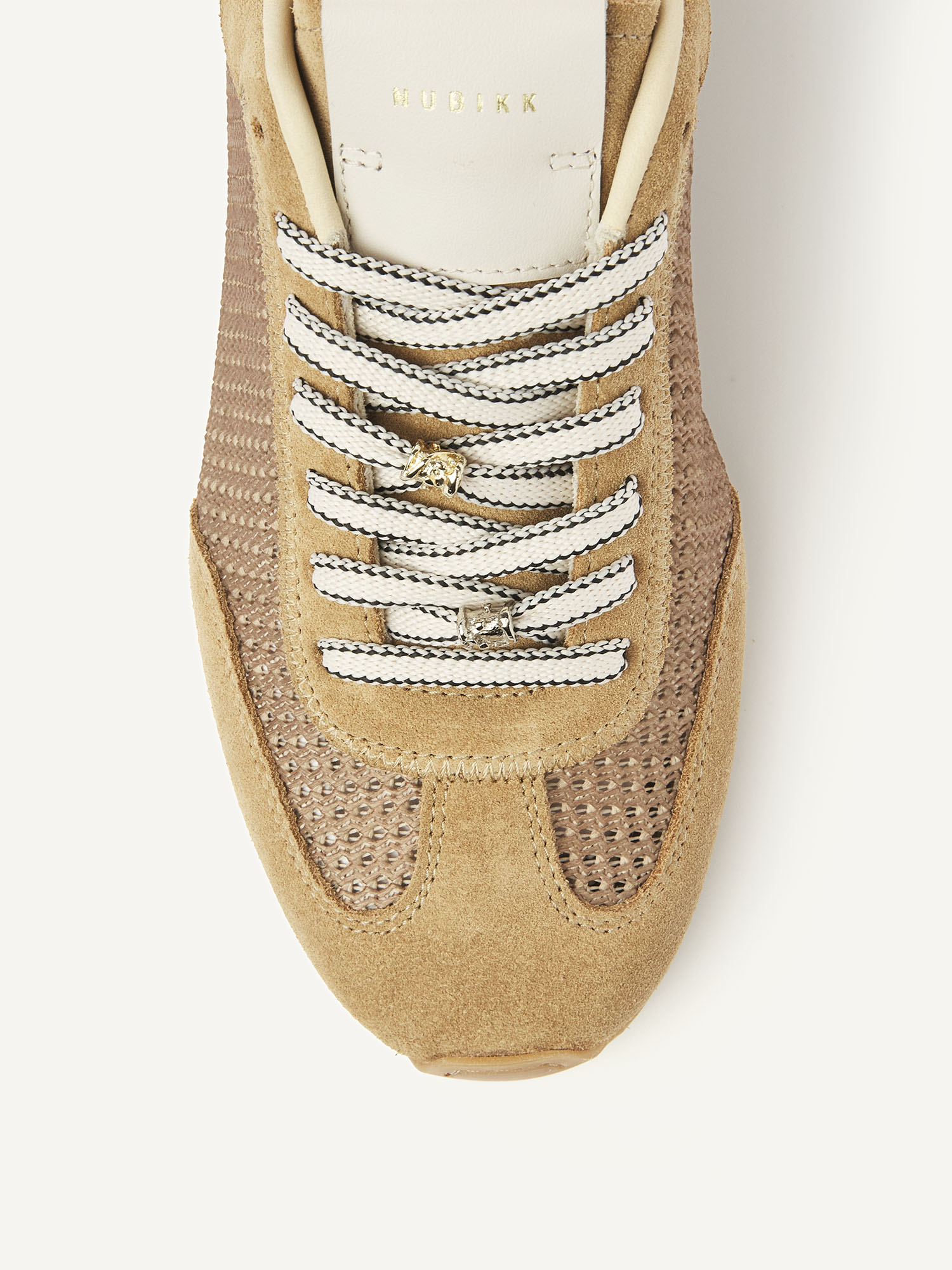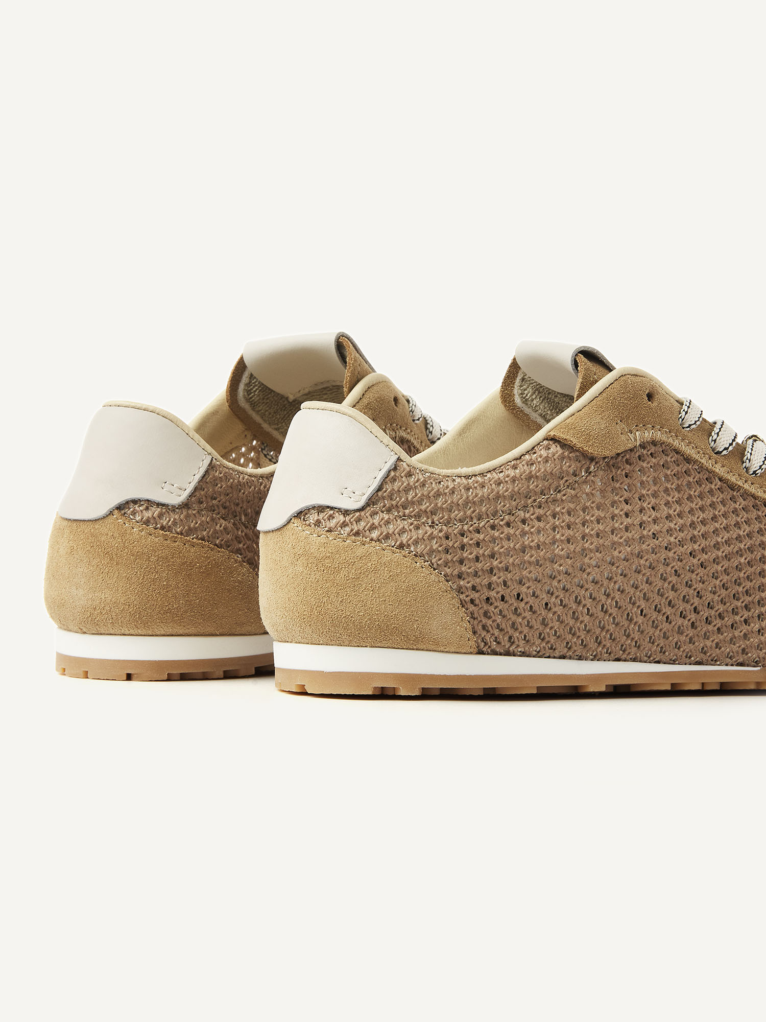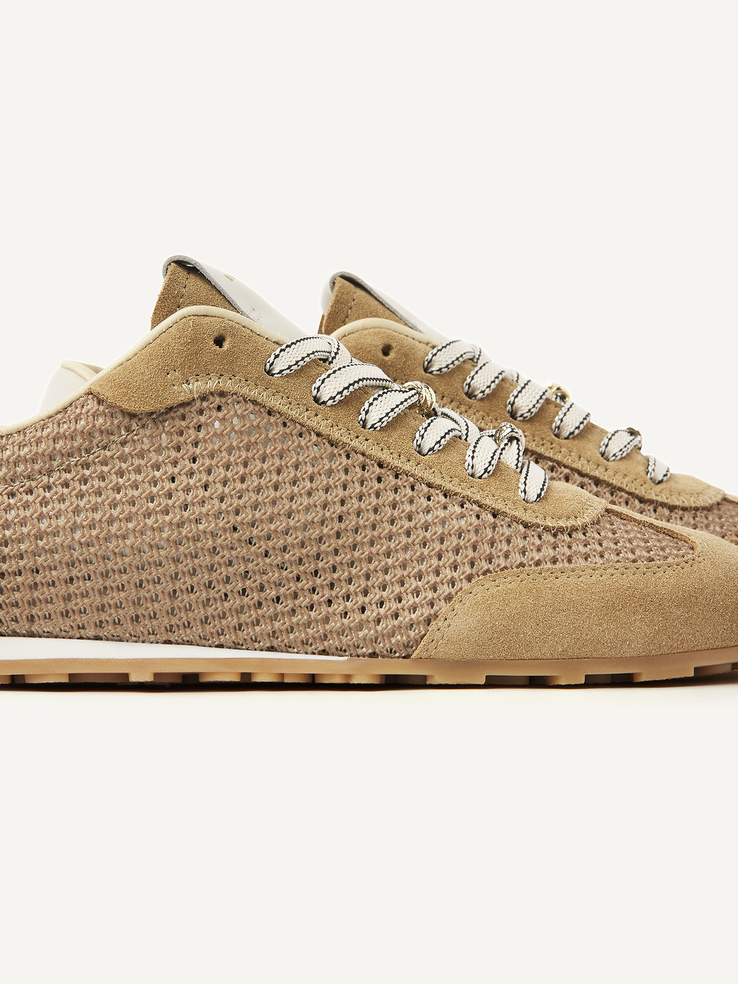 La Billy Lou en mesh topo ofrece comodidad veraniega con mesh transpirable que mantiene los pies frescos en los días calurosos. Los detalles de ante topo aportan a la zapatilla un aspecto natural y lujoso. El cordón beige con línea sutil y los dos charms añaden un toque divertido.