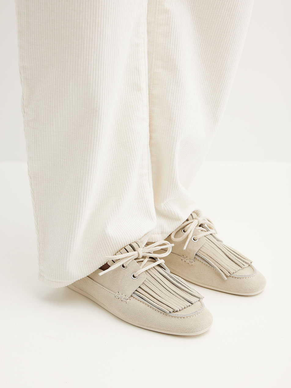 El Joan Macaw en ante blanco roto es la combinación perfecta de frescura, modernidad y estilo atemporal. El ante es suave y flexible, ideal para las temperaturas veraniegas. Los flecos junto con los cordones de algodón cuadrados aportan un toque elegante y desenfadado. La suela de goma ligera y la plantilla extraíble garantizan comodidad y flexibilidad, justo lo que buscas en un slip-on.