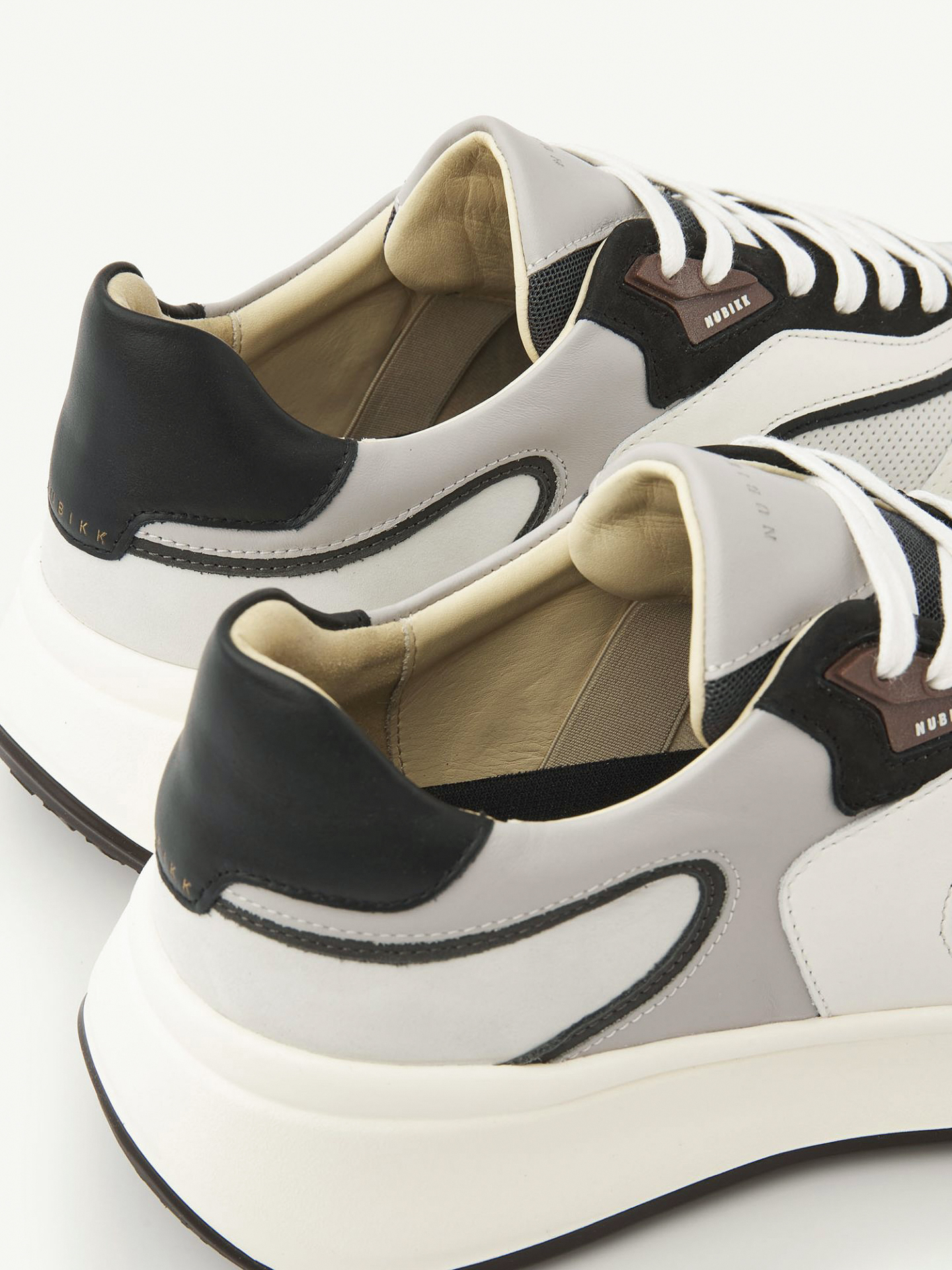 La Luca Noa en blanco y negro es una zapatilla fresca y moderna con contraste gráfico. La combinación de paneles claros y oscuros resalta el diseño en capas, creando un look llamativo pero elegante. Hecha de una mezcla de cuero, ante y malla, y al igual que las otras variantes, cuenta con elásticos en la lengüeta para un fácil y cómodo calzado.