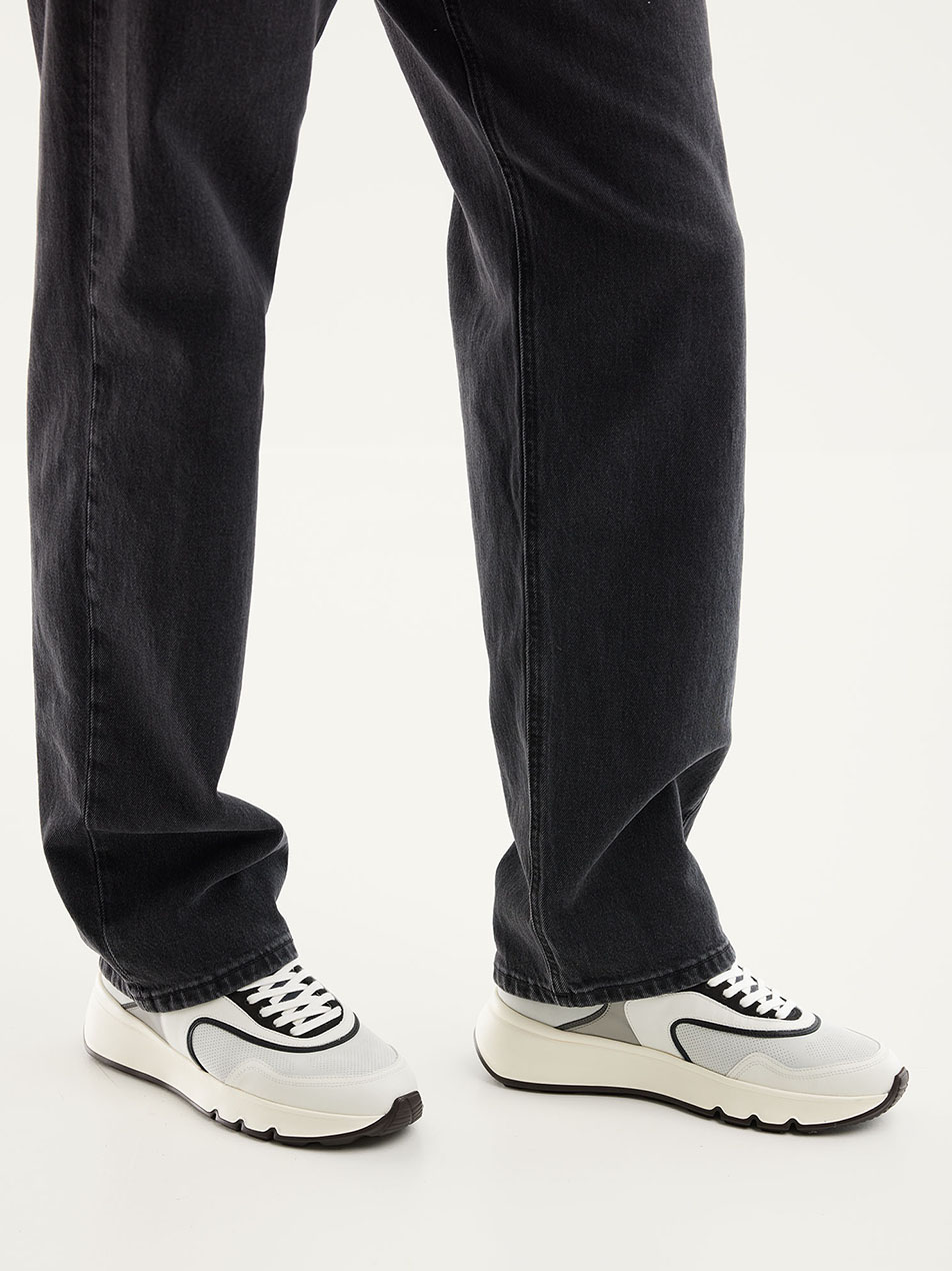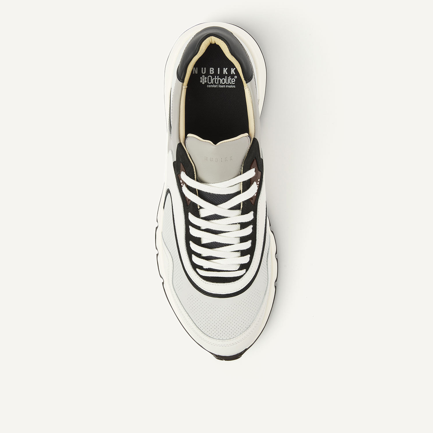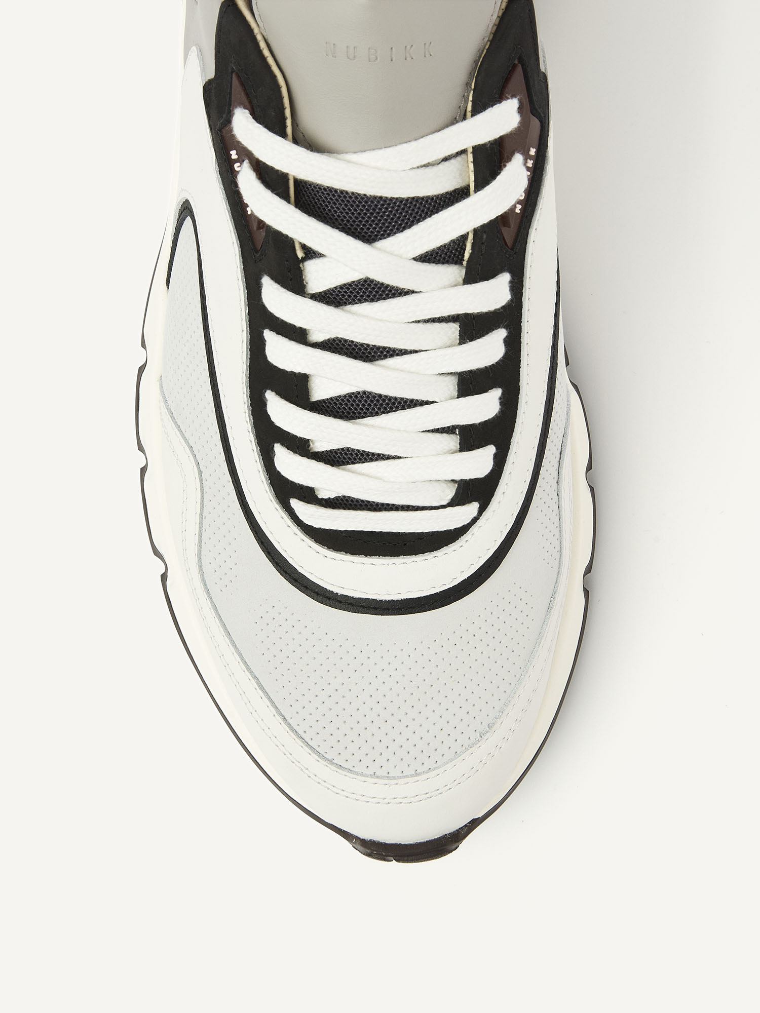 La Luca Noa en blanco y negro es una zapatilla fresca y moderna con contraste gráfico. La combinación de paneles claros y oscuros resalta el diseño en capas, creando un look llamativo pero elegante. Hecha de una mezcla de cuero, ante y malla, y al igual que las otras variantes, cuenta con elásticos en la lengüeta para un fácil y cómodo calzado.