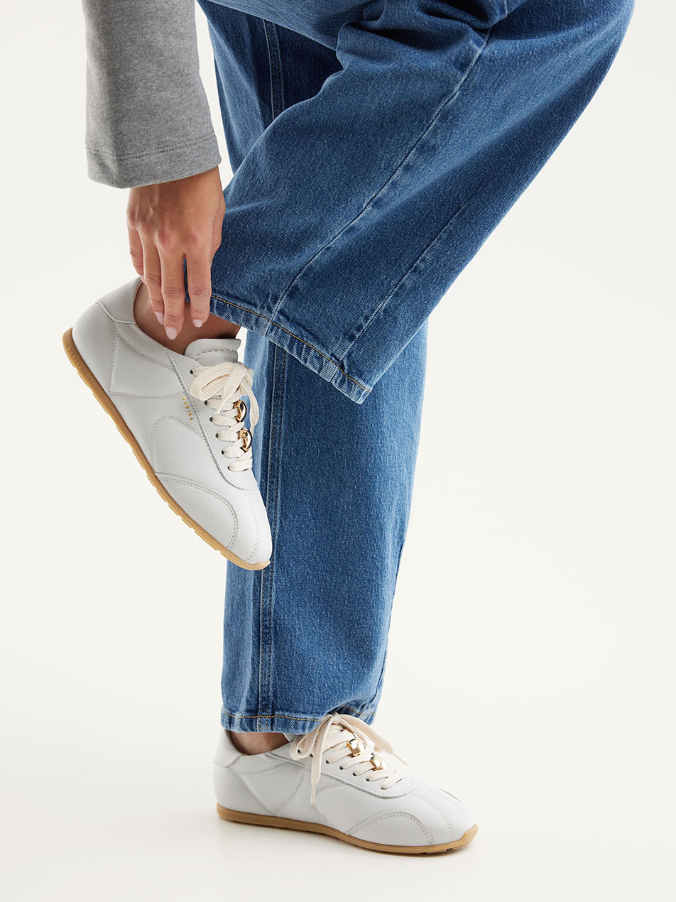 El Riley Rush en cuero gris claro ofrece la comodidad de un diseño acolchado y una suela color miel. El zapato incluye cordones color crema con charms (extraíbles) y un par adicional con detalles negros para variar el estilo.