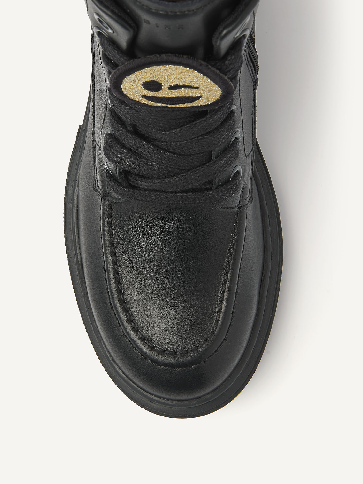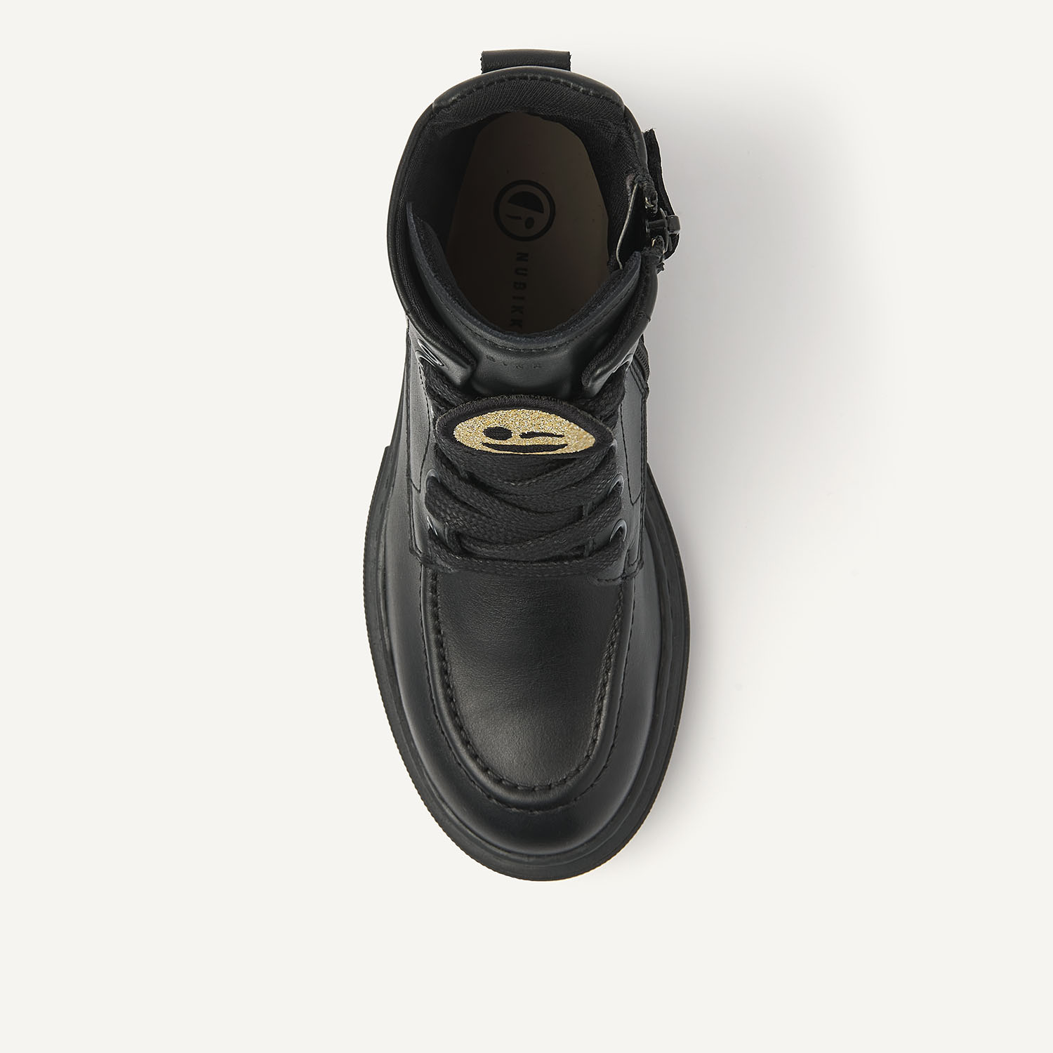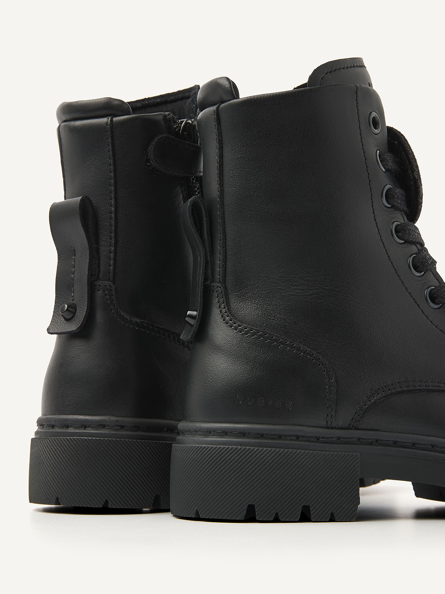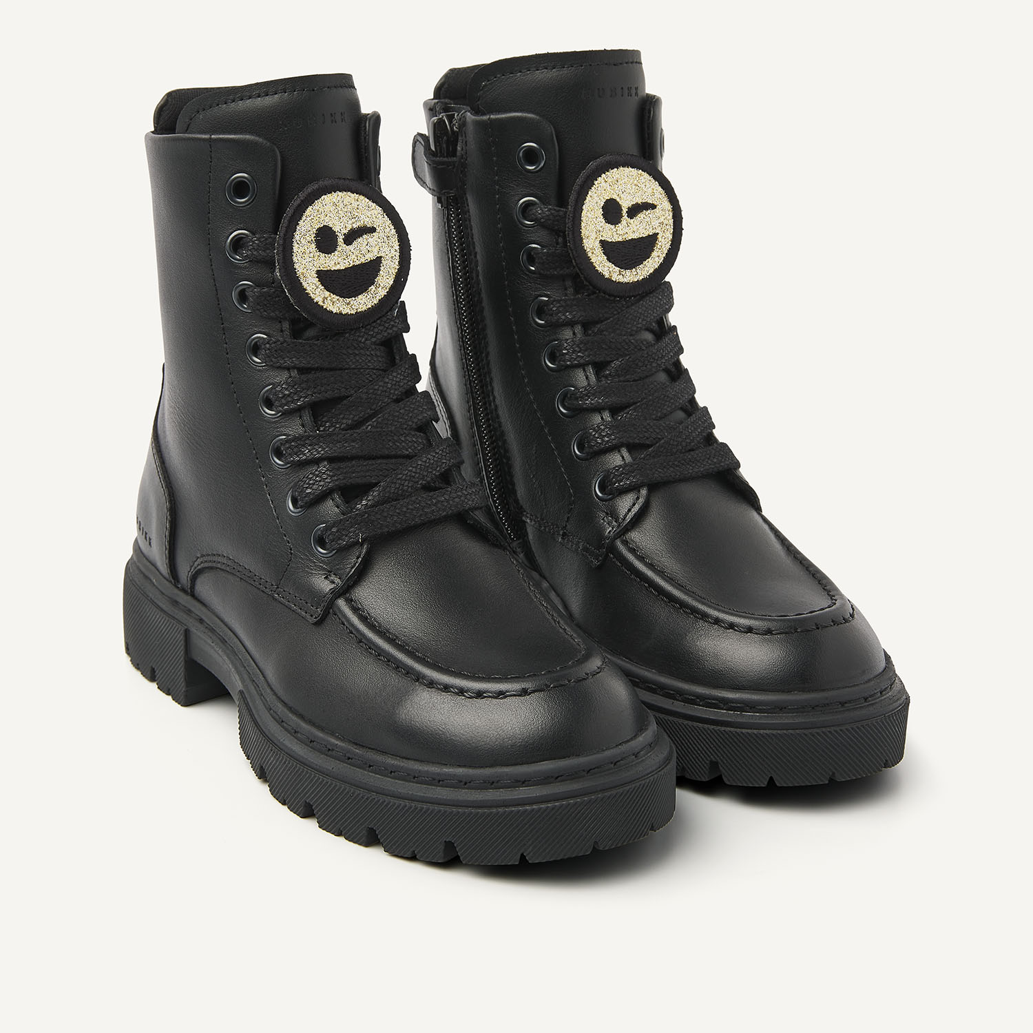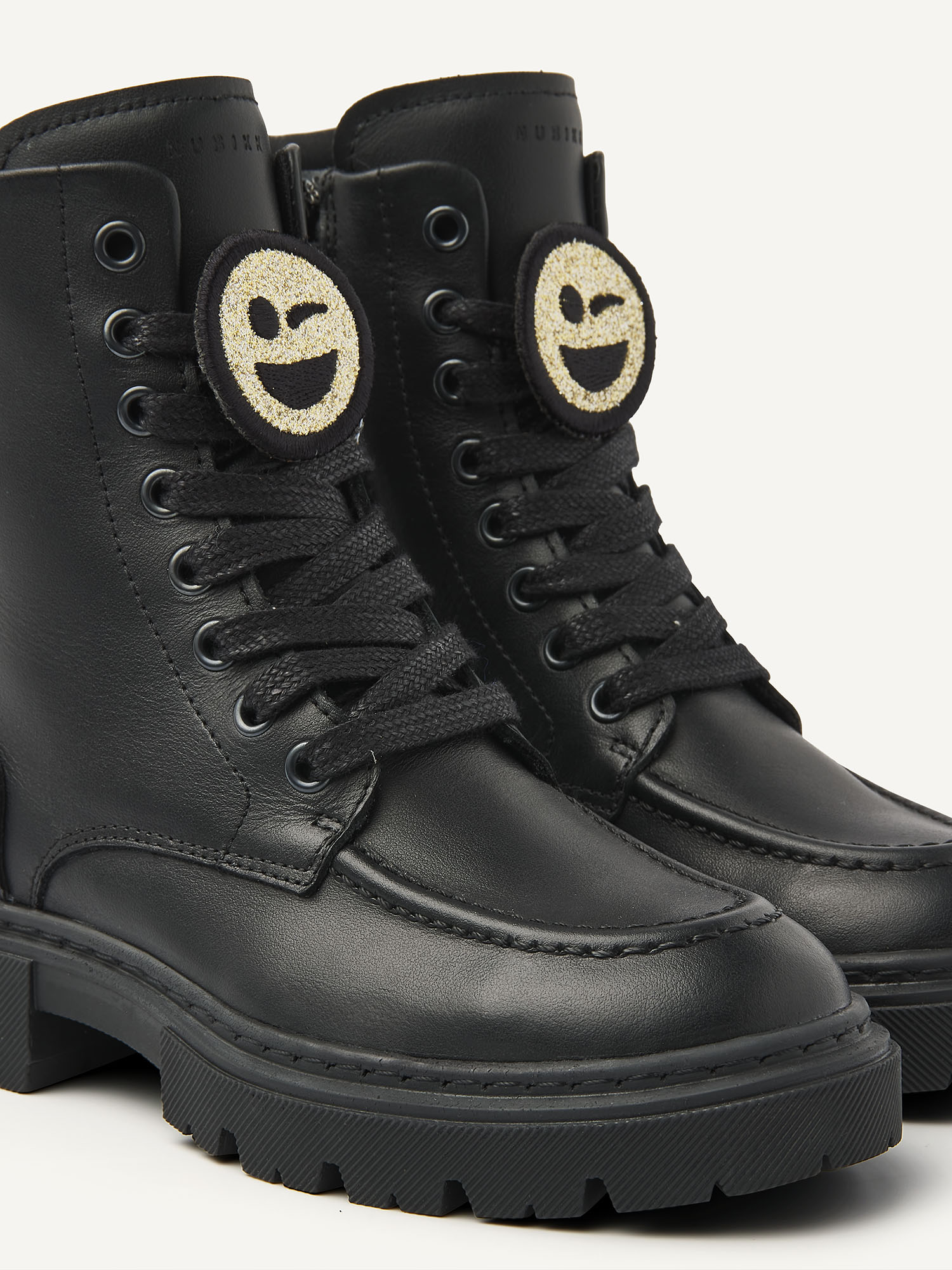 NUBIKK's Fae Bobbi JR zwarte boots voor kids zijn gemaakt van hoogwaardig zwart leer. Deze stijlvolle boots zijn geïnspireerd op de Fae Bobbi voor dames, verkrijgbaar in onze webshop. Deze laars is handgemaakt in Portugal met leer van hoge kwaliteit en heeft een rits aan de zijkant voor gemakkelijk aan- en uittrekken, een lus aan de achterkant voor extra gemak, veters en een toegevoegde smiley op de veter. De chunky maar lichtgewicht zool geeft extra comfort.