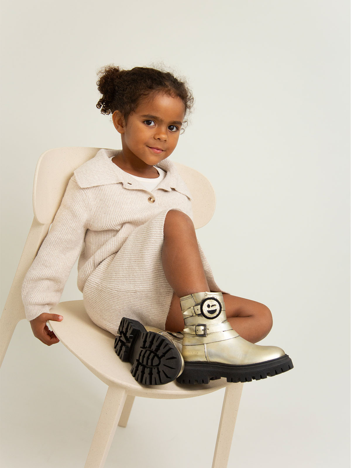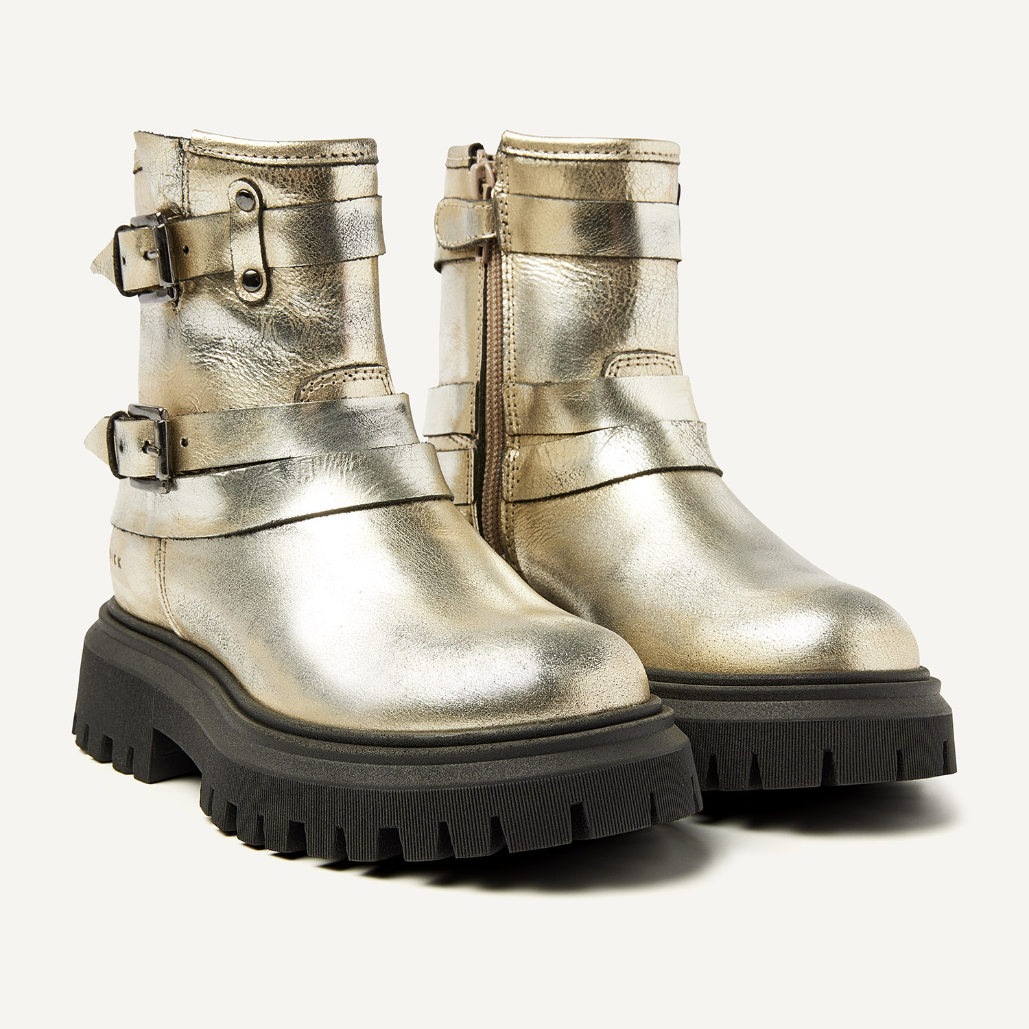 Ontdek NUBIKK's Fae Maryn JR metallic gouden enkellaarzen voor kids. Gemaakt van hoogwaardig metallic goud leer, deze laarzen een gedurfde en stijlvolle touch toe aan elke outfit. geïnspireerd door de Eve Maryn voor volwassenen, de Fae Maryn JR heeft speelse riempjes rond de schacht en een handige ritssluiting aan de zijkant voor moeiteloos draaggemak. De lichte, iets chunky zool zorgt voor comfort gedurende de hele dag, geschikt voor iedere jonge fashionista.