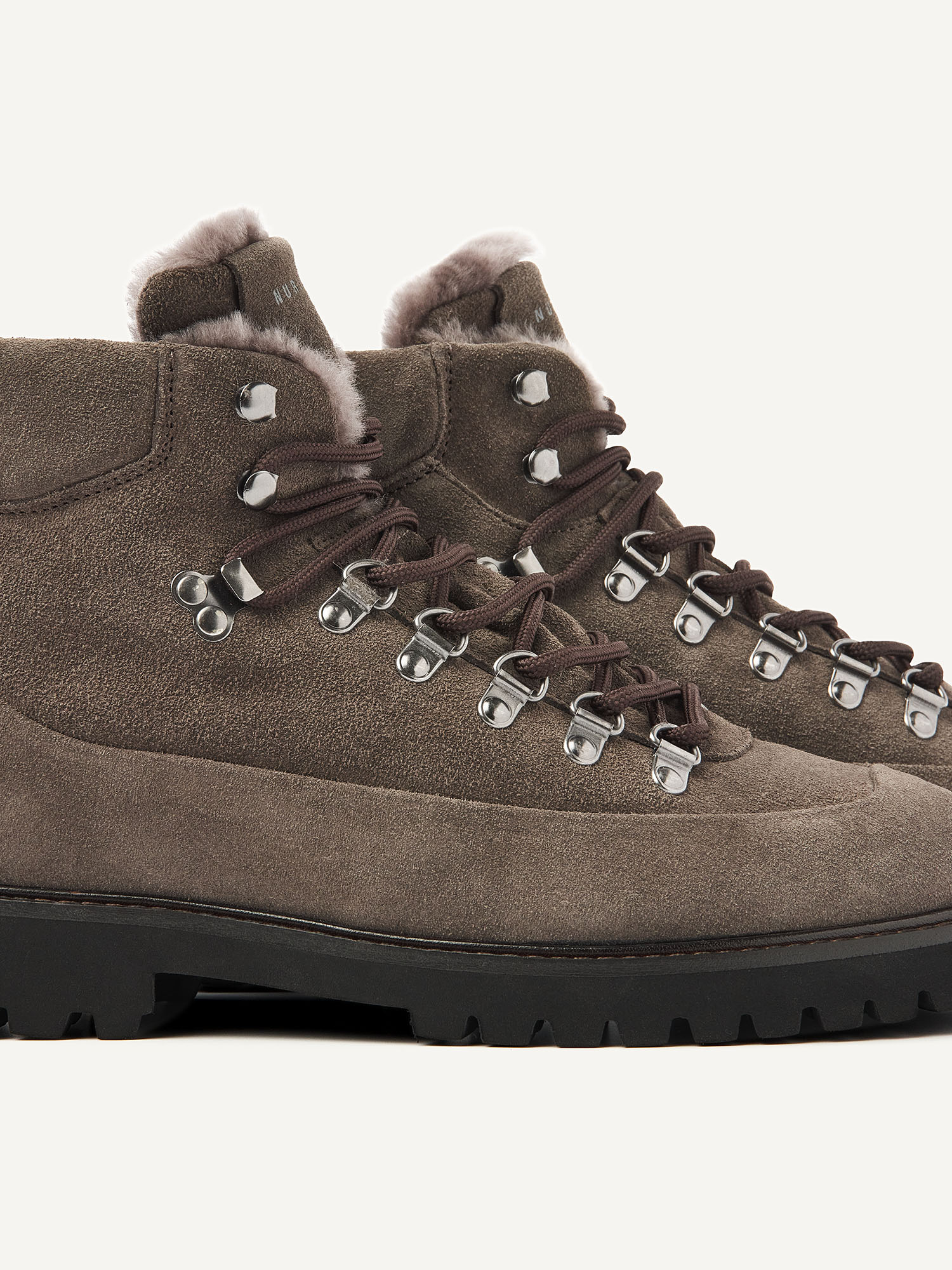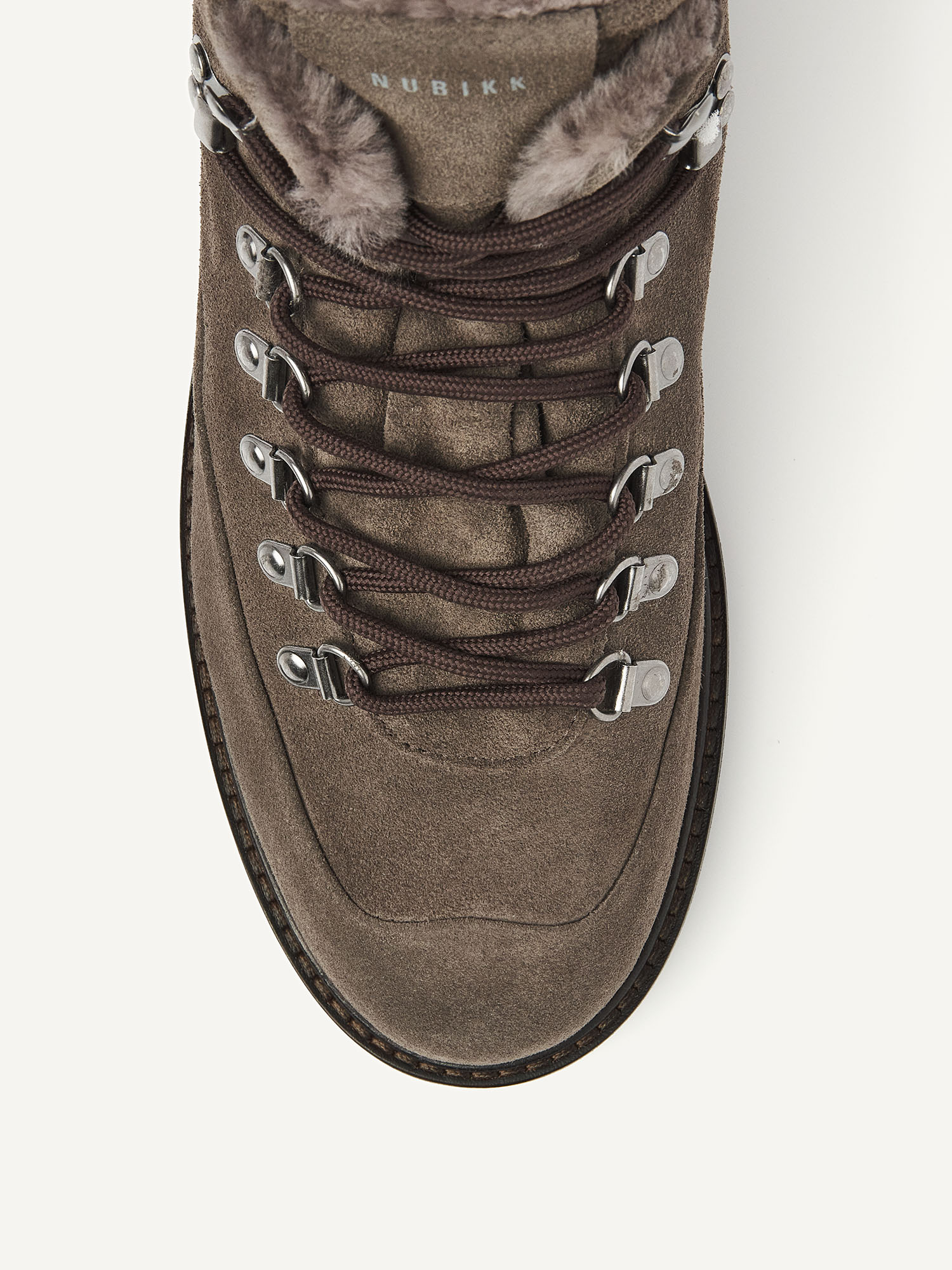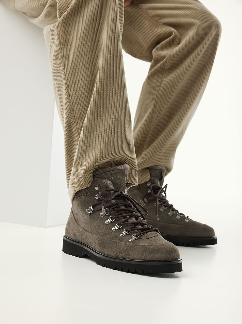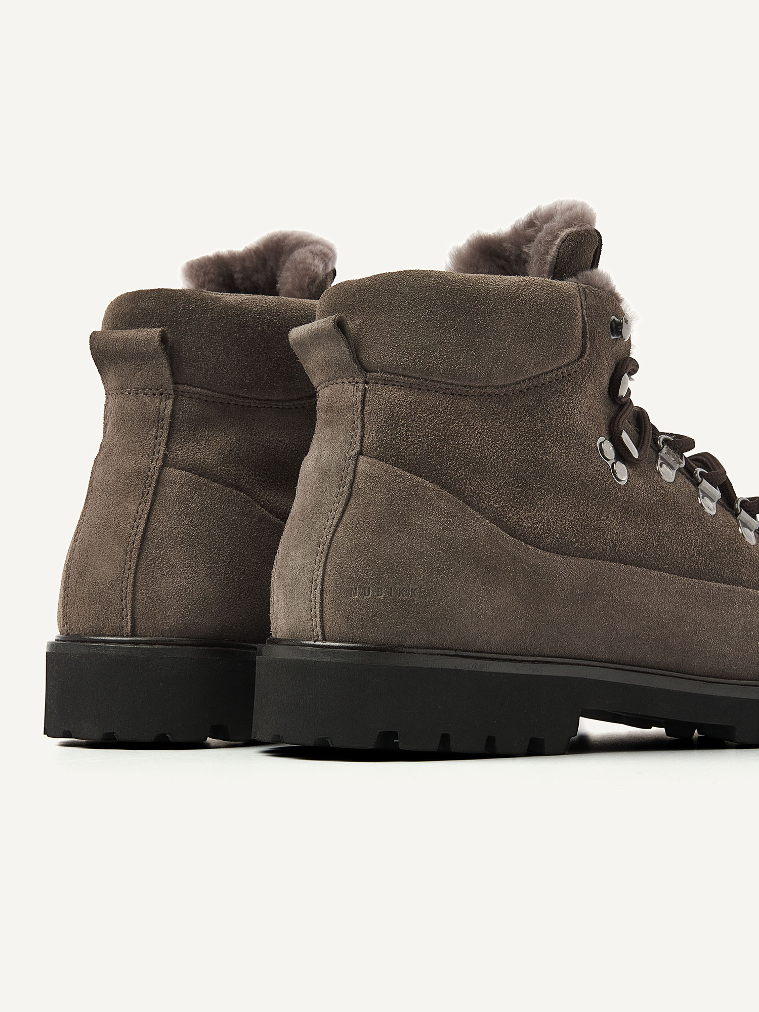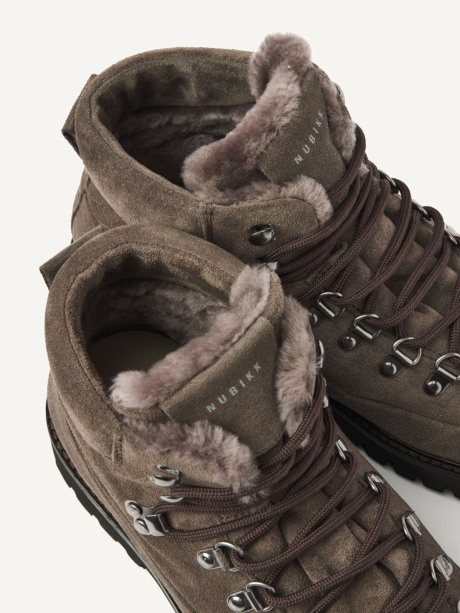 NUBIKK's Logan Chad Fur boots voor heren in donkergrijs suède combineren een robuuste look met winterse warmte. Deze hiking geïnspireerde boots zijn handgemaakt van hoogwaardig Italiaans suède en gevoerd met zachte wol voor extra comfort tijdens koude dagen. De donkergrijze kleur zorgt voor een moderne, veelzijdige uitstraling. Afgewerkt met leren loops aan de achterkant, extra leer op de zijpanelen, een padded bovenkant en D-ring eyelets. De lichtgewicht EVA-buitenzool biedt optimaal draagcomfort.