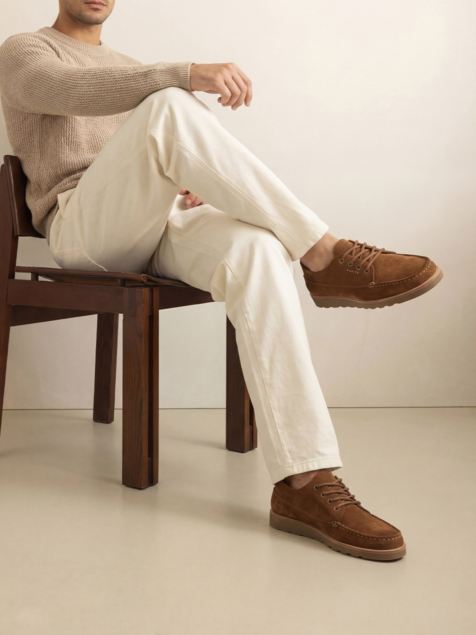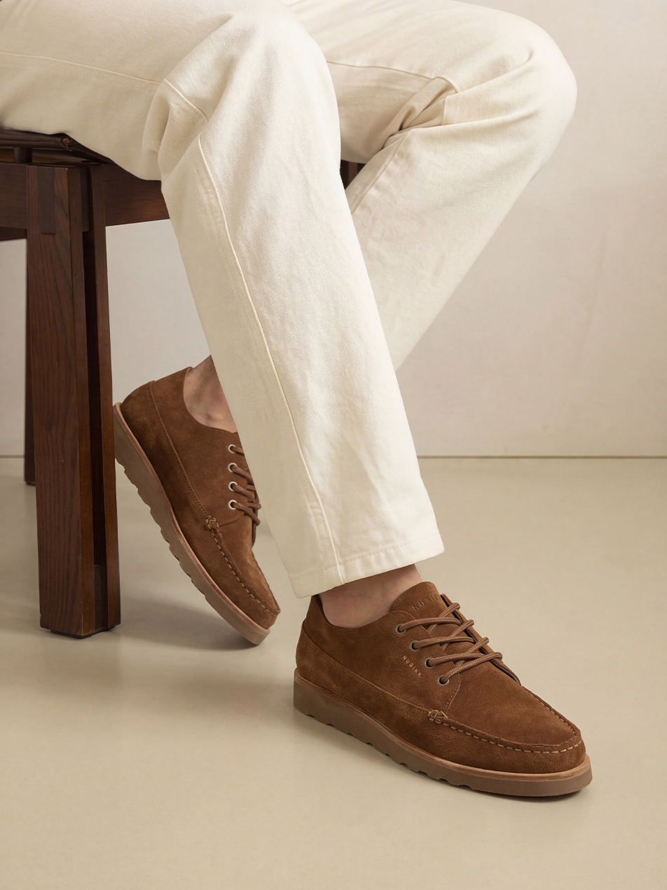 De Milo Macaw in cognac suede heeft een rustige, maar luxe uitstraling en is handgemaakt in Portugal. Het minimalistische design met de signature mock stitch zorgt voor een luxe uitstraling. Licht van gewicht en comfortabel vanaf de eerste stap.