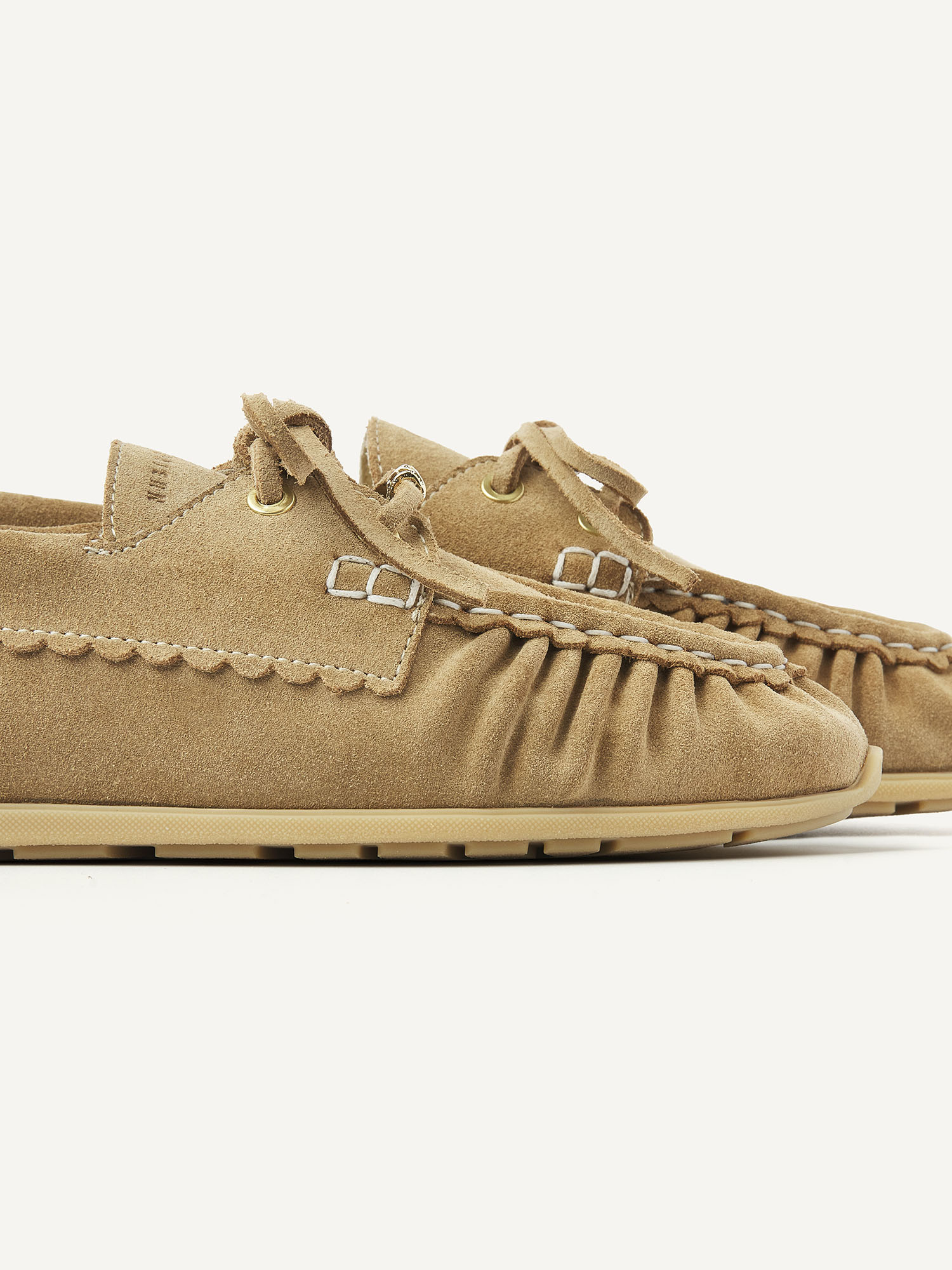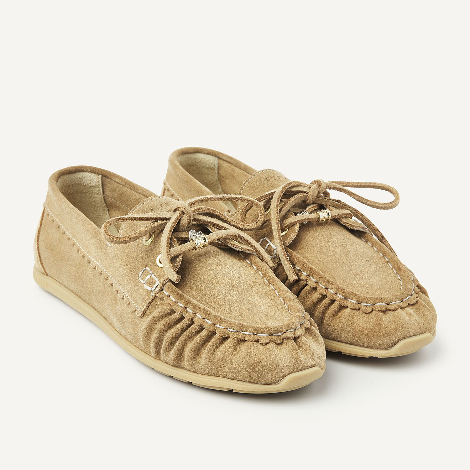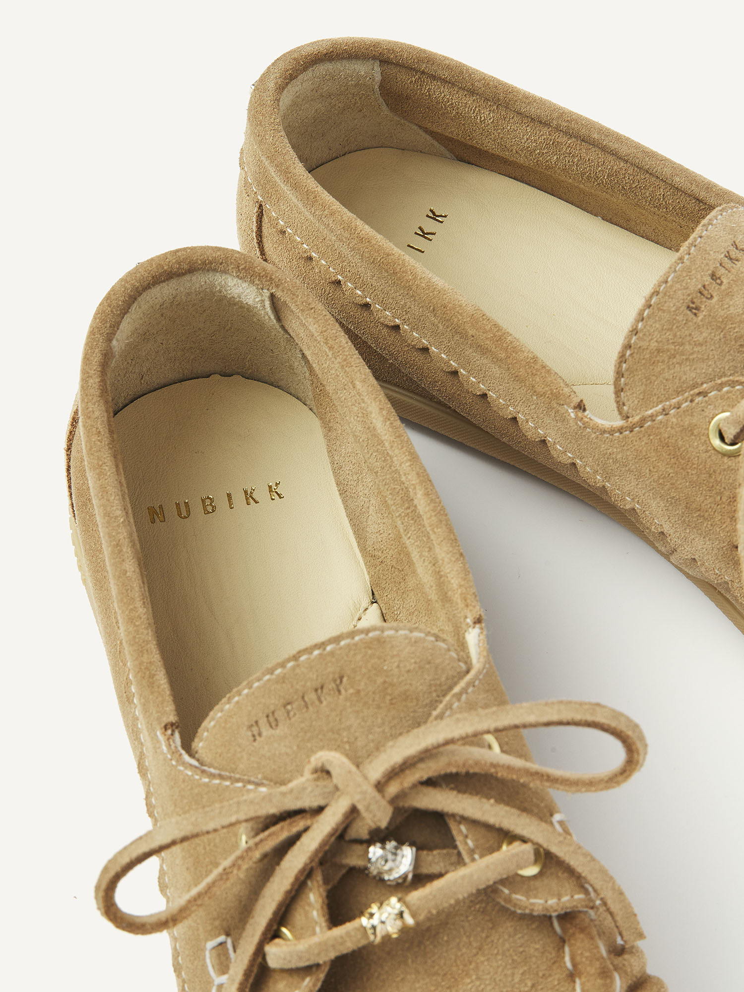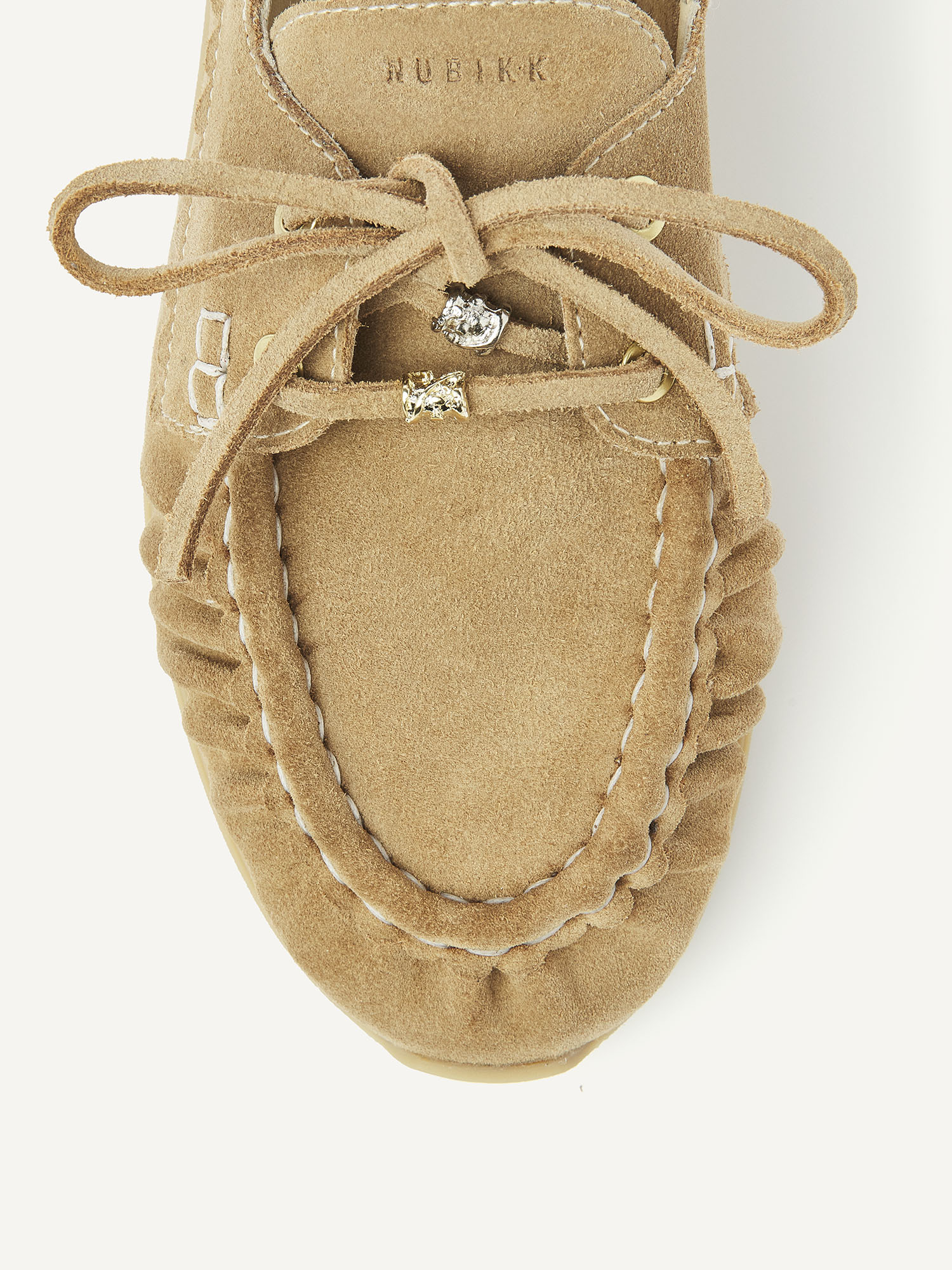De Riley Jade in beige suède is een moderne interpretatie van het klassieke bootschoentje, met verfijnde details. De veter is voorzien van afneembare charms voor een stijlvolle touch. De subtiele plooitjes op de wreef en de half-moan afwerking met contrasterende mockstitch geven het ontwerp een unieke, handgemaakte uitstraling. Gouden NUBIKK-branding en gouden eyelatches maken het geheel elegant af.