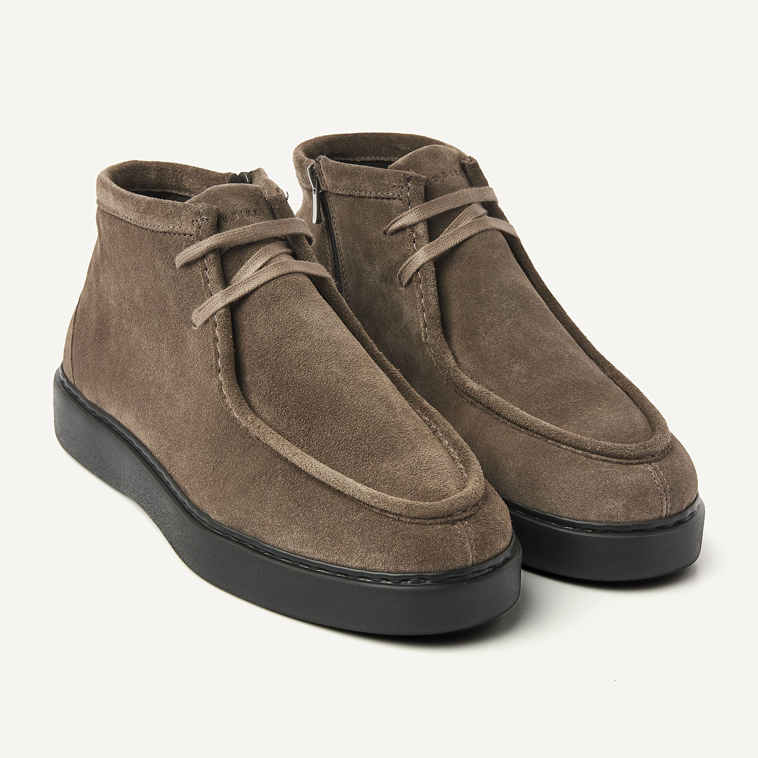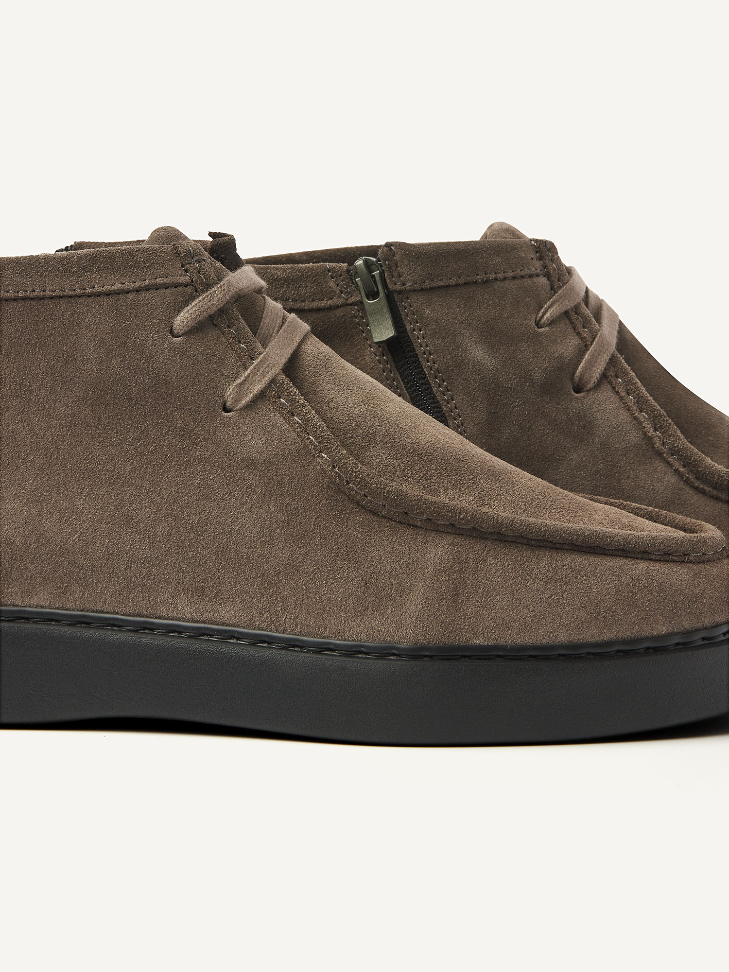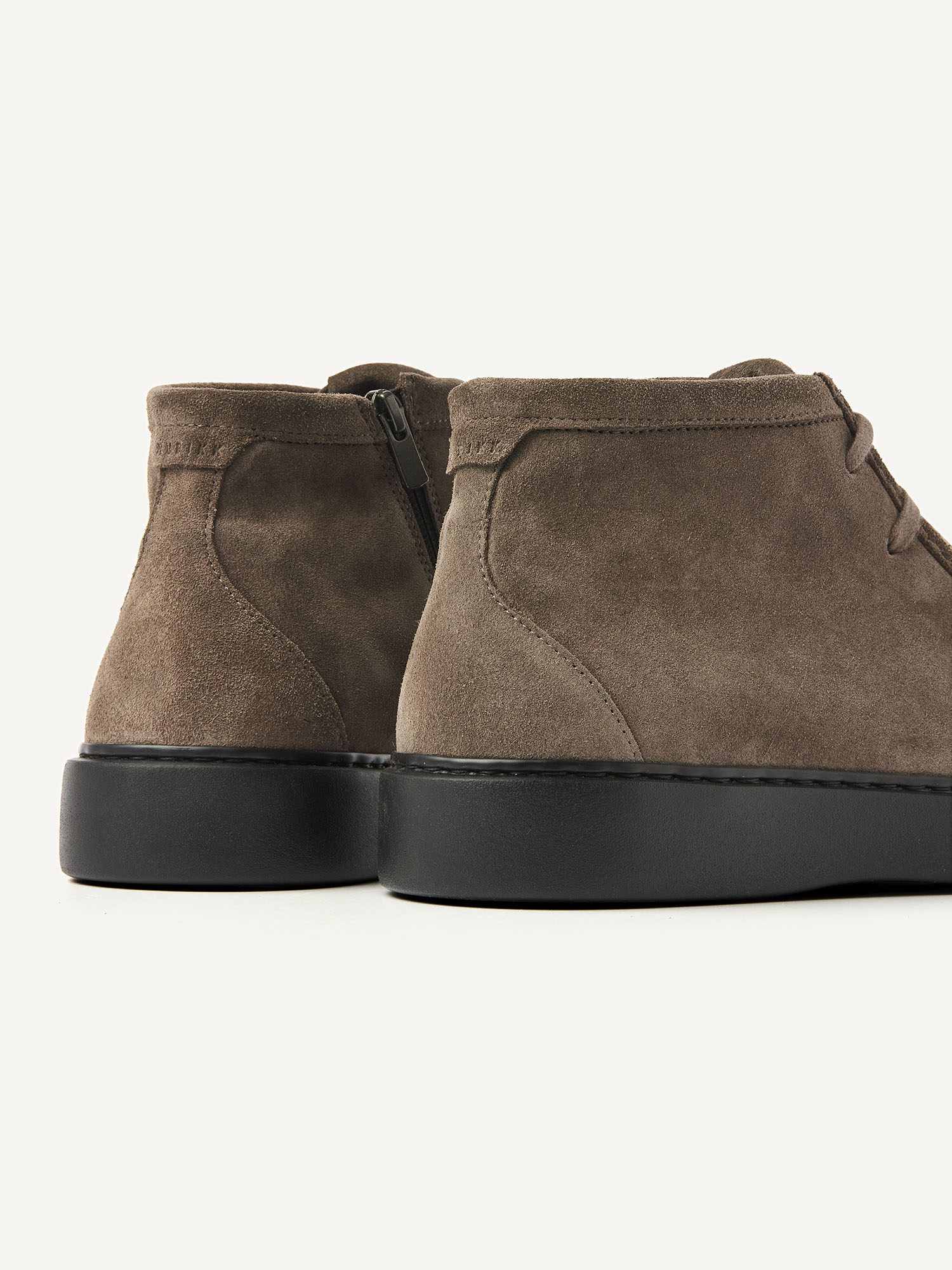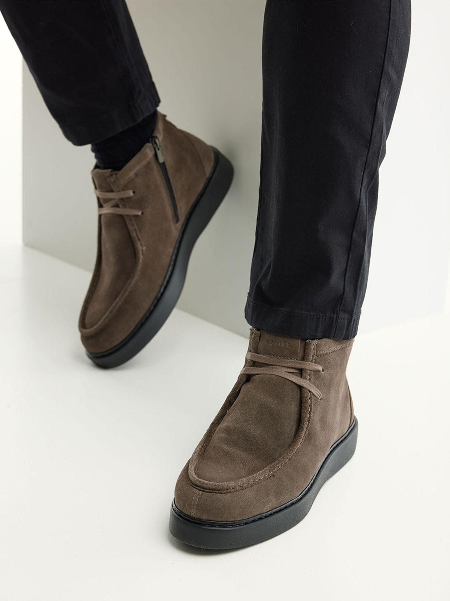 De Steve Ryan Mid in dark grey suède is een eigentijdse interpretatie van de klassieke desert boot. Gemaakt van hoogwaardig suède en voorzien van een zwarte zool, biedt deze schoen een perfecte balans tussen stijl en comfort. De minimalistische belijning en mid-top silhouet geven een moderne twist aan een tijdloze look. Combineer met een jeans of chino voor een verfijnde casual outfit.