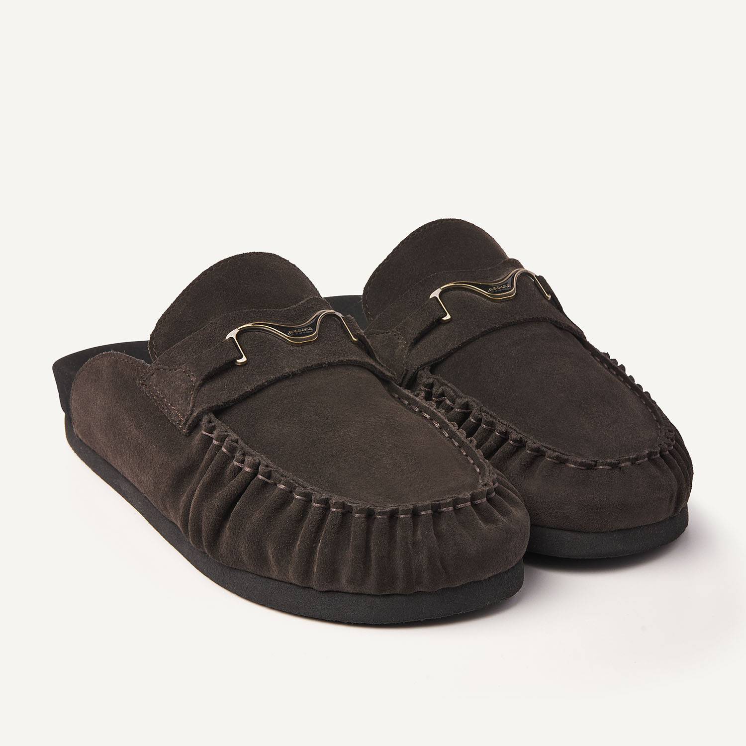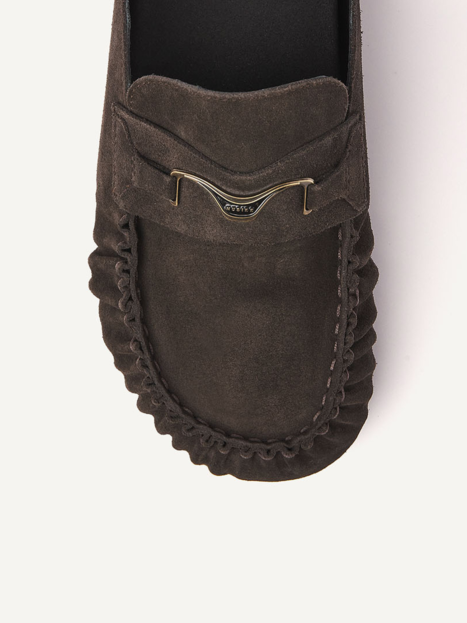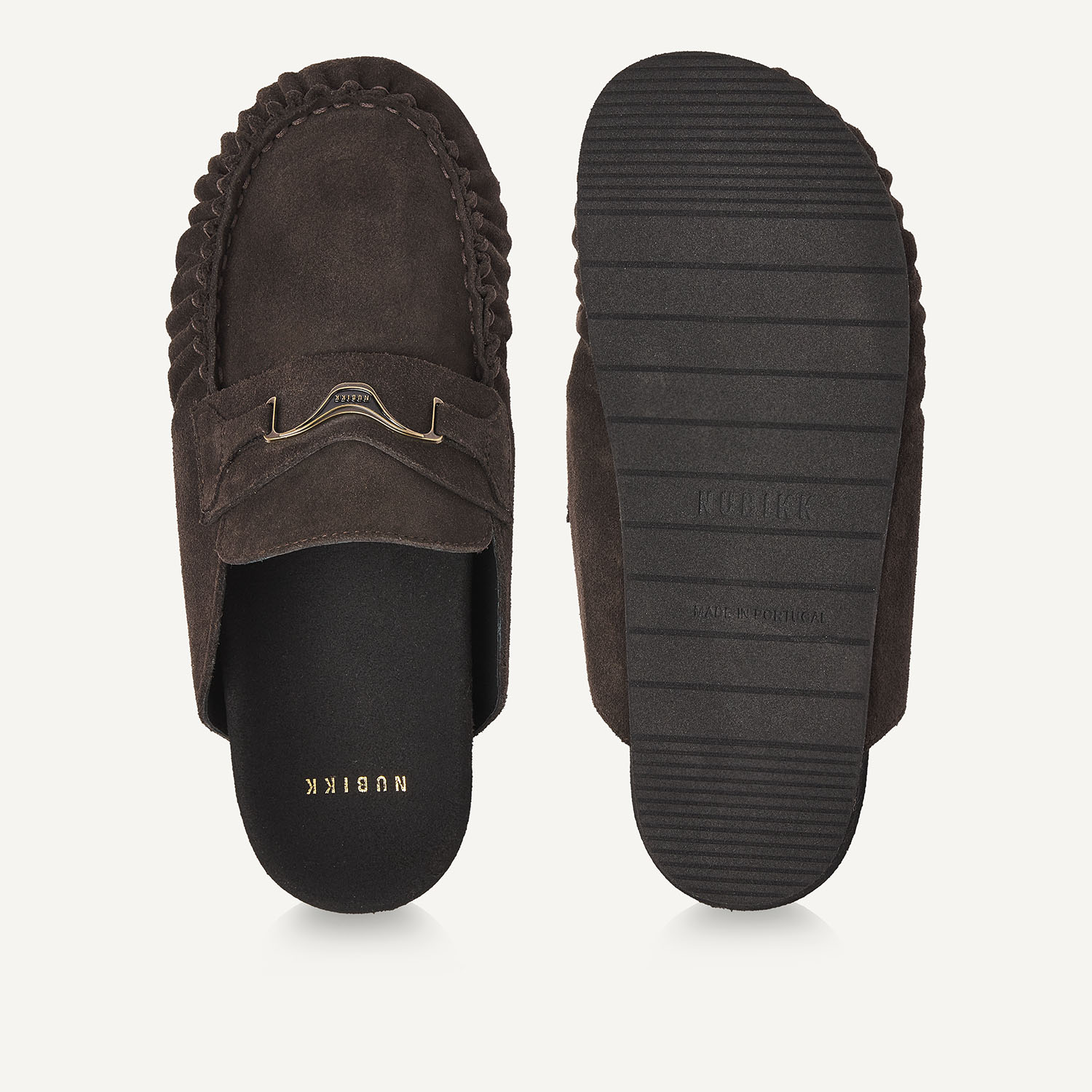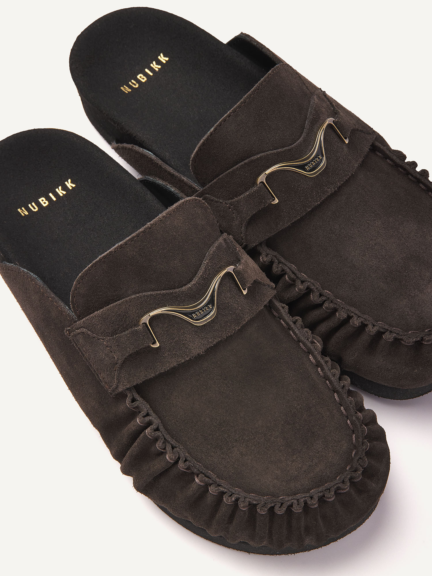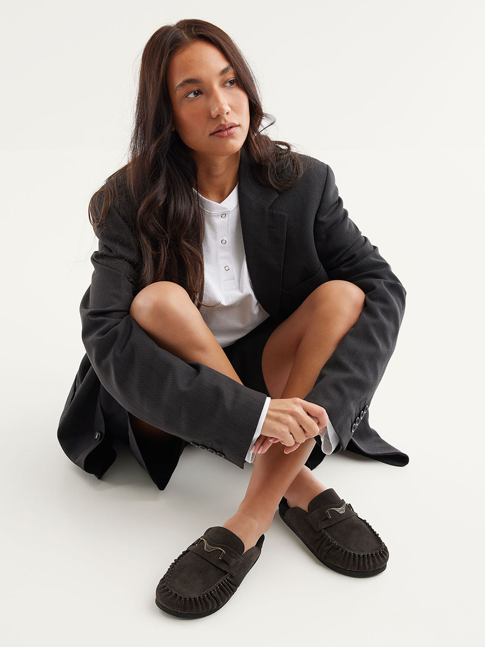 De Teddy Noa combineert comfort met een tijdloos design. Het donkerbruine suede en het NUBIKK hardware detail geven de slipper een rijke uitstraling, afgewerkt met een zwarte zool voor een clean geheel.
