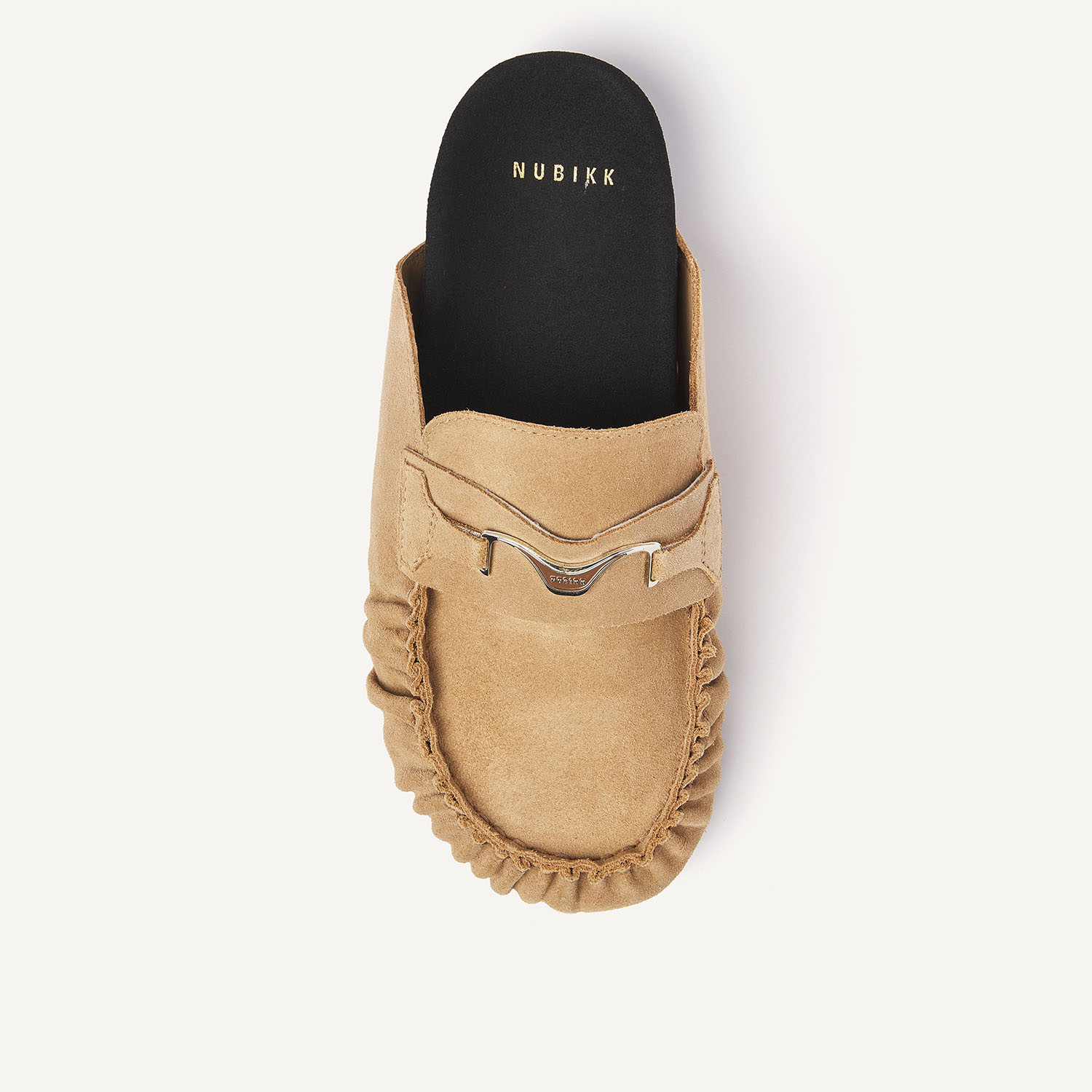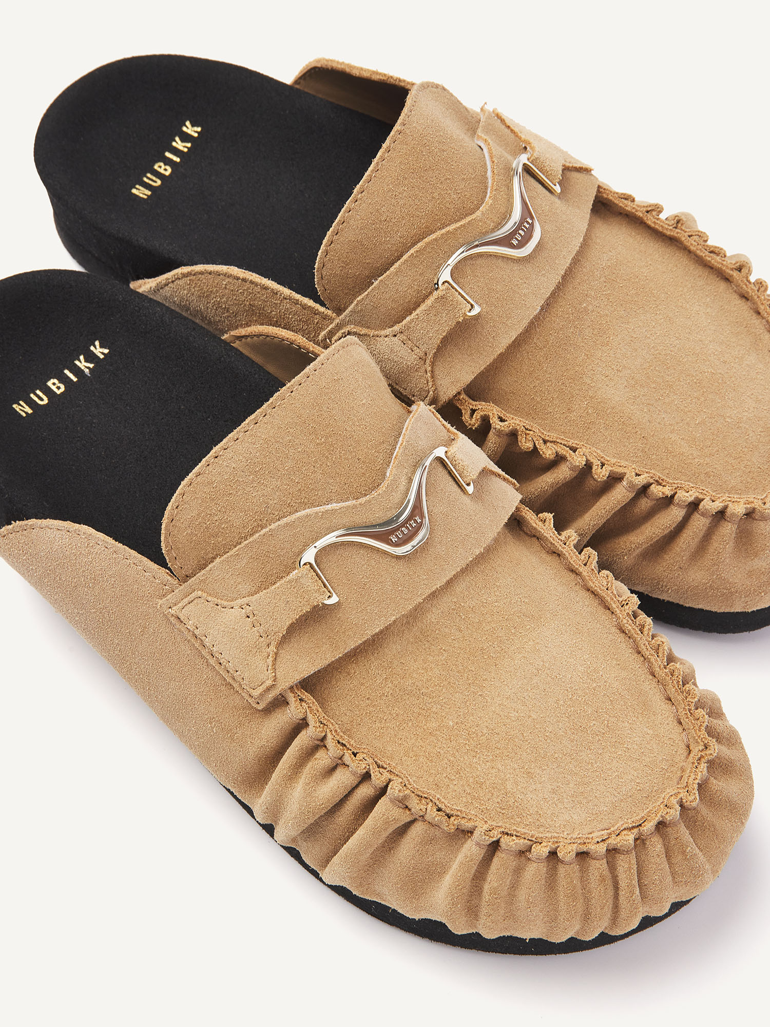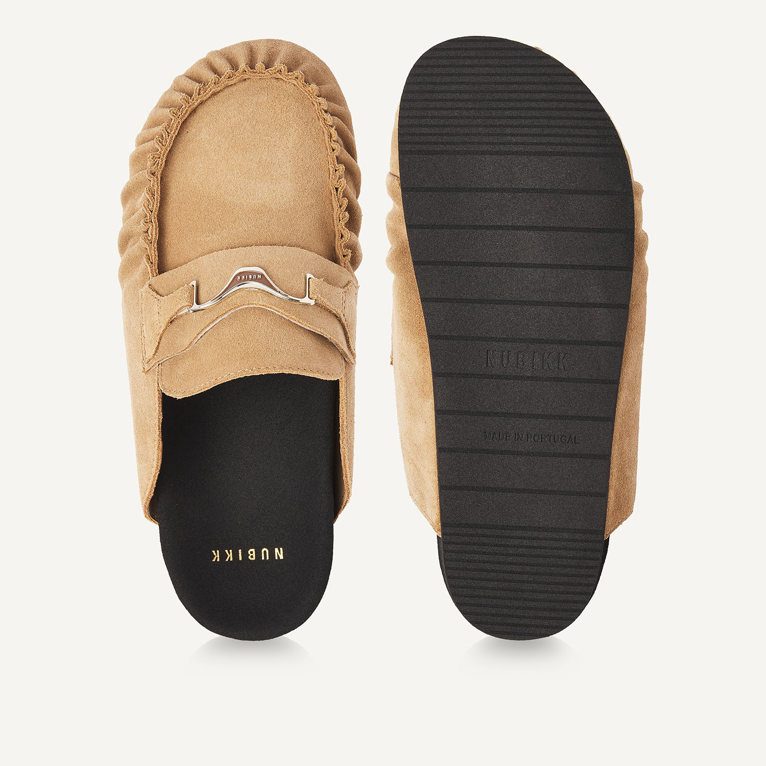 De Teddy Noa is een slip-on met een zachte, luxe uitstraling. Het oak suede en het subtiele NUBIKK hardware detail geven de slipper een verfijnde look, terwijl de zwarte zool zorgt voor een modern contrast.
