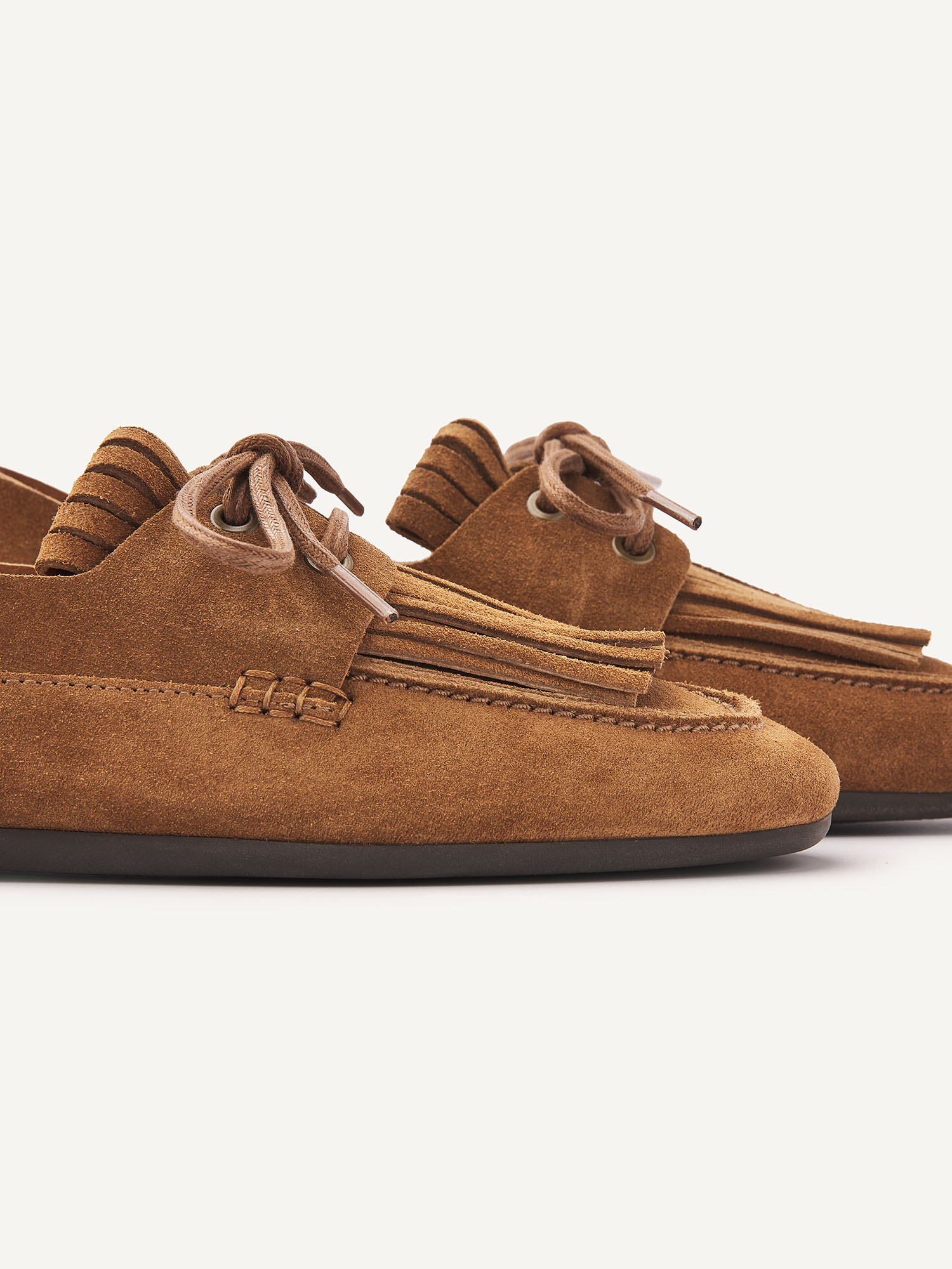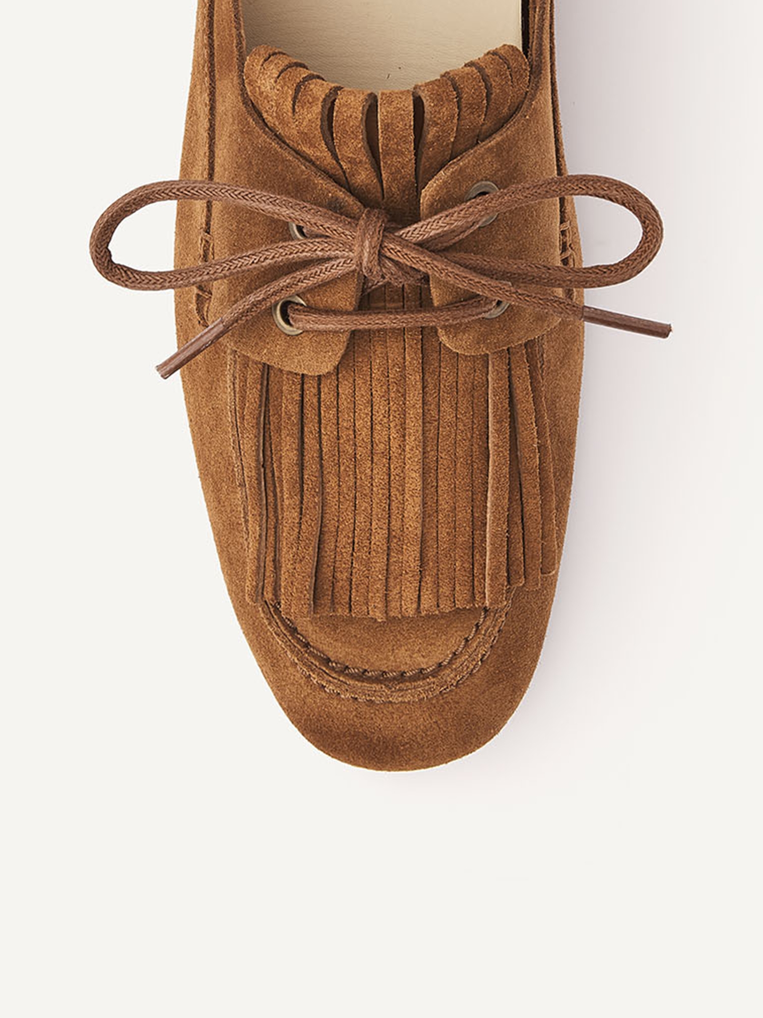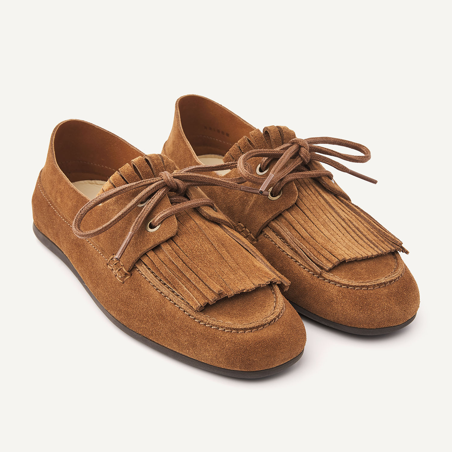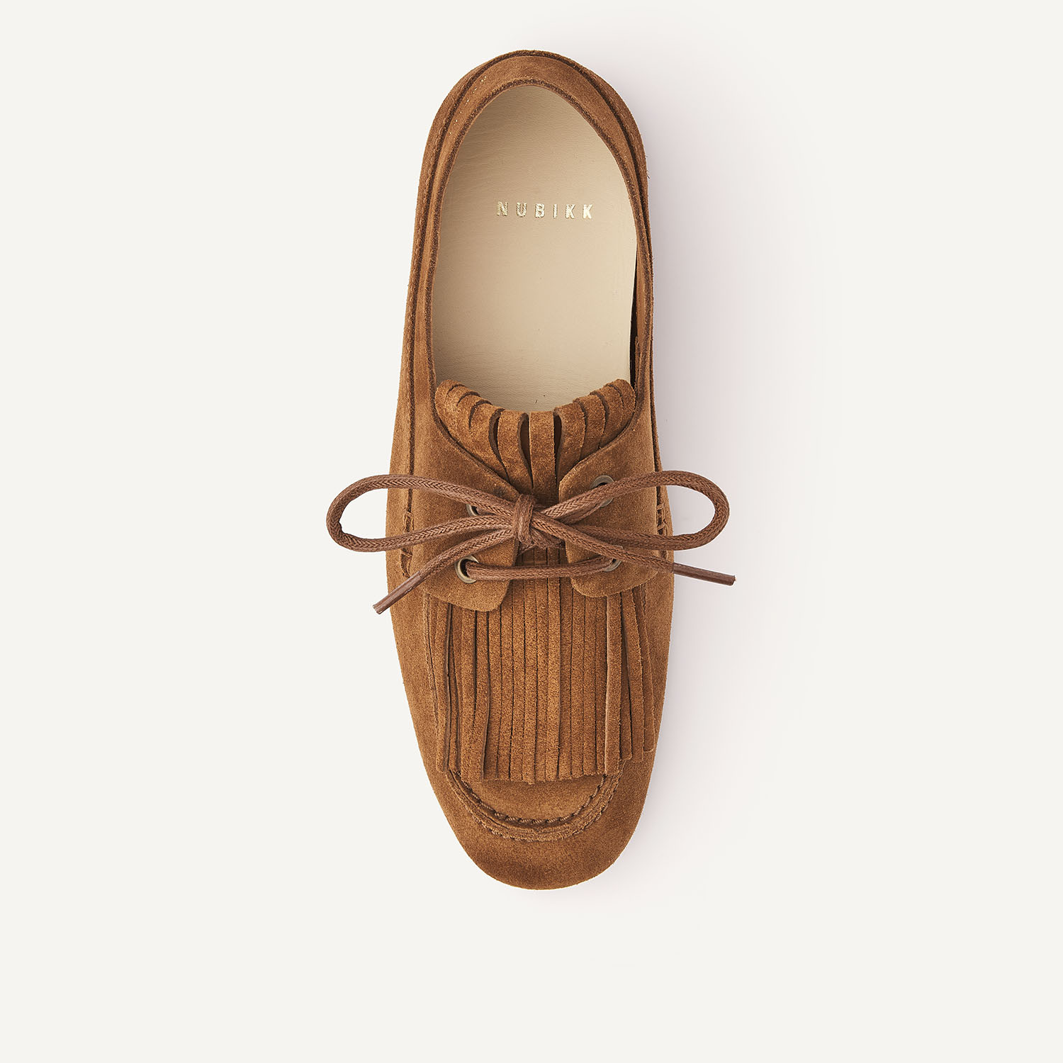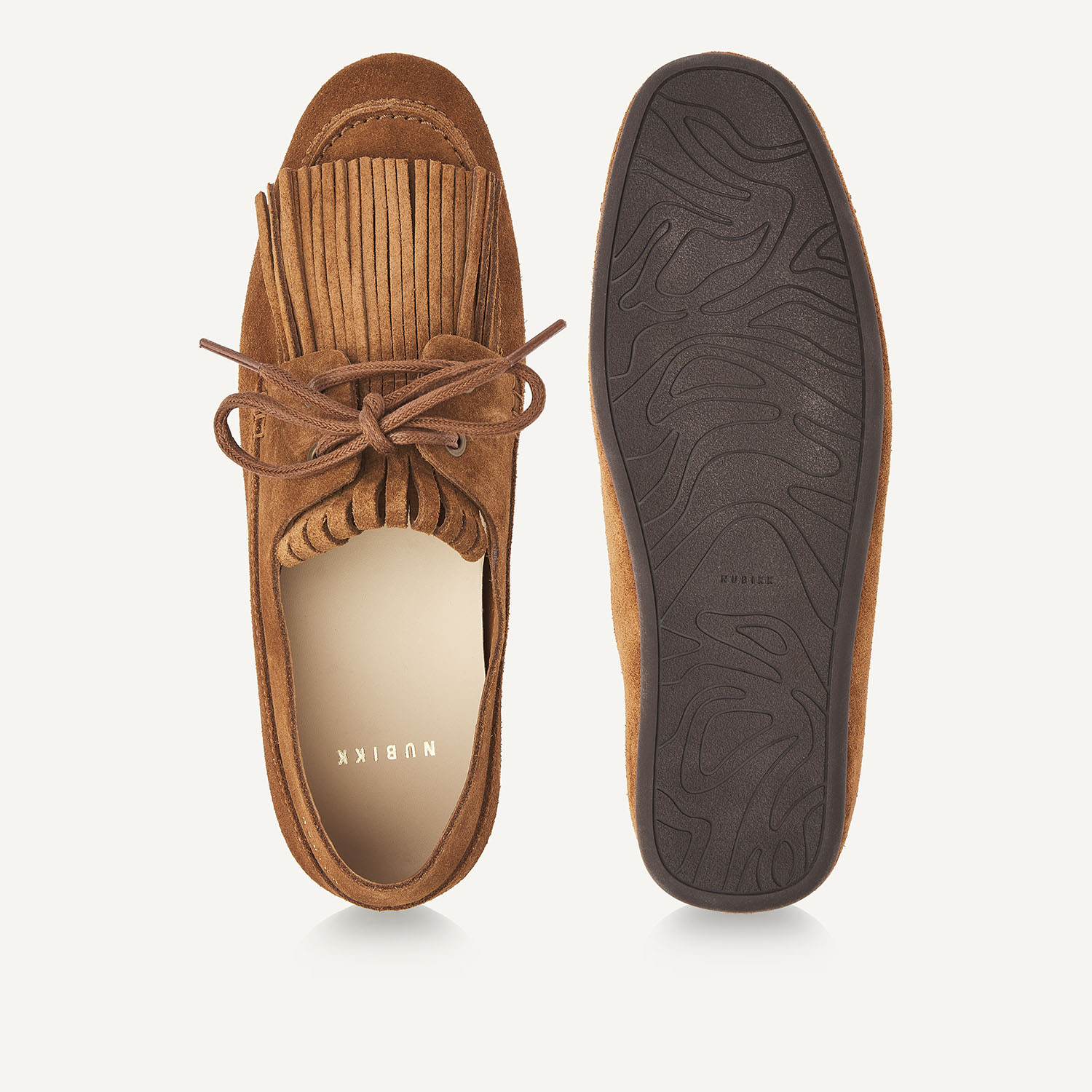 De Joan Macaw in cognac suède straalt warmte en verfijning uit. Het zachte, dikker uitgevoerde suède, opgebouwd uit één laag leer, maakt deze instapper soepel en comfortabel. De franjes en vierkante katoenen veter voegen een uniek, handgemaakt karakter toe. Dankzij de rubberen zool en het uitneembare voetbed geniet je van veel draagplezier, de hele dag door.