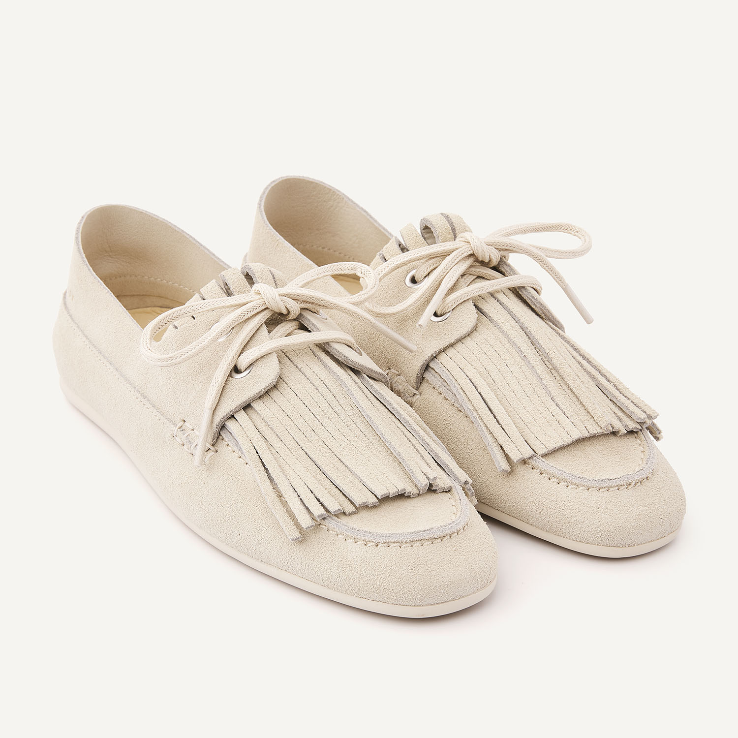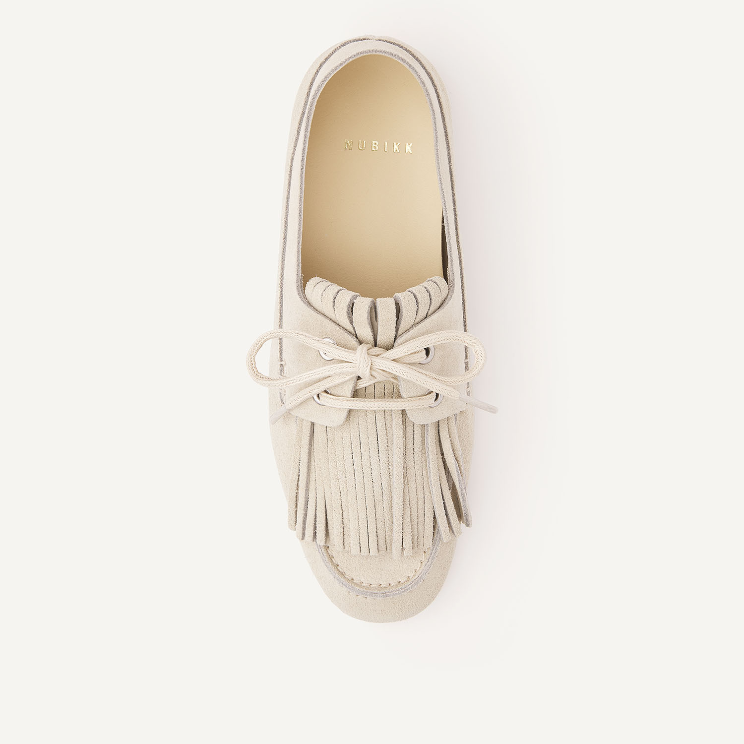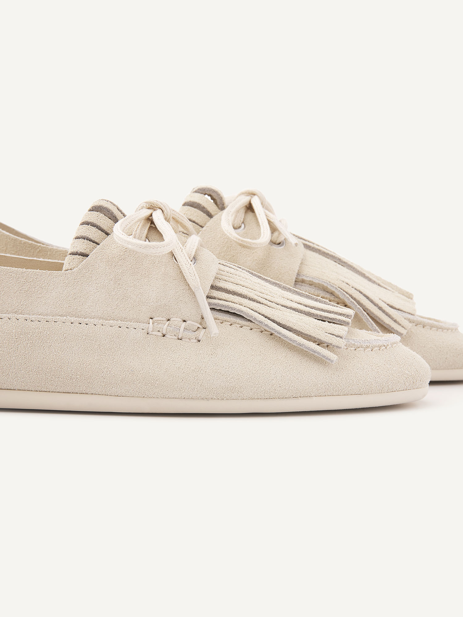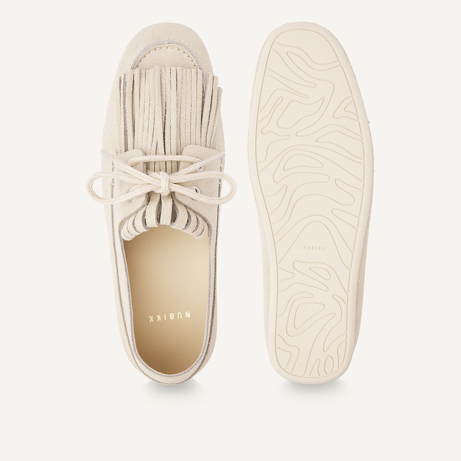 De Joan Macaw in off white suède is de perfecte mix tussen fris, modern en tijdloos. Het suède voelt zacht en soepel aan, ideaal voor zomerse temperaturen. De fringes met de vierkante katoenen veter geven deze instapper een stijlvolle, nonchalante twist. Een lichte rubberen zool en een uitneembare insole zorgen voor comfort en flexibiliteit precies wat je wilt in een slip-on.