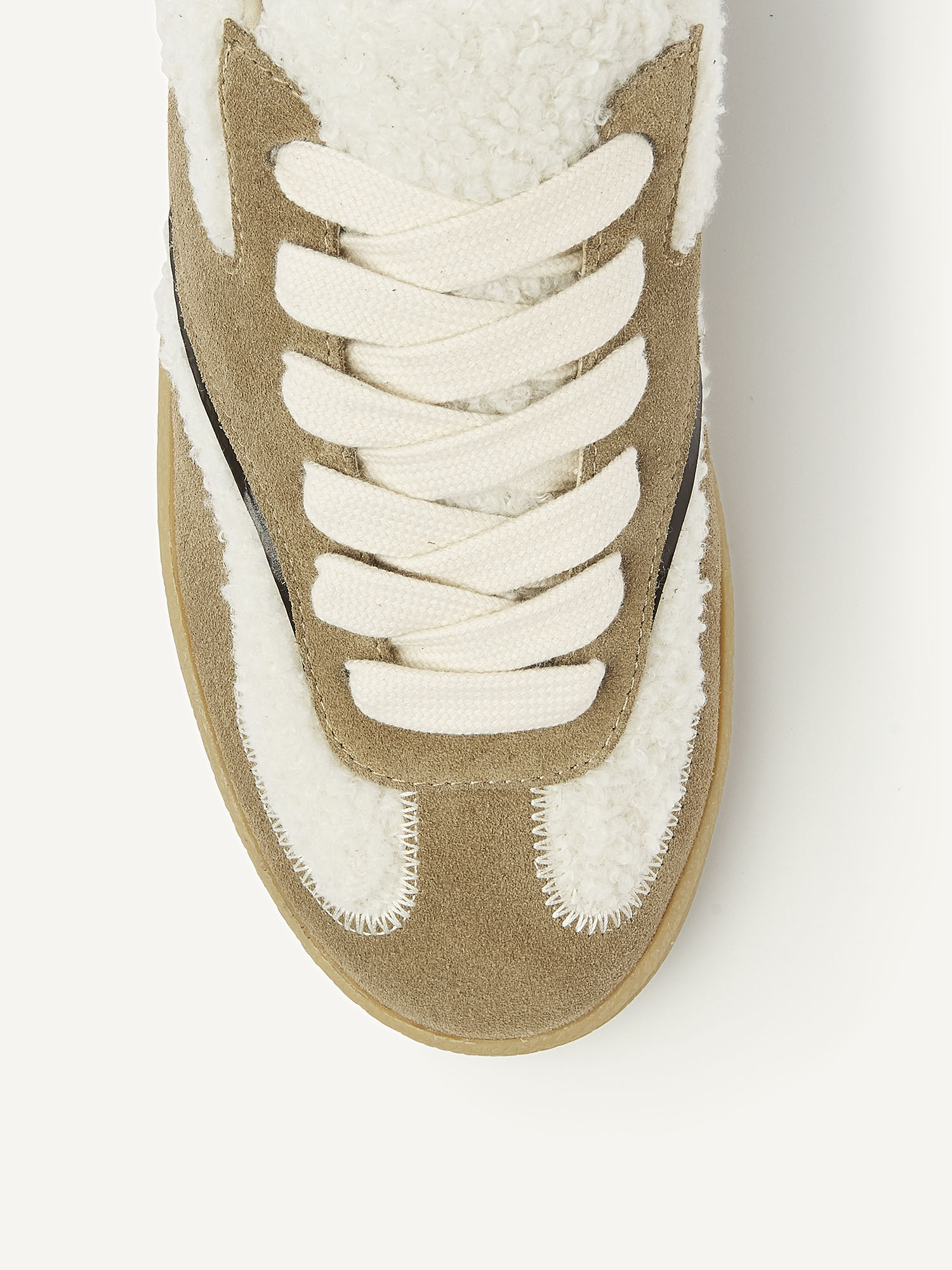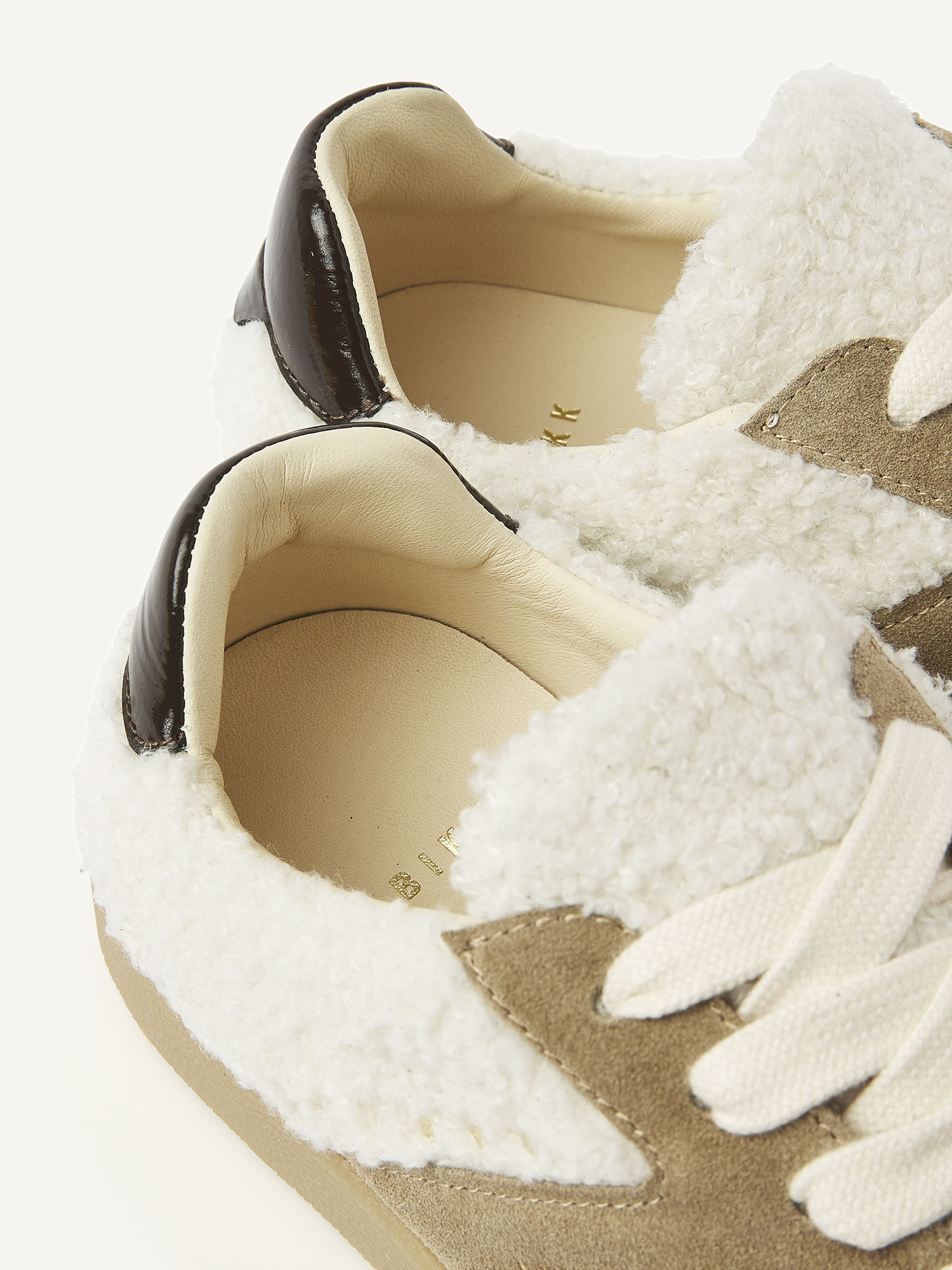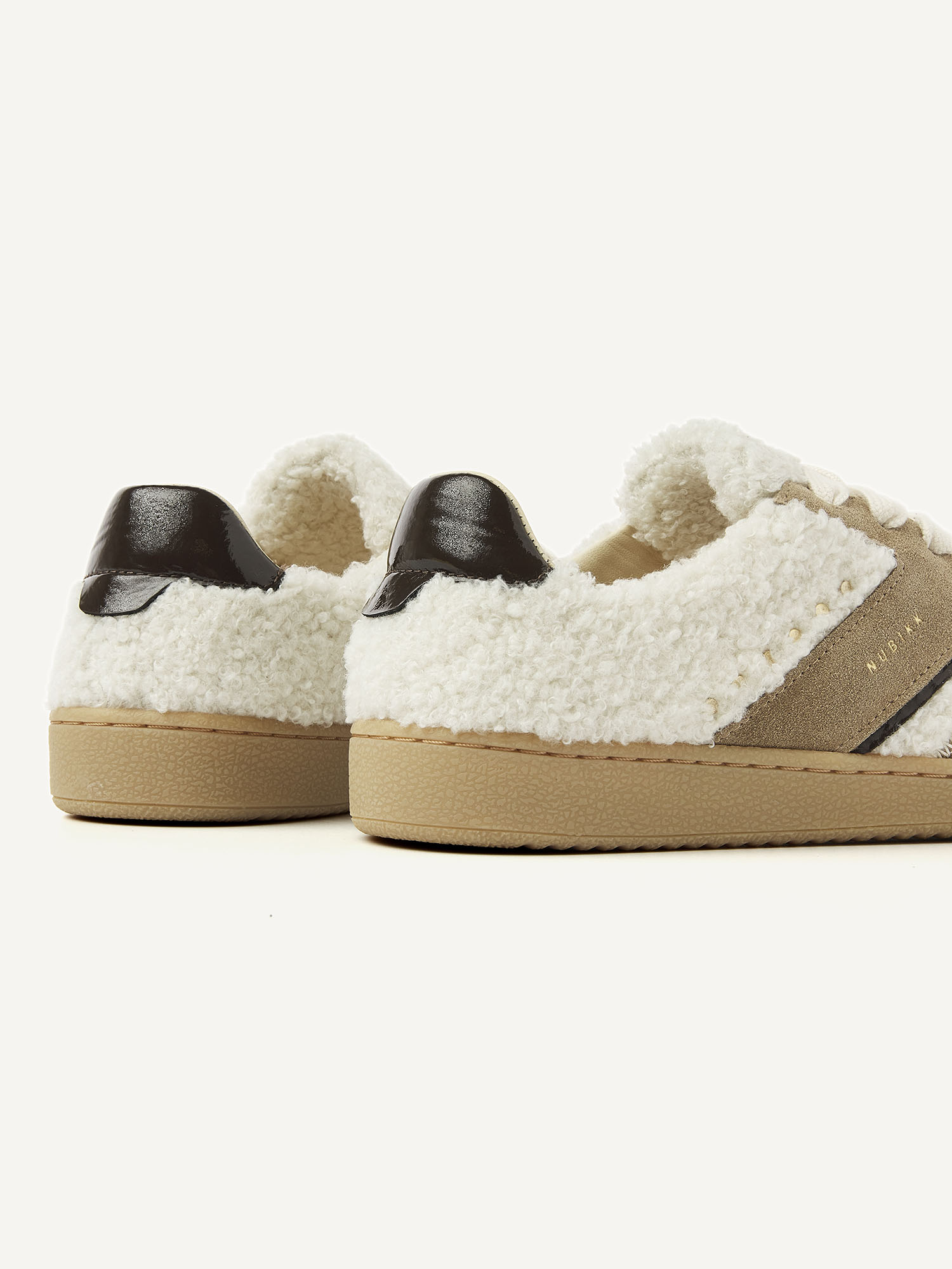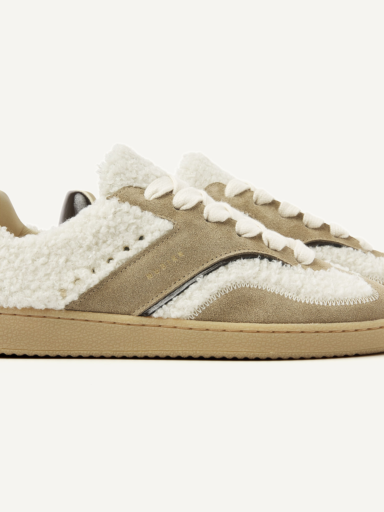Textured neutrals. De Ray Owen Studs in taupe is een stijlvolle mix van zachte materialen en subtiele glans. De suède basis krijgt een speelse twist dankzij de fluffy textile overlays en glanzende patent accenten op de hiel. De combinatie van een leren voering bij de hiel en badstof aan de voorzijde zorgt voor comfort én luxe. Taupe-tonen brengen balans tussen laid-back en uitgesproken.