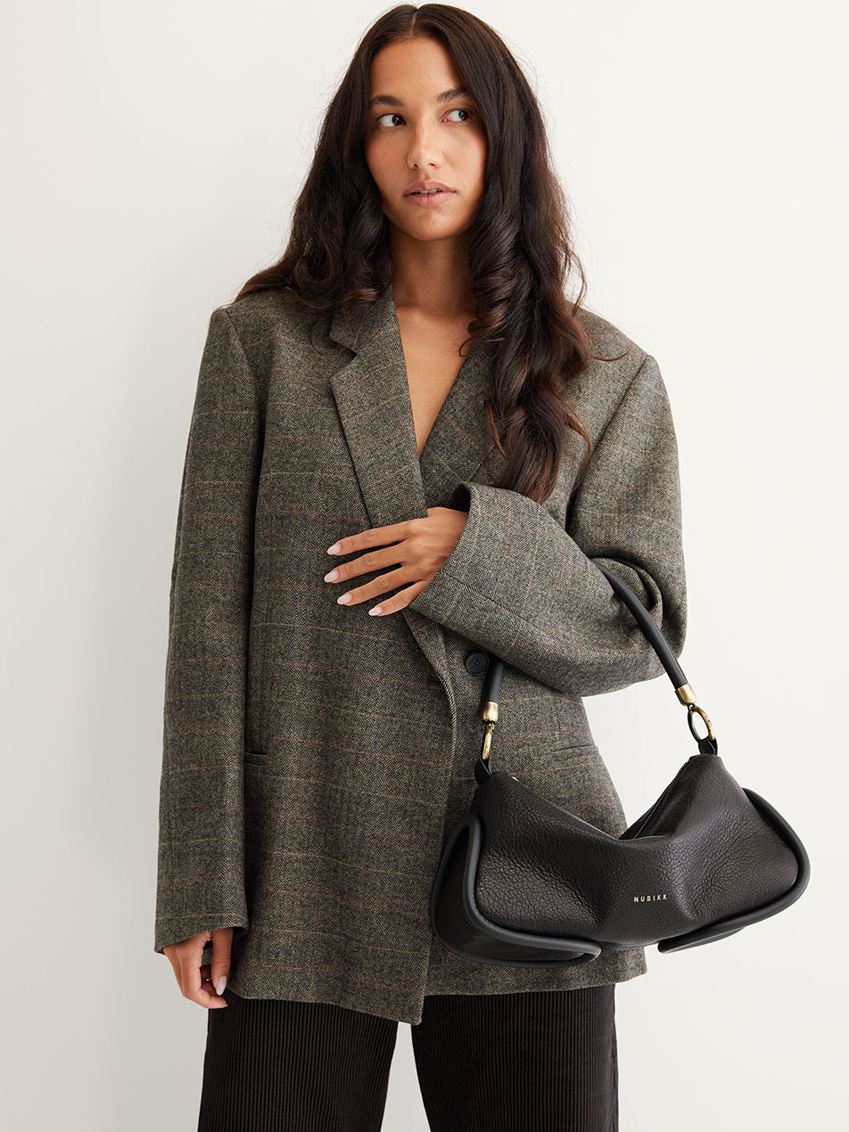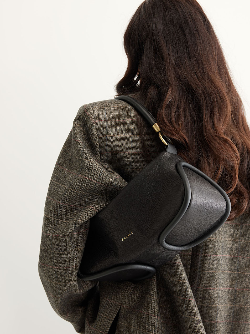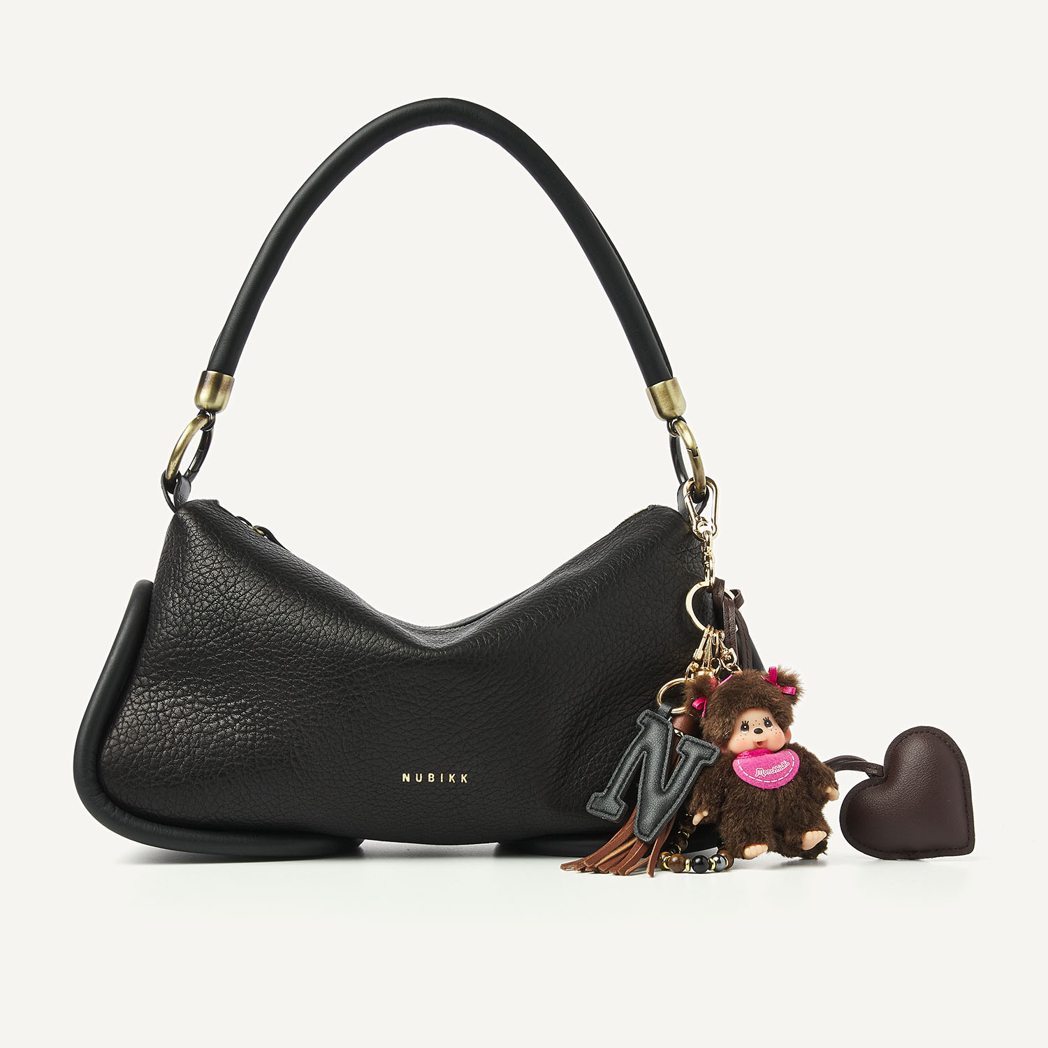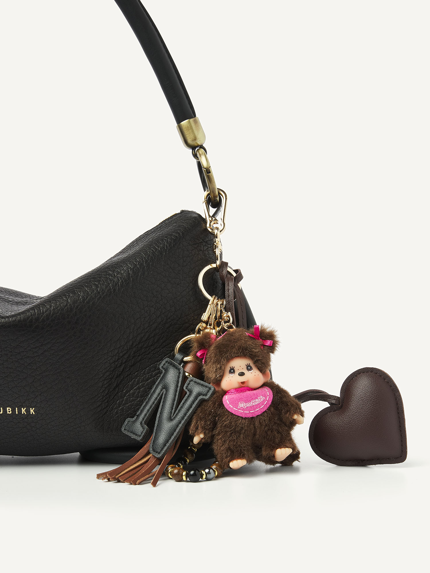 The Bibi Bag in black is a modern essential with a timeless look. The black grained material feels luxurious and moves smoothly, while the platinum hardware and leather tubes add refinement to the bag. Thanks to the detachable handles, you can wear the Bibi Bag in multiple ways: over the shoulder or crossbody. Inside, an extra pocket provides space for your daily essentials. The Monchhichi bag charm is not included, but available separately!