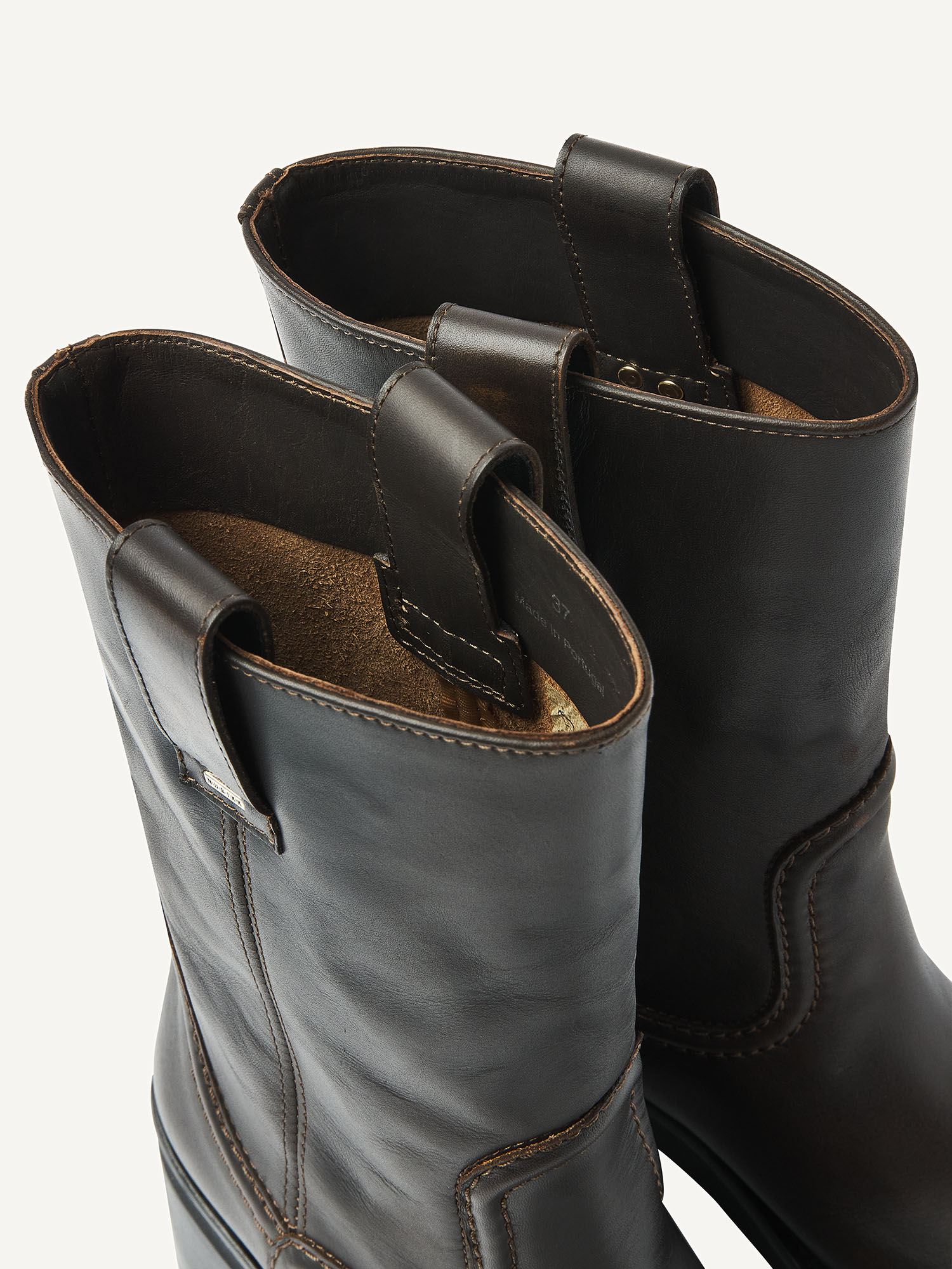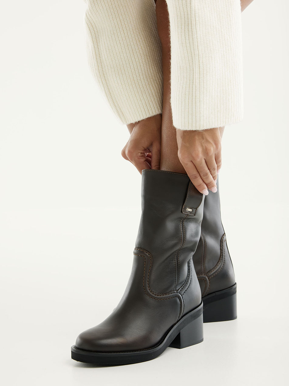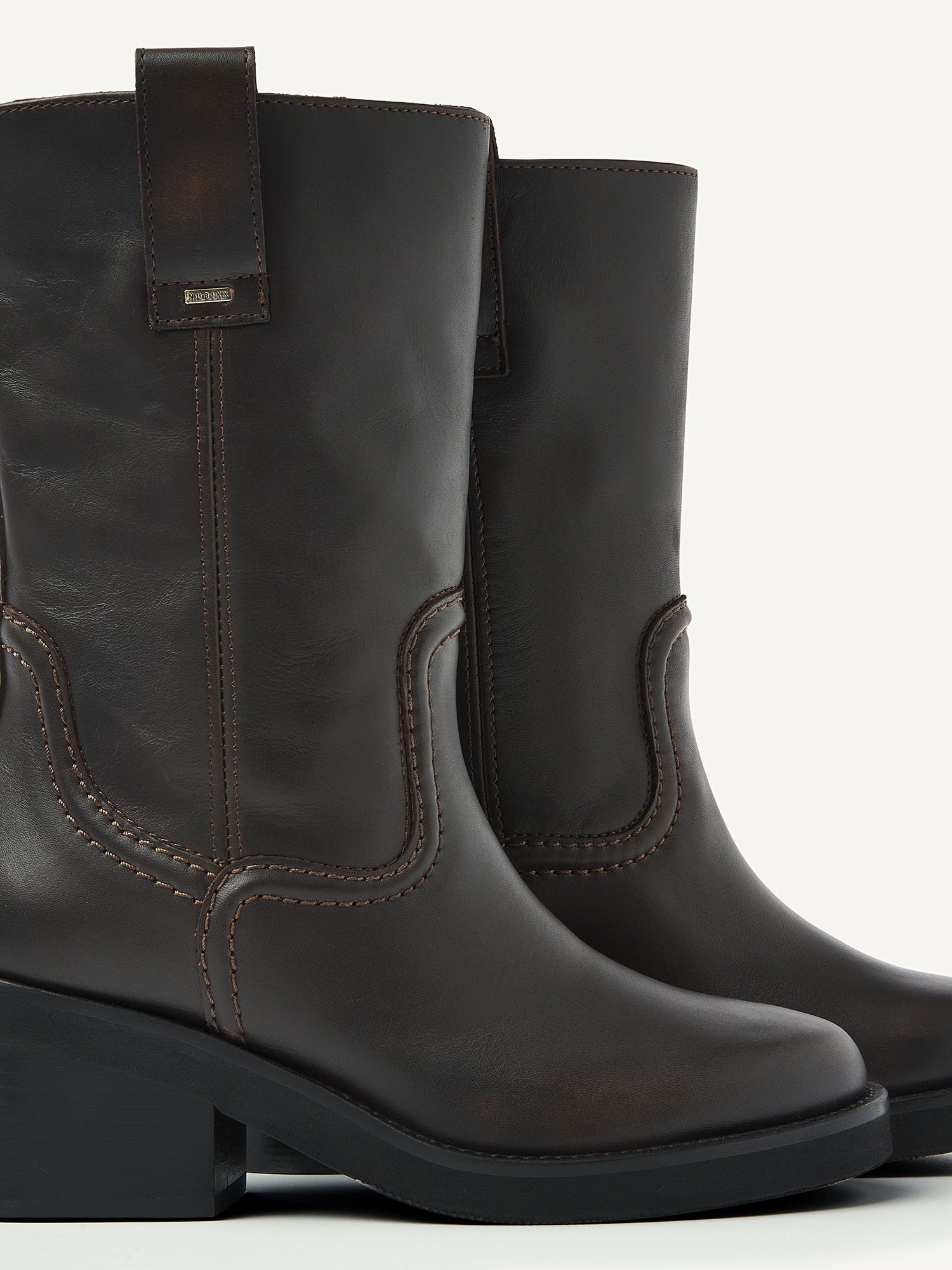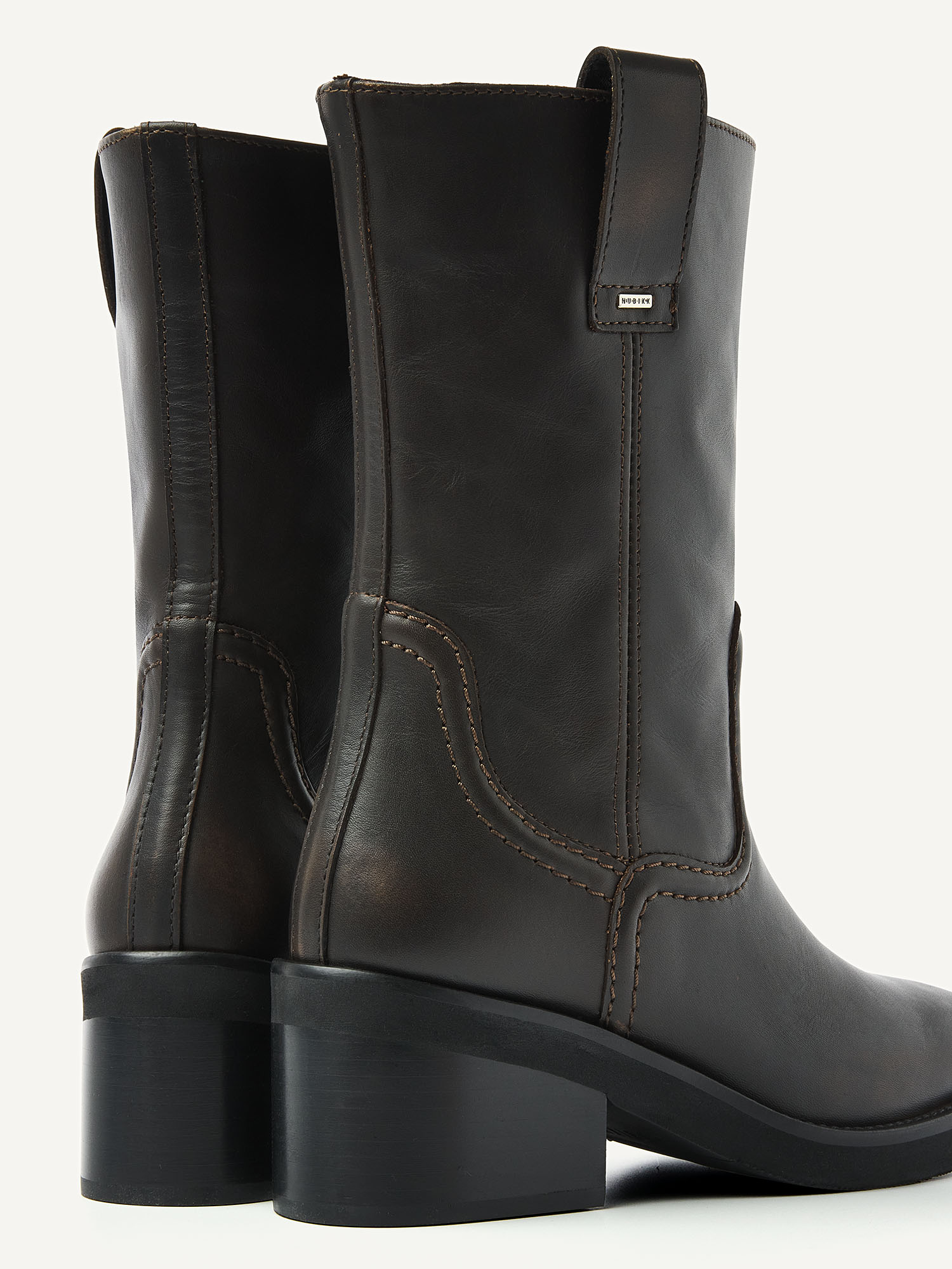 Embrace a touch of western chic with the Cassy Slouch in brown leather. Designed with branded pullers for easy on and off, these boots combine style and functionality. The leather stacked heel paired with an EVA lightweight sole ensures maximum comfort and effortless walking. Unlike typical western boots, our EVA sole provides a lightweight experience. The outsole features a traditional welt, and the upper includes classic details such as a round toe, back seam, and riding stitch design. These versatile boots are perfect for year-round styling.